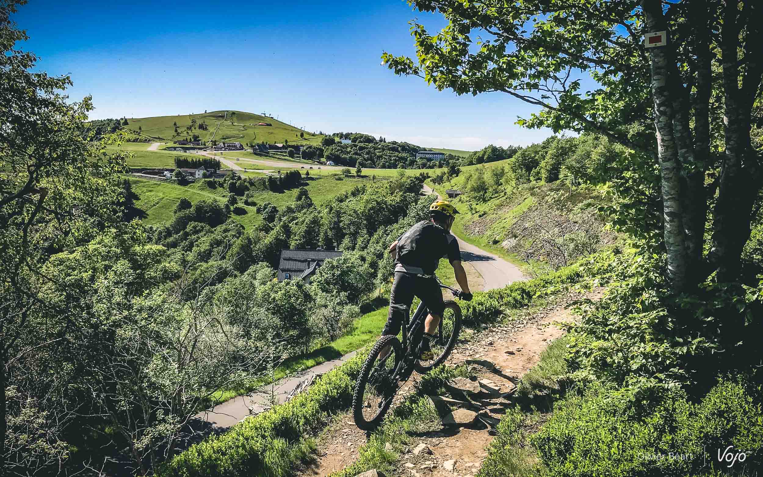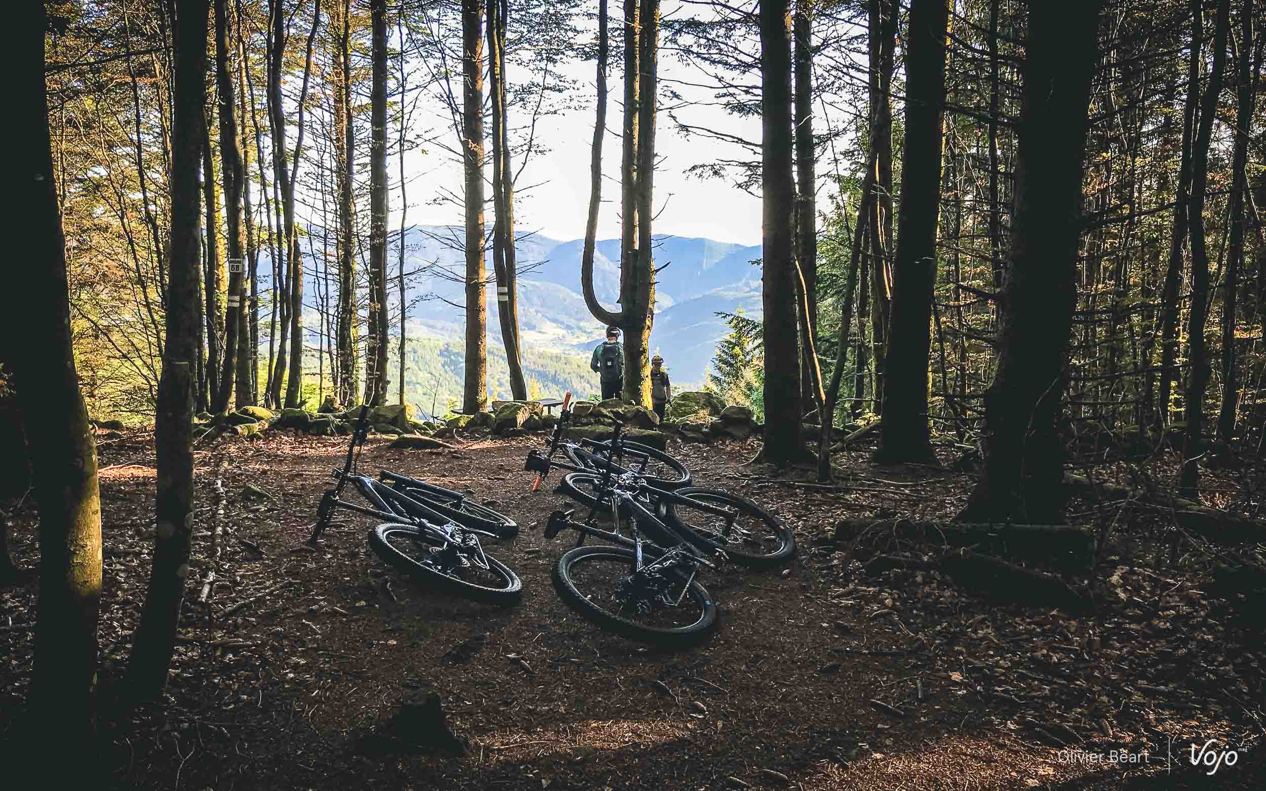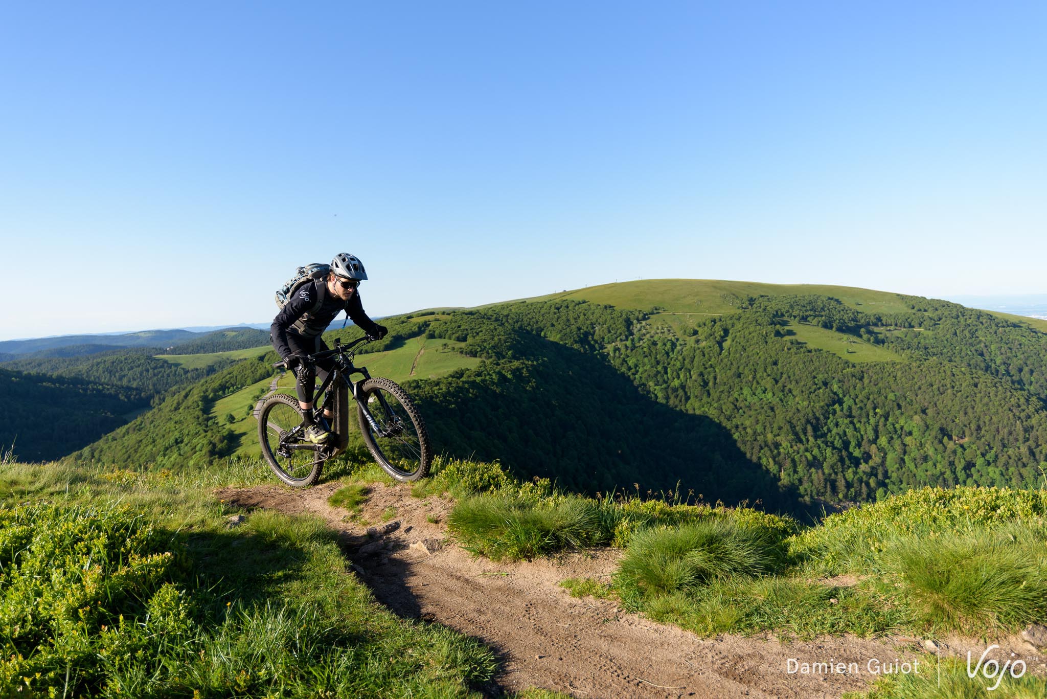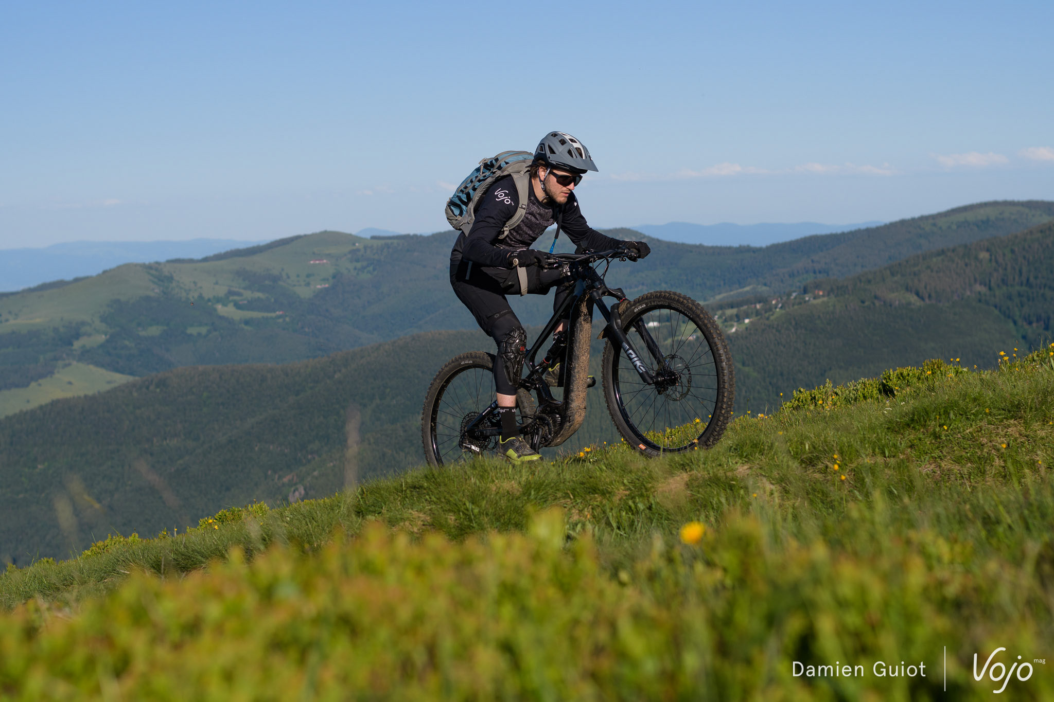 L’après-midi, le tracé est plus varié. On va encore monter en direction du point culminant de l’Alsace, le Grand Ballon, mais ce sera plus une alternance de petites montées et descentes et plus de flow que lors des premiers kilomètres le matin. On se permet donc de jouer davantage avec les modes supérieurs, dont l’eMTB.