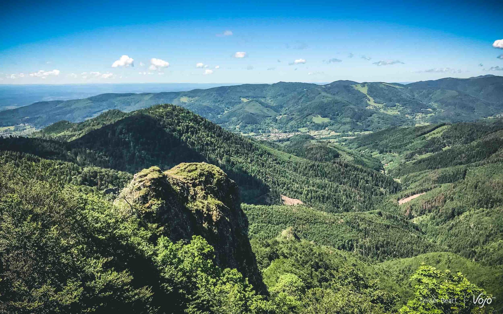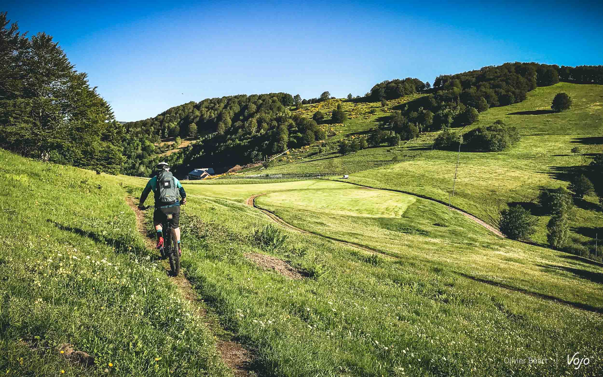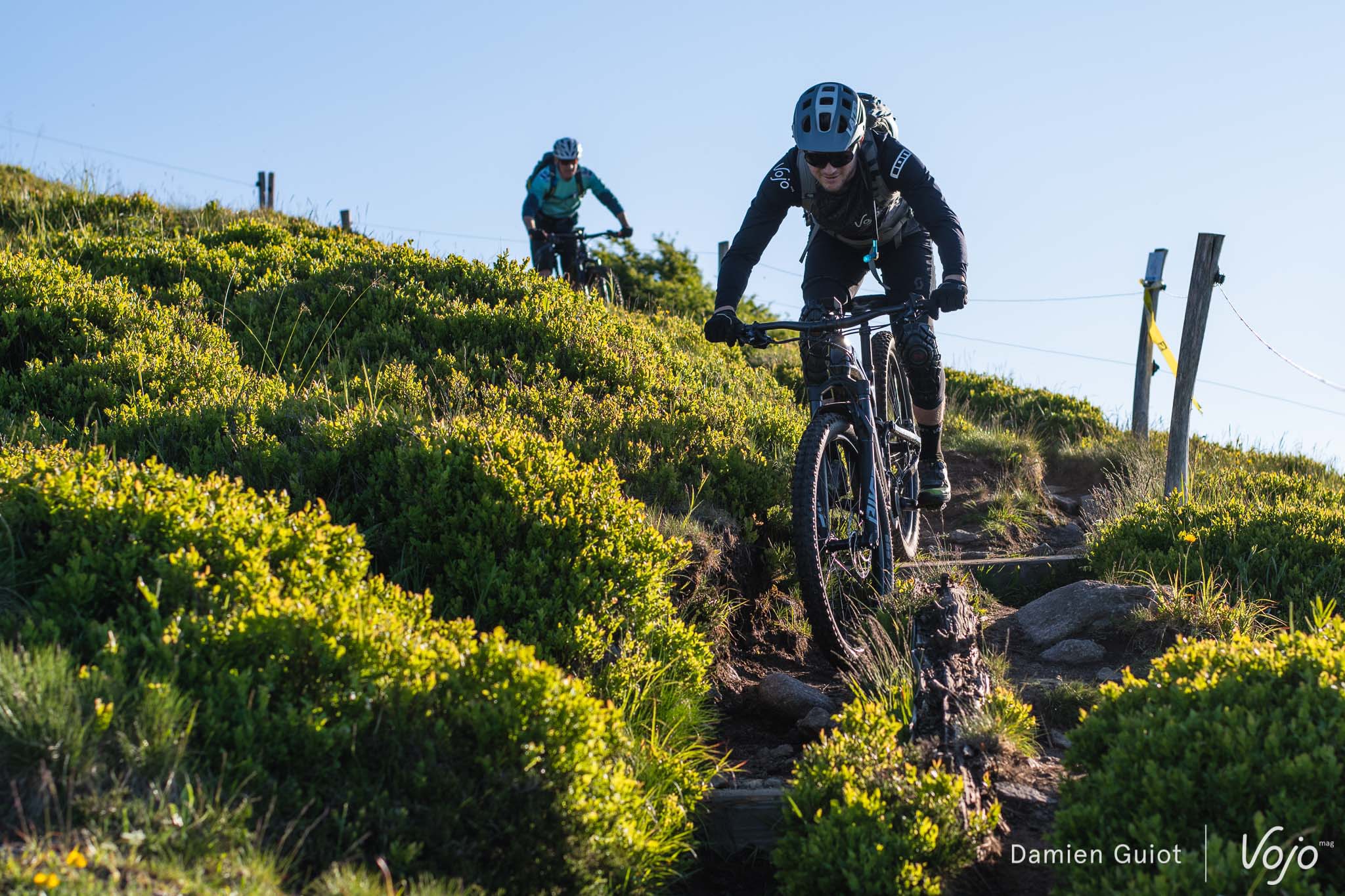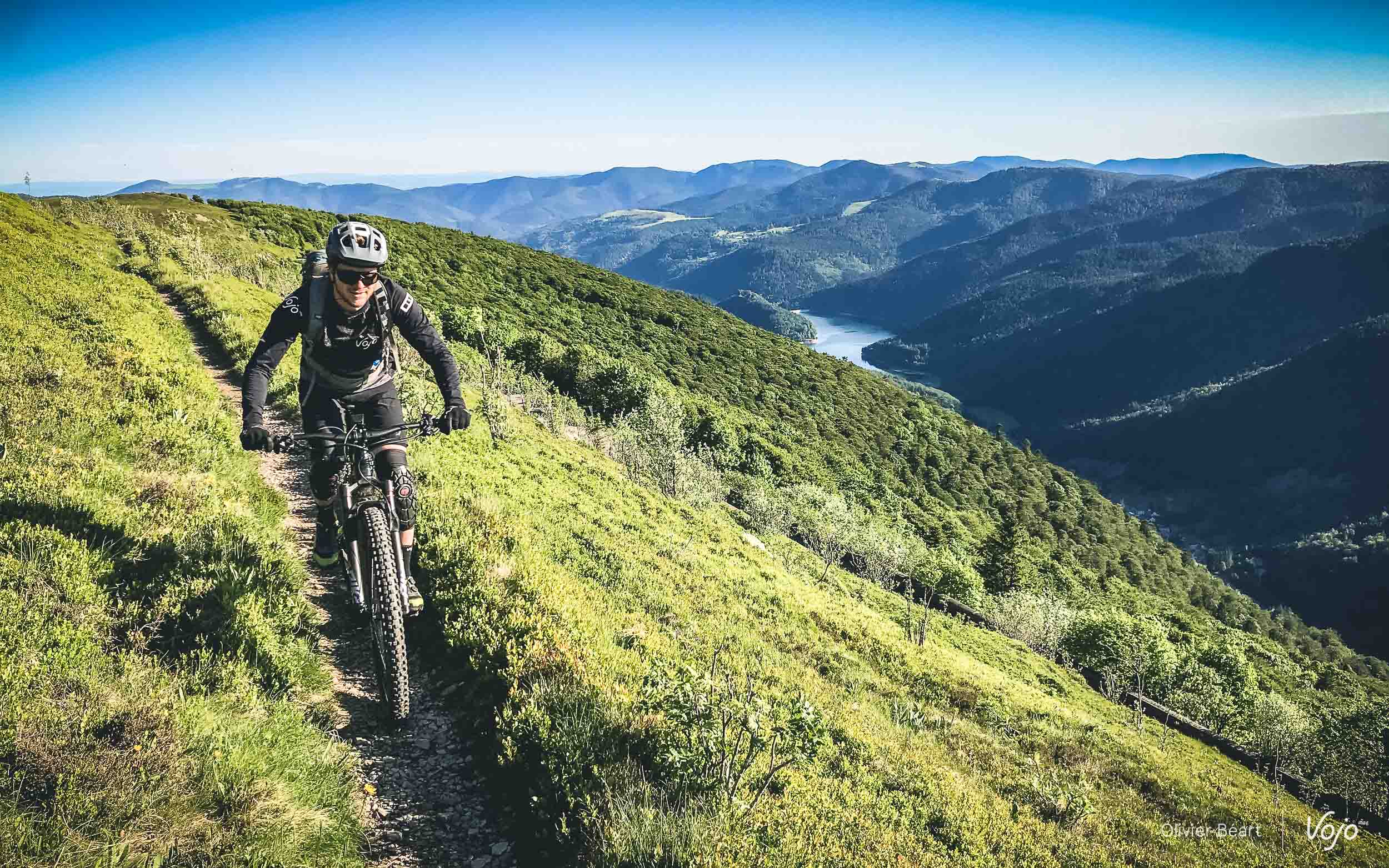 L’après-midi, le tracé est plus varié. On va encore monter en direction du point culminant de l’Alsace, le Grand Ballon, mais ce sera plus une alternance de petites montées et descentes et plus de flow que lors des premiers kilomètres le matin. On se permet donc de jouer davantage avec les modes supérieurs, dont l’eMTB.
