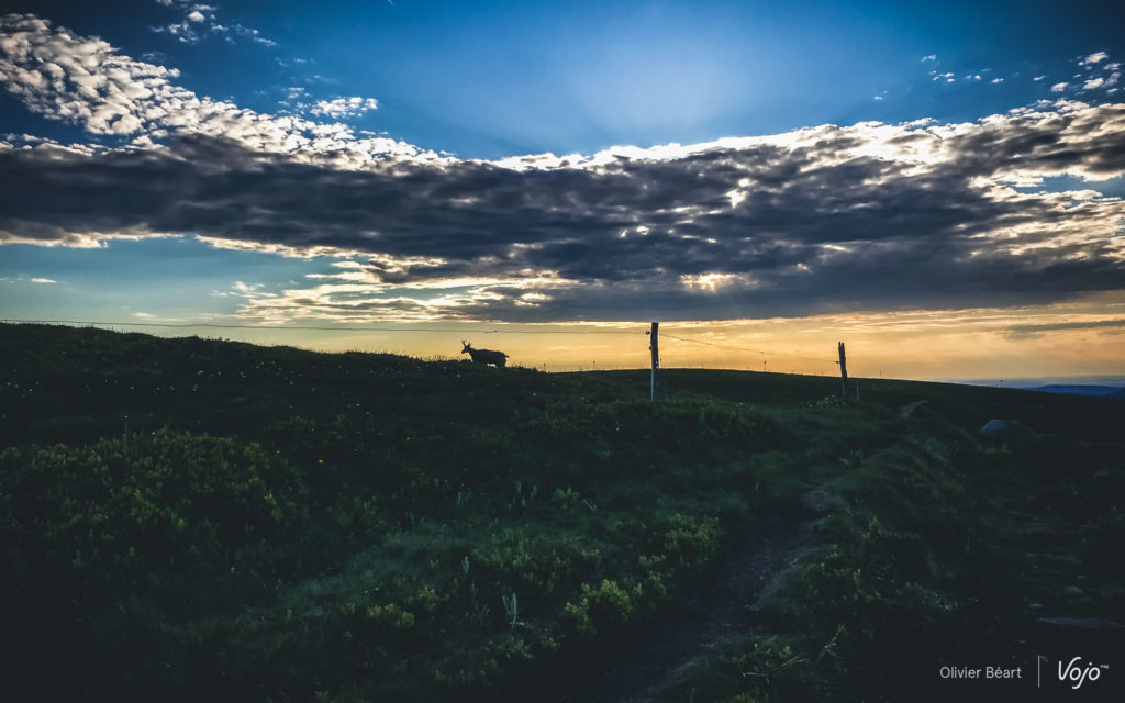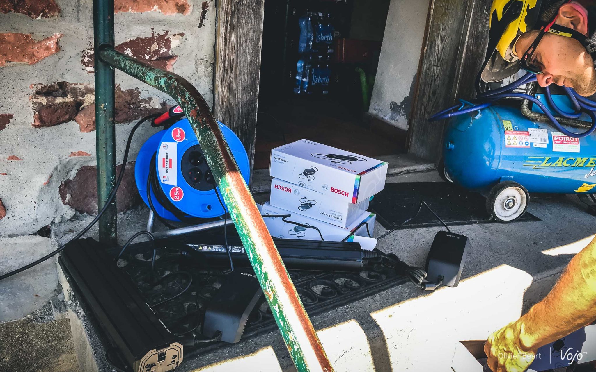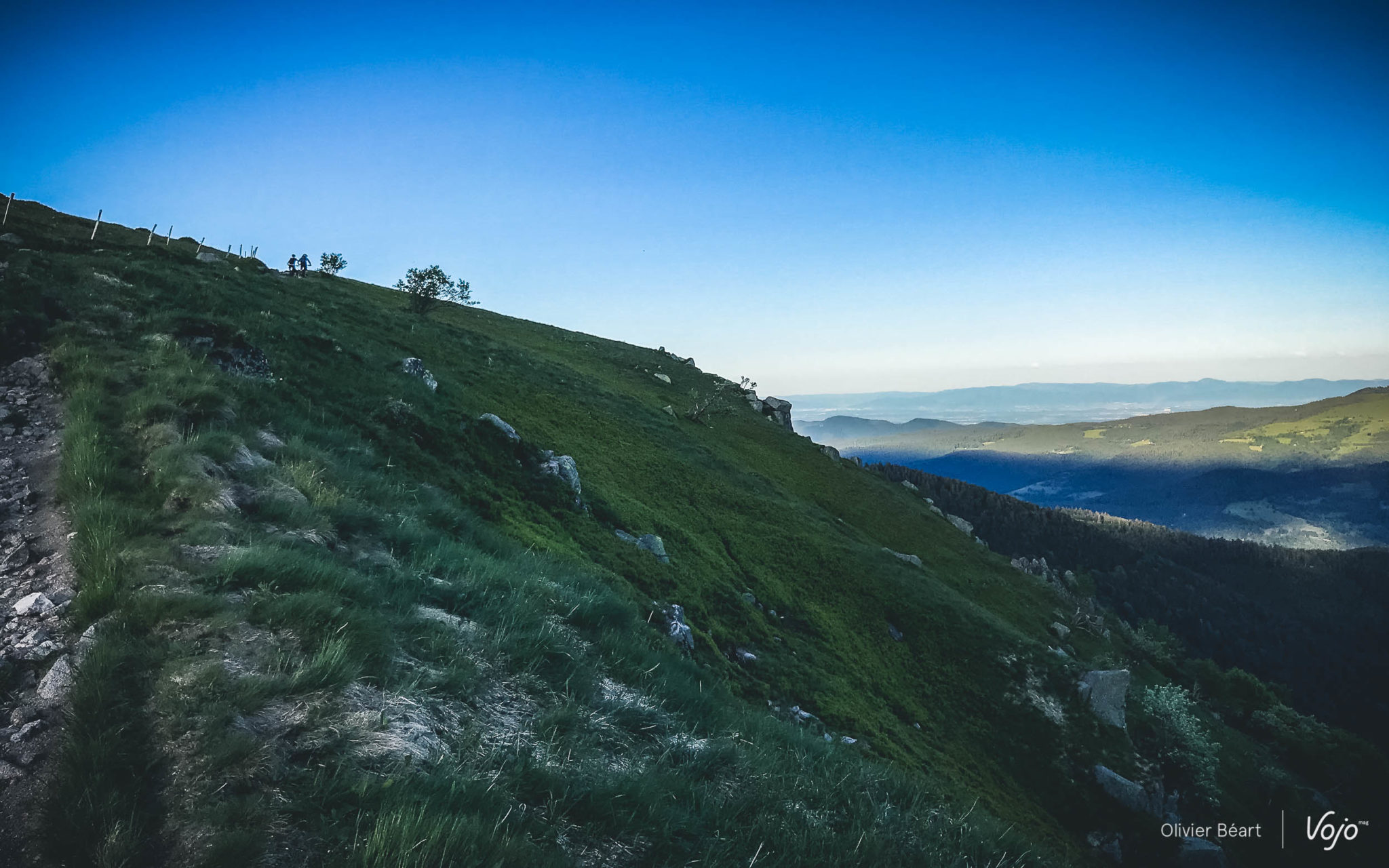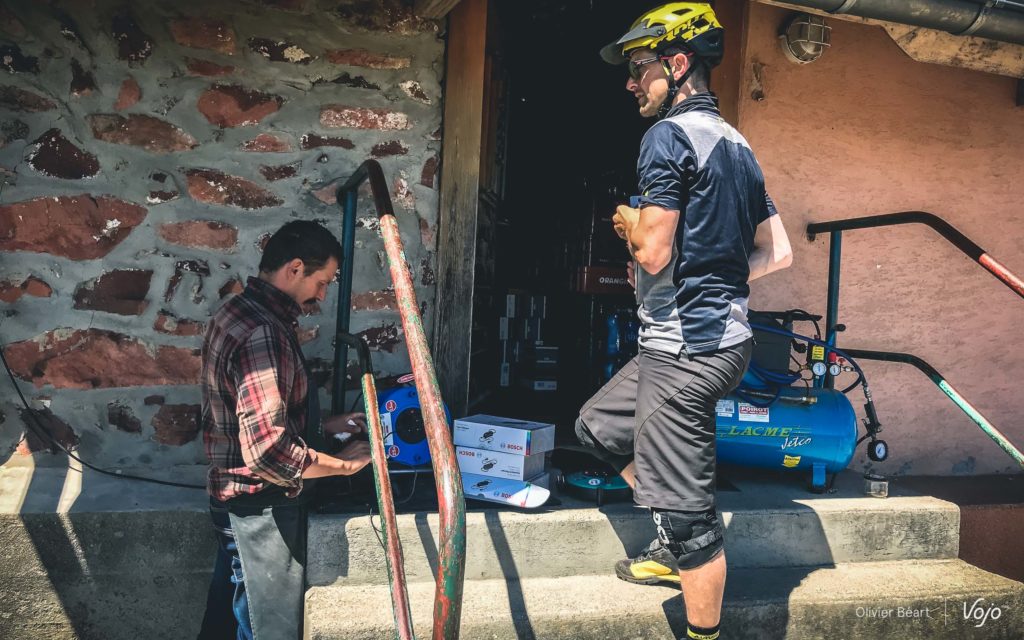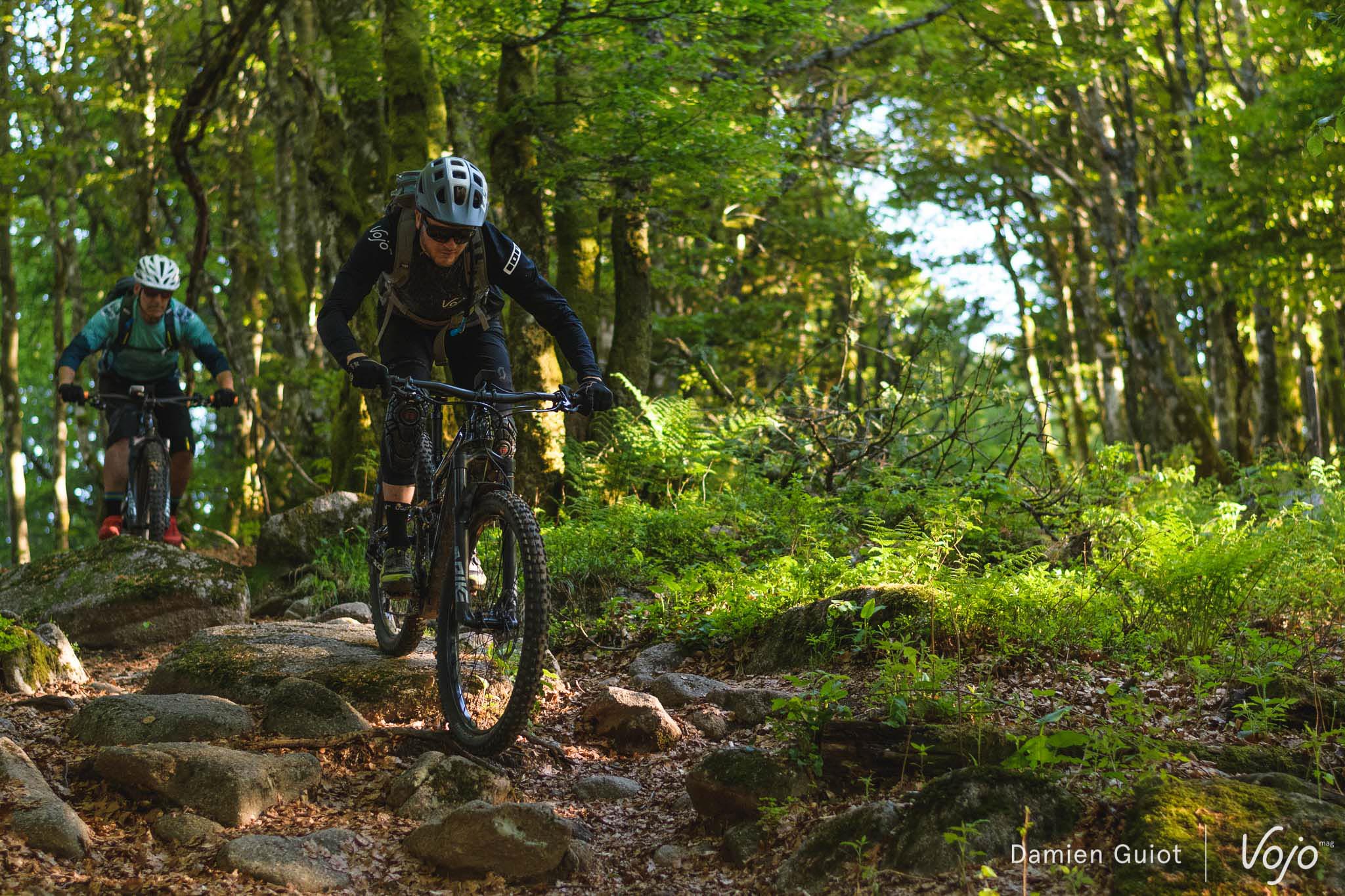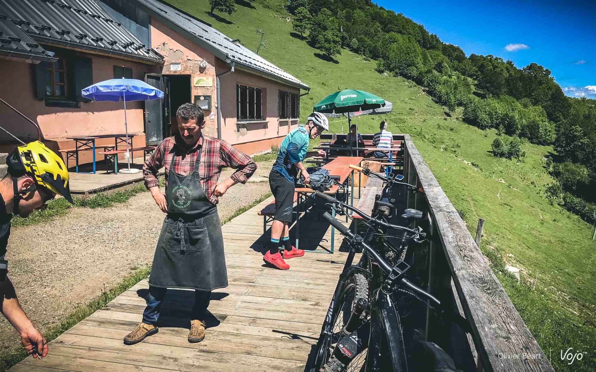 Nous démarrons notre périple de bon matin. A 6h30 nous attaquons la première grosse ascension. En gros, jusqu’à atteindre la ferme-auberge où nous mangerons, nous allons principalement grimper et jouer aux cabris sur un sentier très rocailleux. Pour ne rien vous cacher, le début a été difficile, mais pas à cause du moteur. Trouver le bon réglage de suspension arrière sur notre vélo de test n’a pas été facile, surtout avec le poids du sac à dos contenant la batterie.