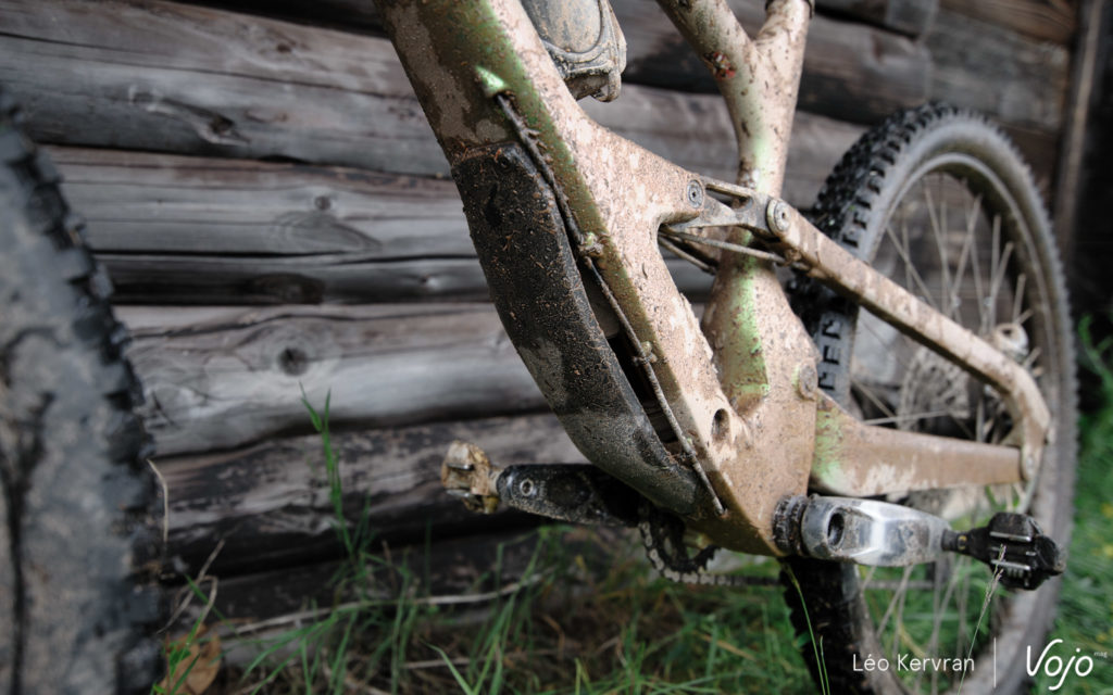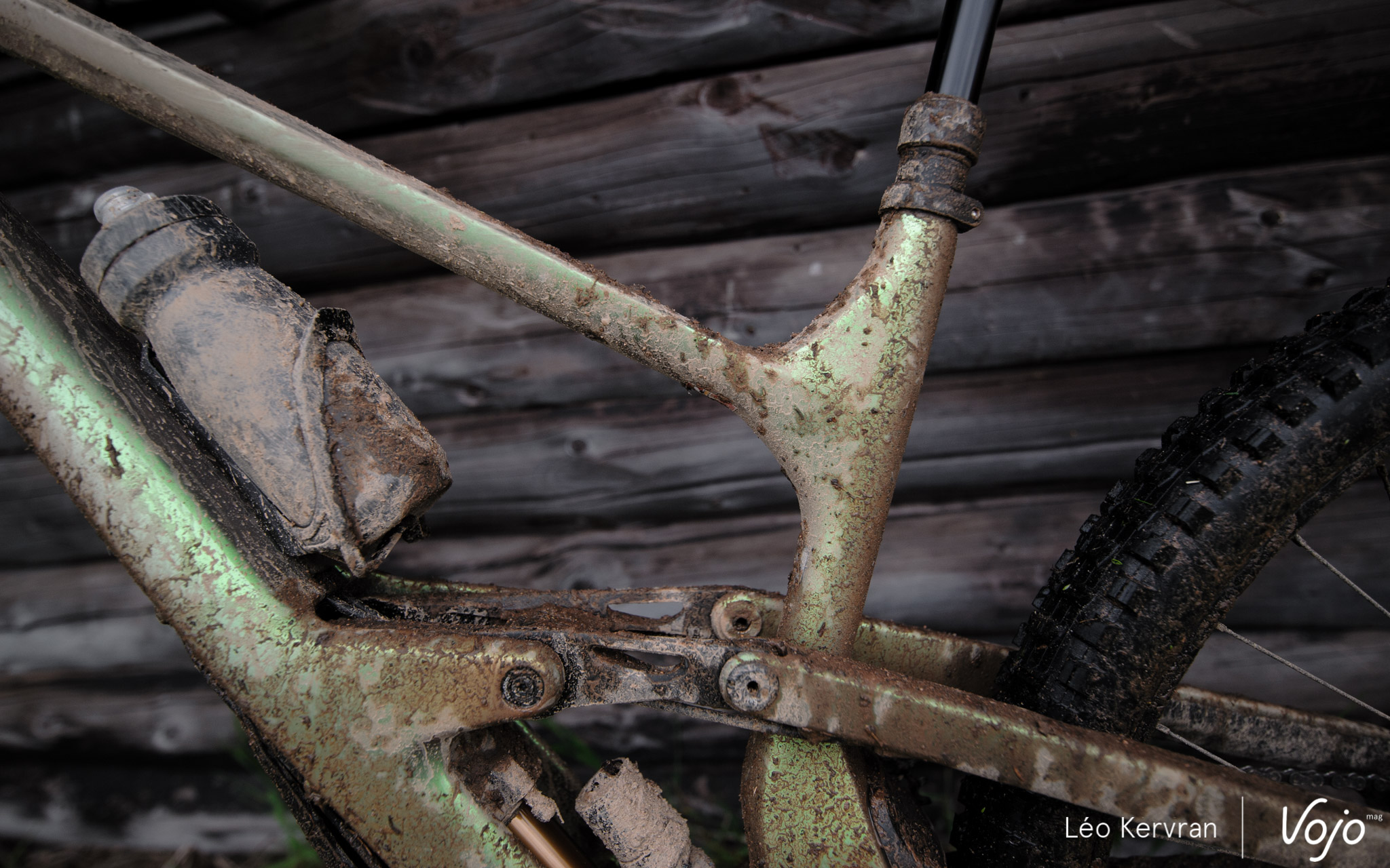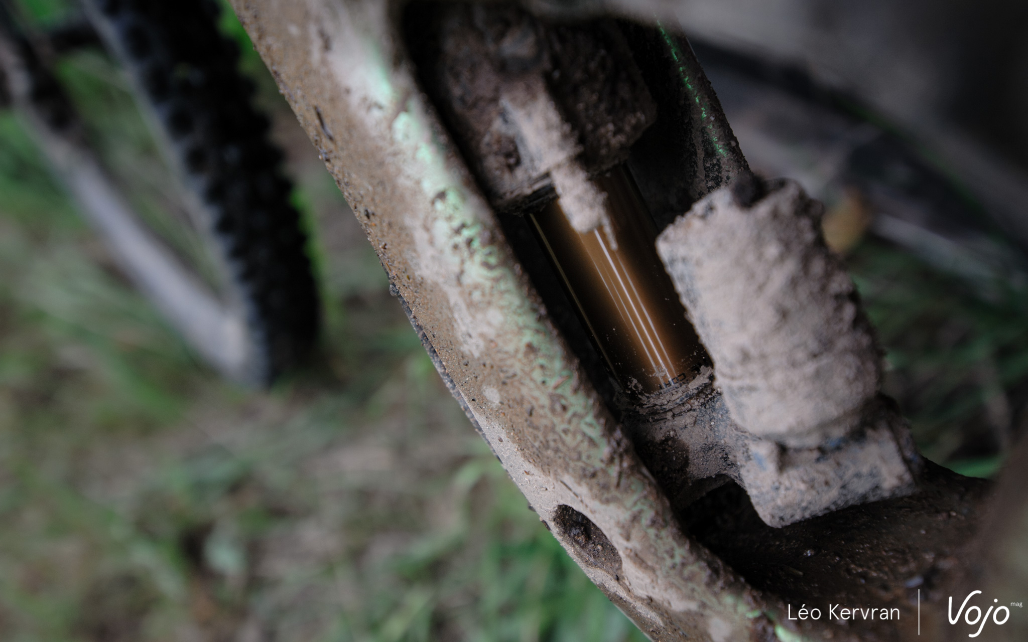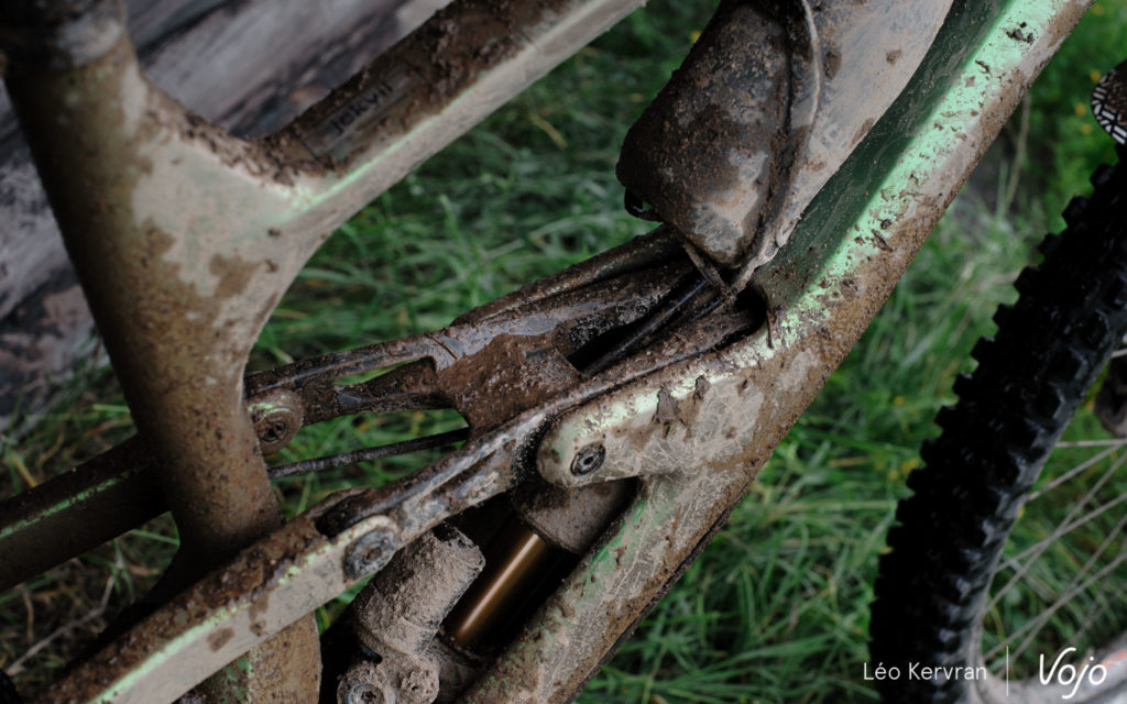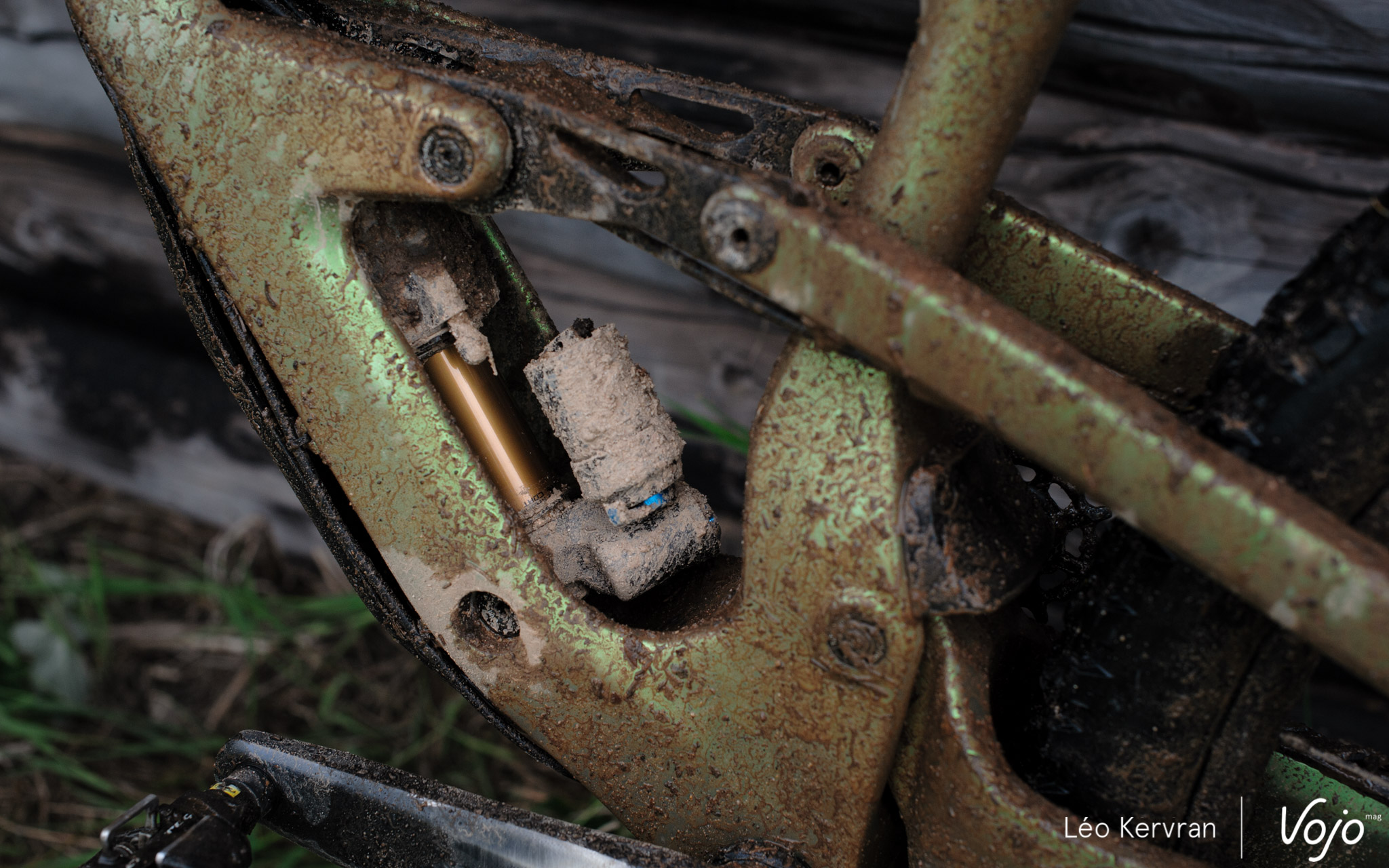 Et la Gravity Cavity alors ? Les photos « statiques » qui illustrent le début de l’article ont été prises à la fin de cette journée et comme vous pouvez le constater, le vélo n’a rien stocké sous l’amortisseur. Bien sûr, tout est recouvert de cette boue sablonneuse typique de la région mais nous n’avons pas eu l’impression que c’était très différent de ce qu’on aurait pu avoir avec un autre vélo à la construction plus classique.