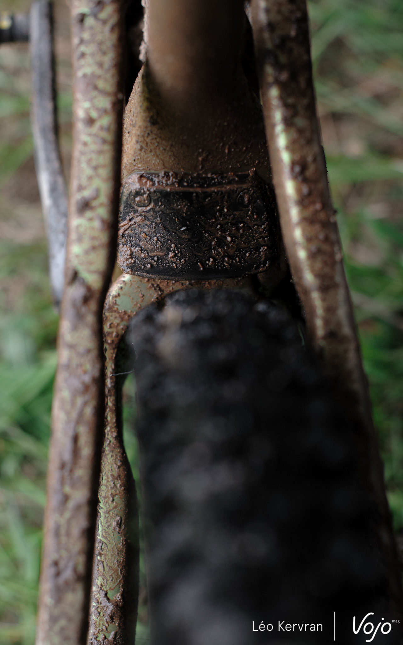 Cette zone est protégée par une grande pièce en plastique de belle facture, solidement vissée au cadre. Elle n’est pas plaquée contre le tube diagonal pour faciliter le nettoyage du vélo et éviter tout stockage de boue ou de poussière comme on peut le voir parfois.
