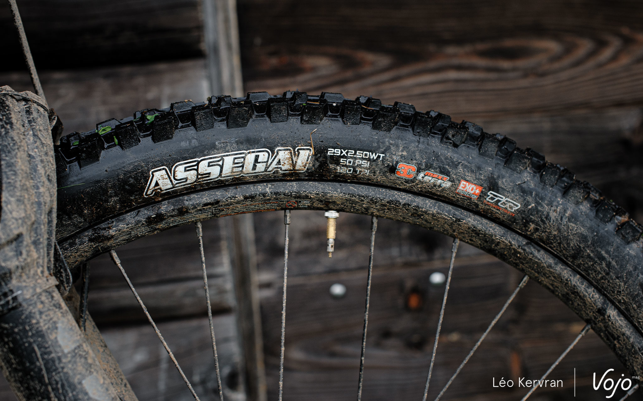 En revanche, le choix des pneus nous convient très bien puisqu’on a droit à un combo Maxxis Assegai 2.5 (AV) / DHR II 2.4 (AR), tous deux en carcasse EXO+.
