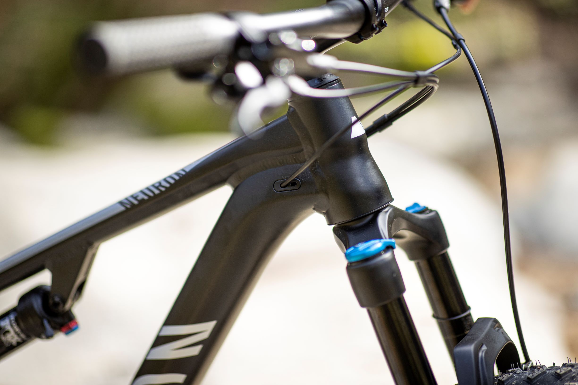 Le Neuron AL se passe cependant de quelques raffinements présents chez son grand frère en carbone, comme le jeu de direction avec butées qui protège le tube diagonal du cintre en cas de chute ou le passage « semi-internes » de gaines le long du tube diagonal, dans une petite coque démontable qui fait également office de protection pour le cadre. Ici, on a droit à des passages internes classiques mais tout de même étudiés pour réduire les frictions et optimiser les trajets des câbles, le tout dans des tubes en mousse pour éviter les bruits indésirables.