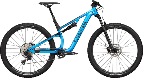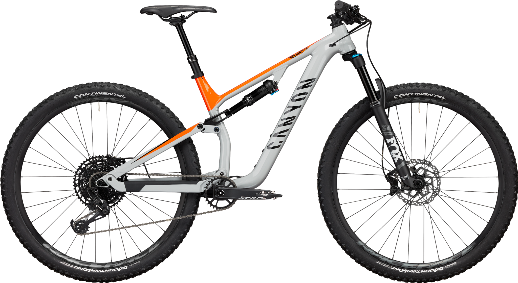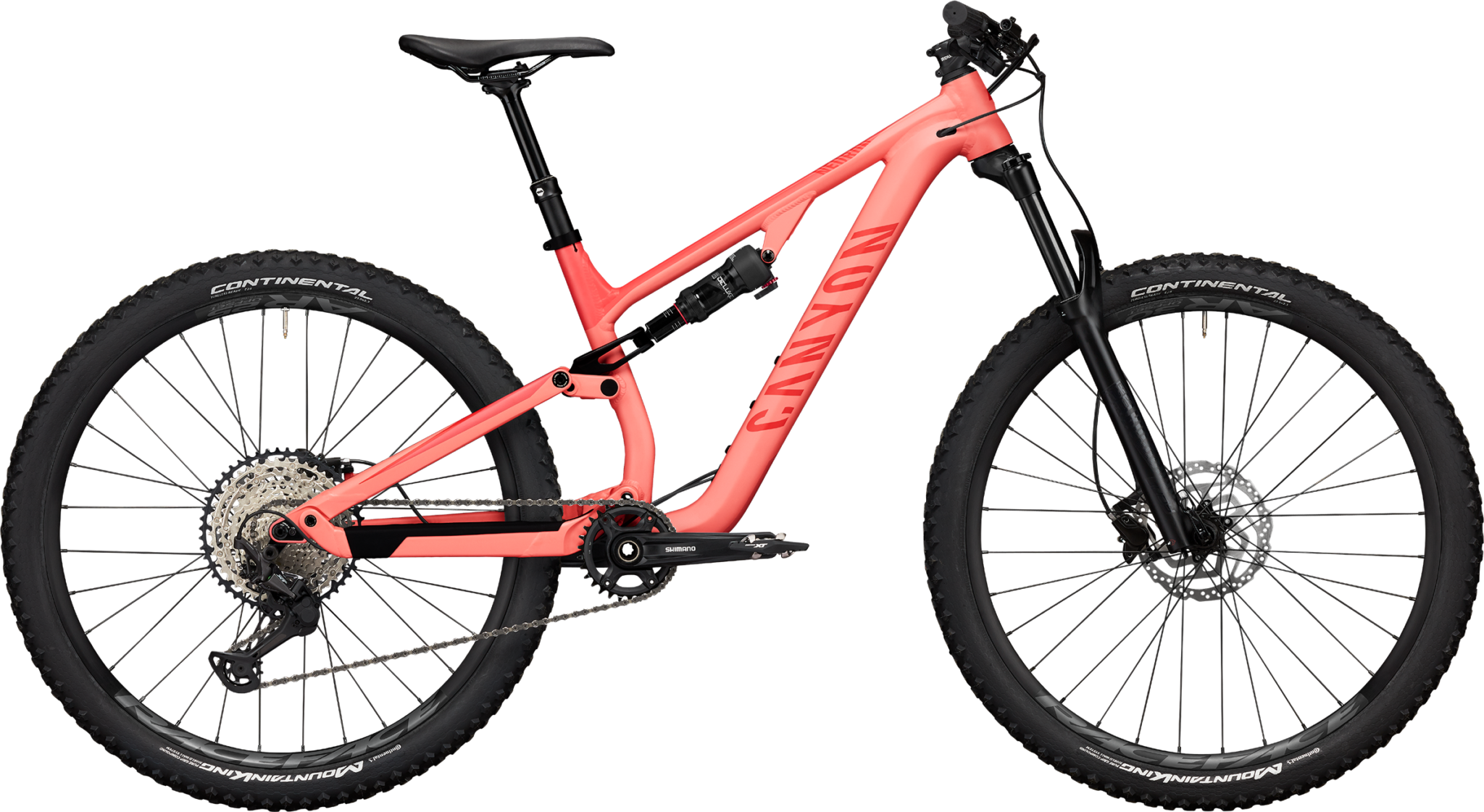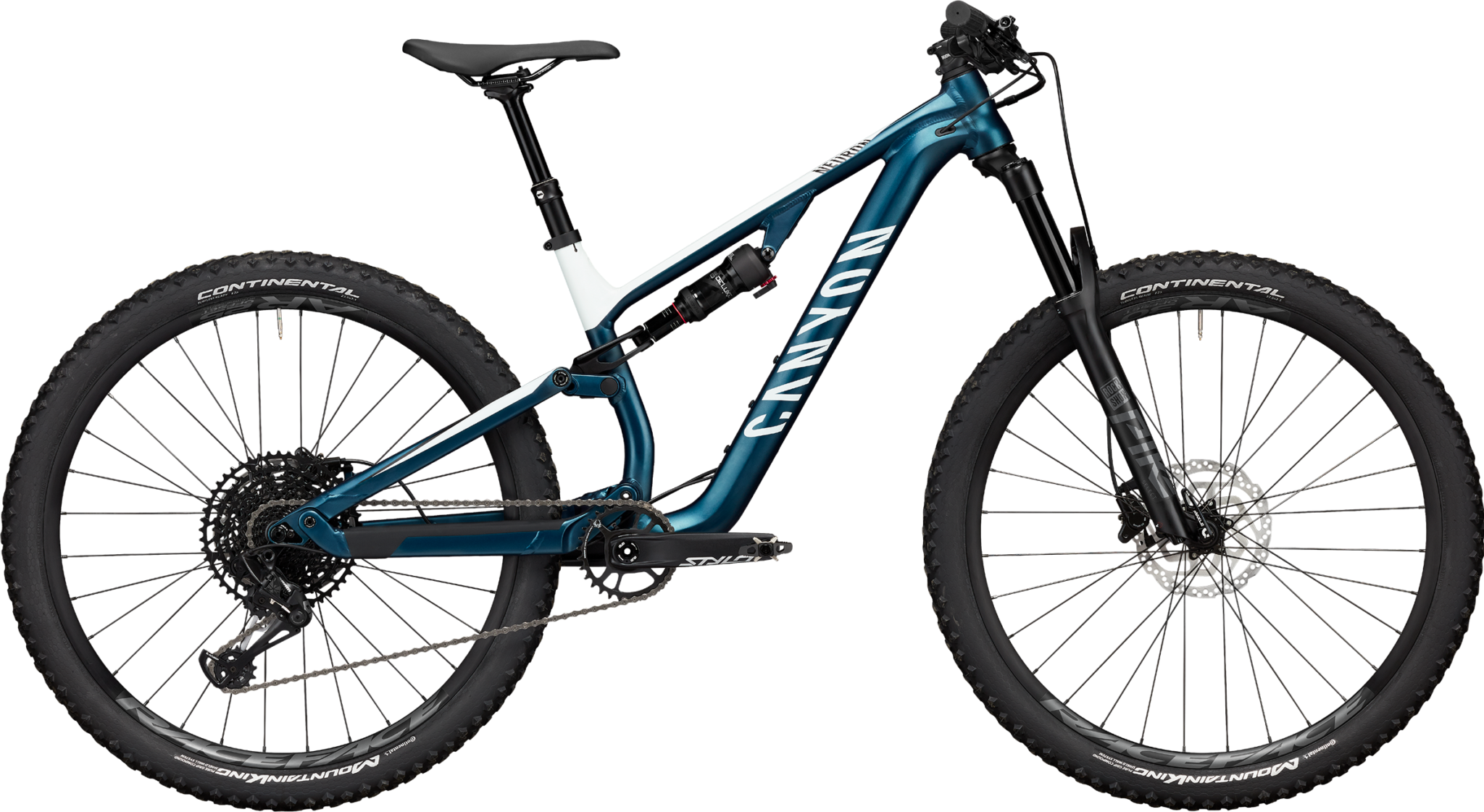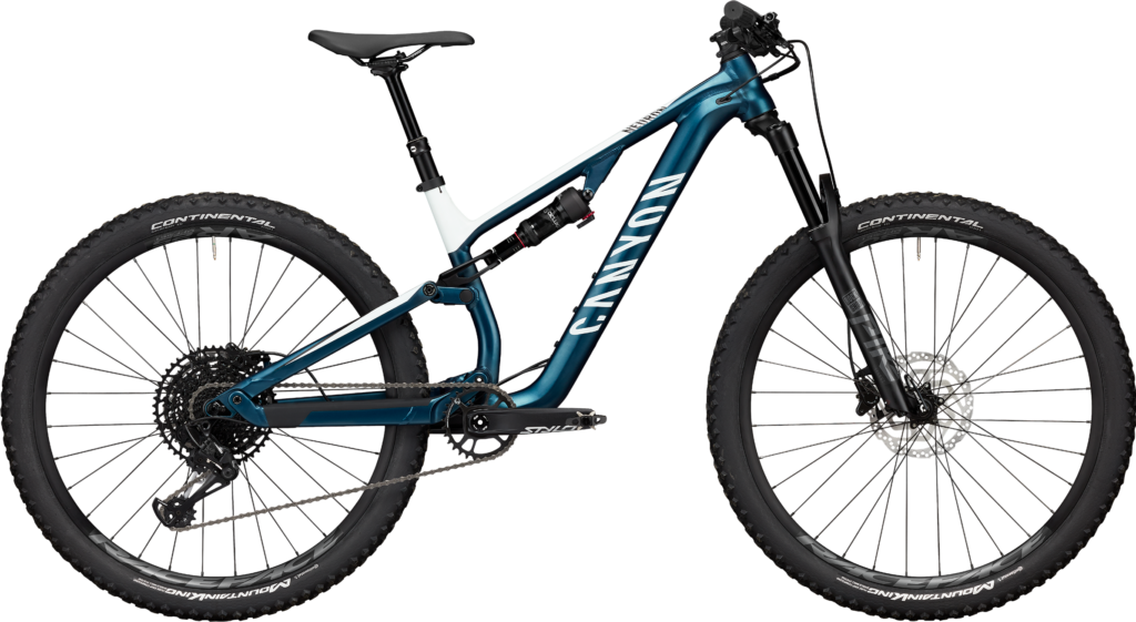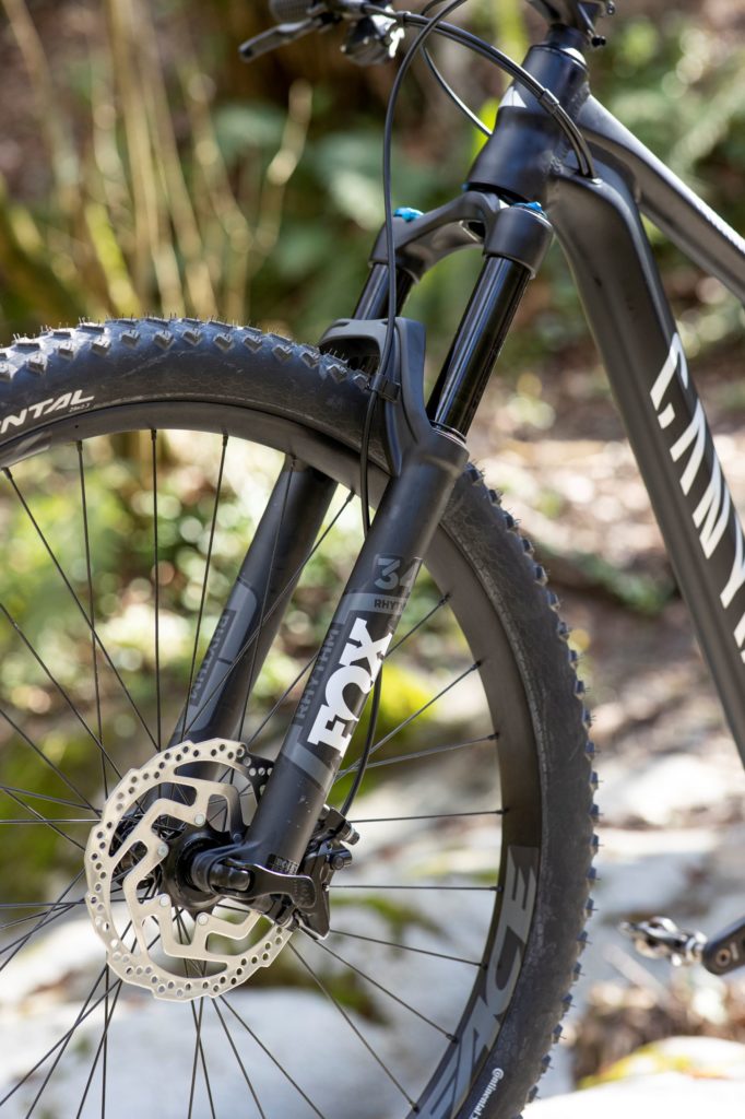En parlant de roues, Canyon a fait le choix peu courant mais intéressant de proposer des largeurs de jantes différentes à l’avant et l’arrière. On retrouve ainsi une jante de 30 mm de largeur interne devant, tandis que c’est une 25 mm qui prend place derrière. L’idée est d’avoir un bon grip à l’avant en laissant le pneu (un Continental Mountain King en 2.3) travailler au mieux tout en gagnant un peu de poids et de dynamisme derrière avec une jante un peu plus légère. A noter que c’est une idée qui était déjà présente sur le précédente Neuron AL, et qu’on retrouve aussi par exemple dans la gamme du fabricant de roues français Duke avec le concept « 6Ters ».