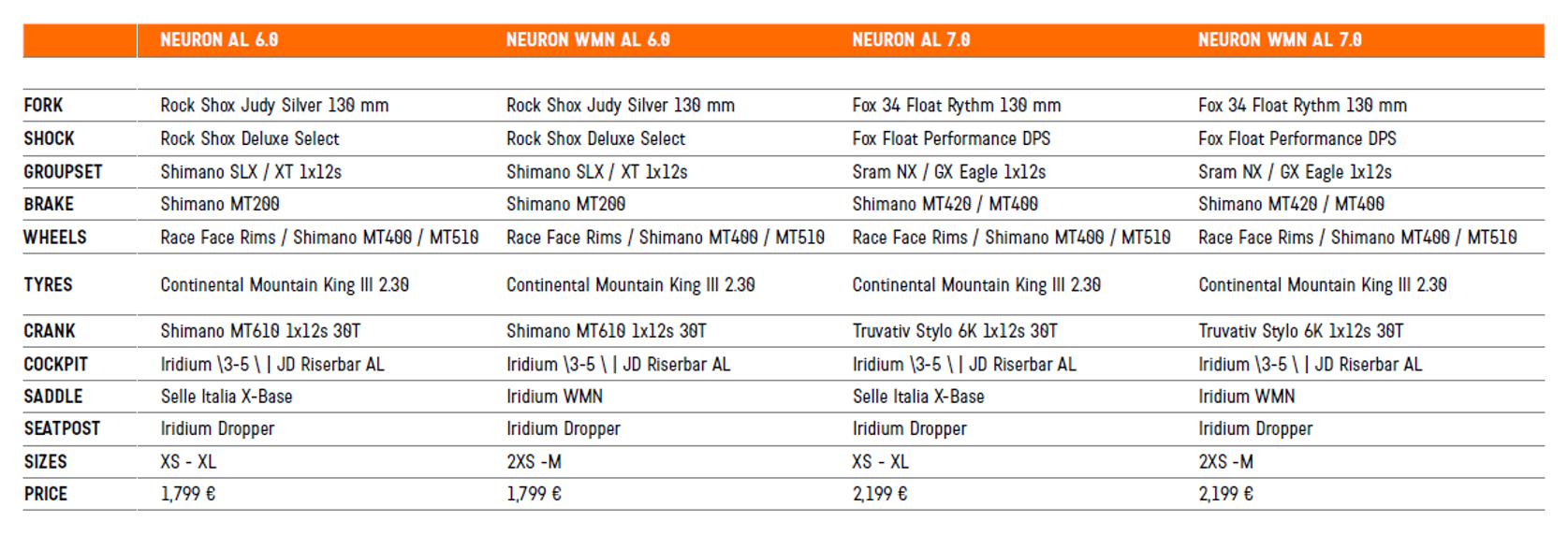 Notre modèle d’essai est le Neuron AL 7.0, le plus haut de gamme de la famille avec comme principales caractéristiques une transmission Sram avec un mélange de NX Eagle (shifter, cassette) et GX Eagle (dérailleur), une fourche Fox 34 Rythm en cartouche Grip (plus simple que la Fit4 niveau réglages mais connue pour son onctuosité), couplée à un amortisseur Fox Float DPS et des freins Shimano MT420 à l’avant (4 pistons) et MT400 à l’arrière (2 pistons).