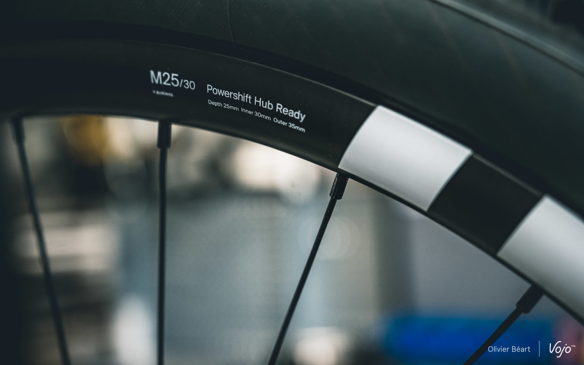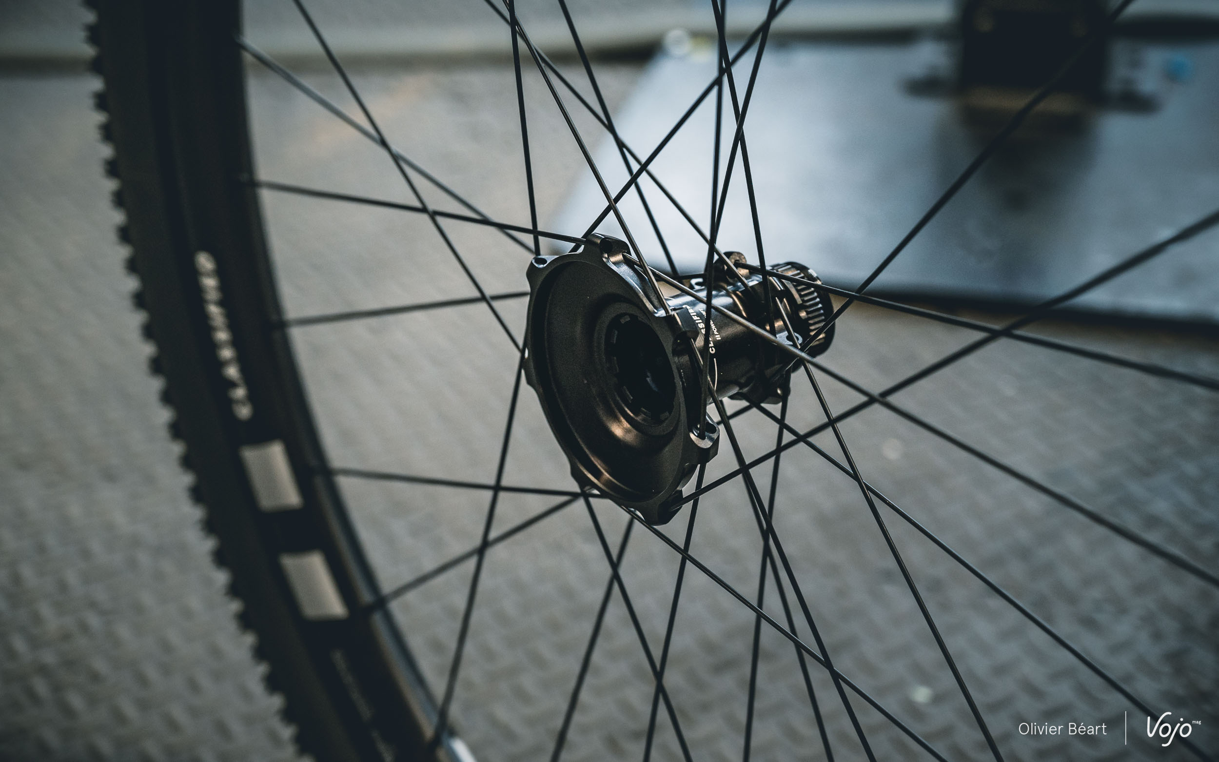 Impossible de passer à côté de l’espace qui est laissé du coté de la cassette afin d’accueillir le système Powershift. Rappelons que ce système n’est pas uniquement limité aux roues en provenance de chez Classified, mais est compatible avec d’autres marques avec lesquelles la marque anversoise collabore telles que Hunt, Mavic, DT Swiss… Il conviendra toutefois de vérifier, en fonction de votre pratique et du standard de votre cadre, si la marque en question propose déjà bien une paire de roues compatible. D’autres montages son possibles, notamment par des monteurs de roues indépendants, mais la marque veut savoir sur quelle jante son moyeu sera monté au préalable afin de s’assurer que les perçages de la jante sont compatibles avec la géométrie un peu particulière de son moyeu.