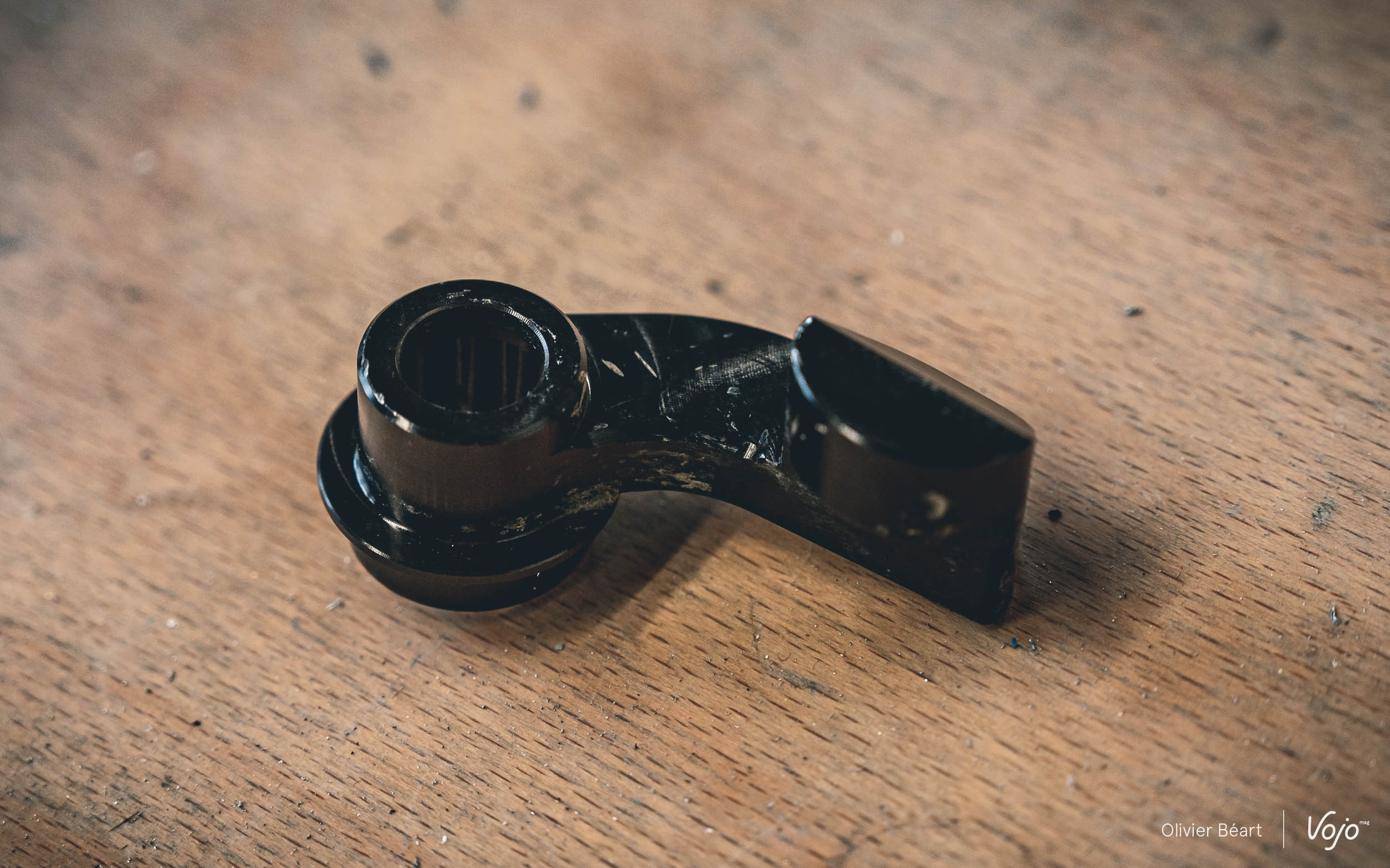Cela est notamment vrai au niveau de l’axe traversant dit « intelligent » par la marque, et qui doit idéalement être orienté vers l’avant. Pourquoi ? Simplement car cet axe joue en réalité le rôle d’antenne qui permet de recevoir le signal en provenance du Ringshifter et de le transmettre ensuite au moyeu. Sur la photo la plus à droite, on remarque que notre mécanicien a rajouté une petite mousse noire au niveau du bas de notre basse arrière. Mais à quoi peut-elle bien servir ?