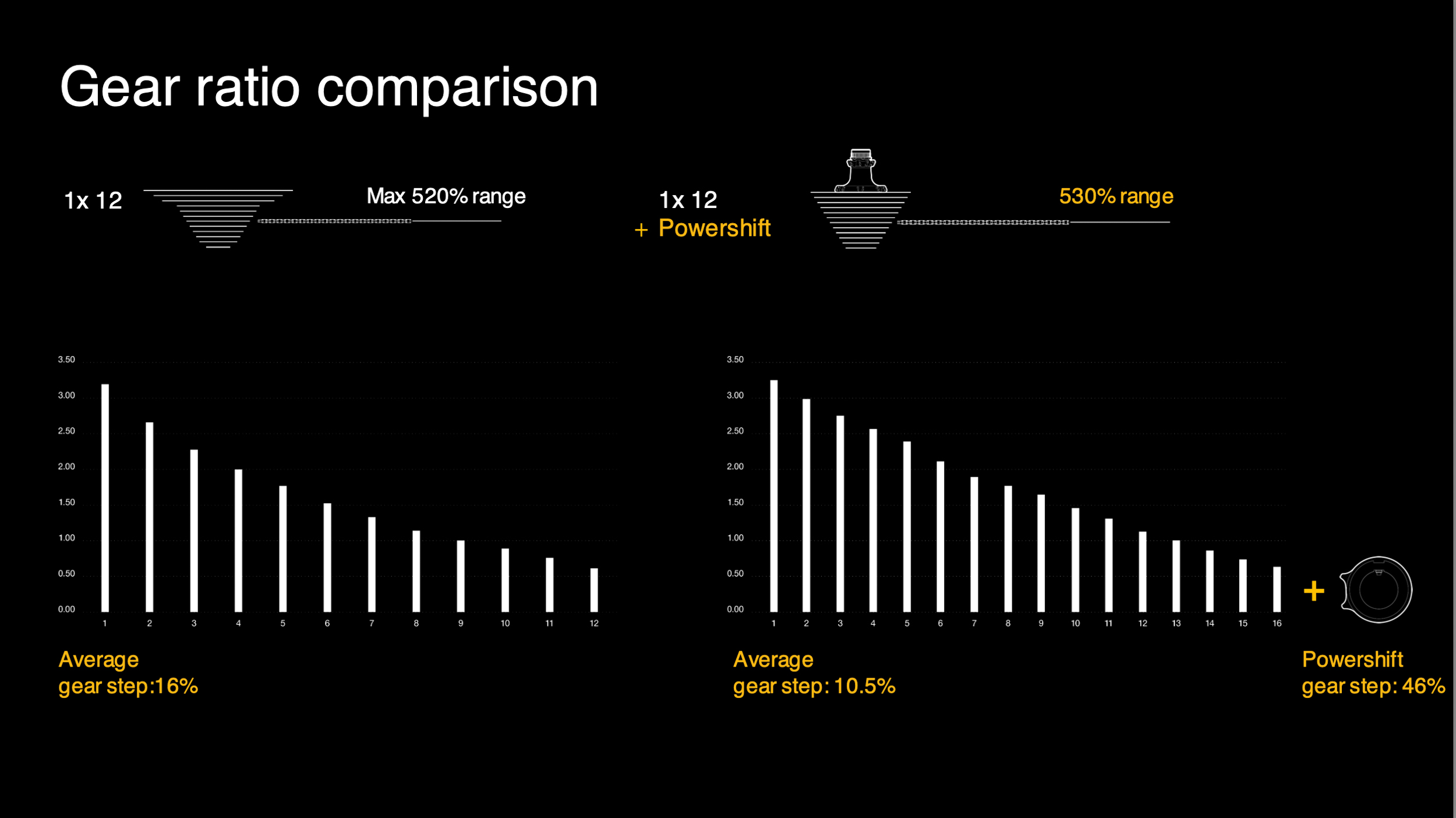 Bruno : « Si on prend une transmission classique en 1×12 vitesses, celle-ci offre un développement de 520% maximum, avec un écart moyen entre les vitesses de 16%. Sur une transmission équipée du système Powershift, le développement passe à 530% tandis que l’écart tombe à 10,5% . Plus de rapports (virtuellement 24 contre 12), moins d’écart entre eux et plus d’amplitude : voilà les atouts de notre système.