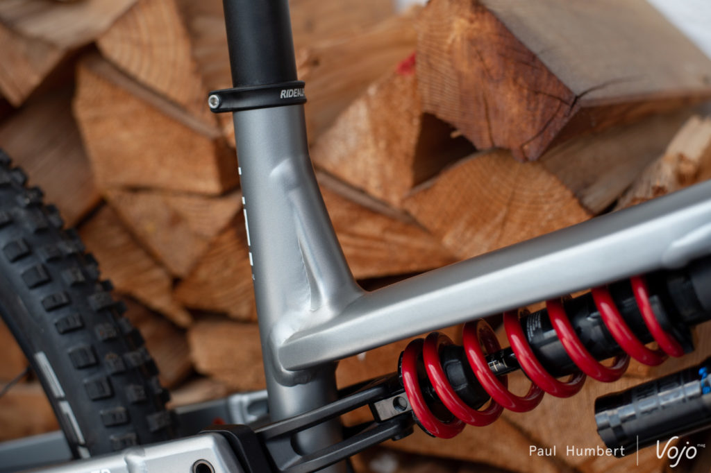 Esthétiquement, le changement le plus marquant est la disparition du coude formé par le tube supérieur à l’approche du tube de selle. On a désormais un tube parfaitement droit, renforcé par un gousset plus ou moins imposant suivant la taille du vélo. C’est peut-être un peu moins joli et caractéristique mais cela permet de raccourcir le tube de selle de 20 à 35 mm et donc de monter une tige de selle à plus grand débattement, quelque chose qu’on apprécie.