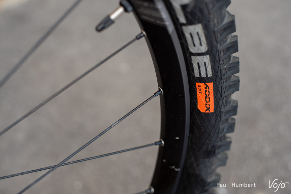 Côté pneus, nos Schwalbe étaient dotés d’une nouvelle carcasse appelée SuperTrail et qui peut être comparée à l’Exo+ de Maxxis. Elle a plutôt bien fonctionné et on apprécie cet ajout dans la gamme du fabricant allemand, qui manquait clairement d’une vraie carcasse solide et polyvalente mais pas trop lourde entre la SnakeSkin et la SuperGravity. A l’arrière, on profitait d’un Nobby Nic aux crampons redessinés et en gomme Addix Soft (autre nouveauté sur ce modèle), un pneu parfois décrié mais qu’on a apprécié ici pour sa résistance au roulement correcte ainsi que son comportement prévisible et cohérent vis-à-vis du vélo, facile à placer en glisse pour tourner dans les nombreuses épingles du Beaufortain mais stable au freinage.