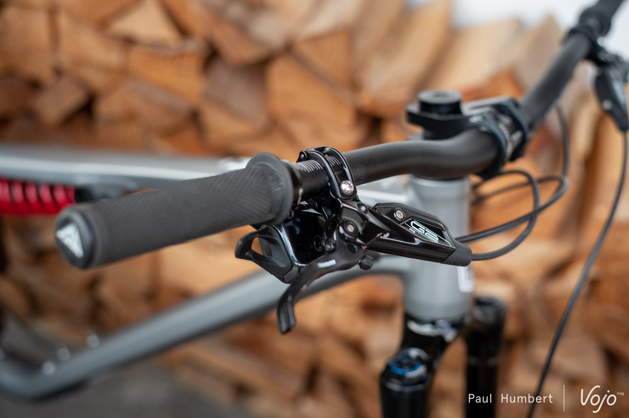 Le seul élément qui nous a paru un peu décalé, ce sont les freins. Les Sram G2 RS sont une nouveauté 2020 et se placent sous les G2 RSC, avec un réglage de la garde sans outil mais pas de réglage du point de contact. Rien à dire sur leur fonctionnement intrinsèque, ils ont été précis et plutôt constants tout au long des 9000 m de D- de cette découverte, mais c’est le choix même des G2 qui nous dérange un peu. Le vélo a d’énormes capacités en descente et les G2 manquent clairement de puissance pour y faire face. Il faut freiner plus tôt, plus fort et plus longtemps qu’avec d’autres freins plus puissants et ça en devient fatiguant pour le pilote au bout d’un moment. Ce sont des freins adaptés pour un vélo de trail mais ce Meta TR 29 n’est plus un vélo de trail, loin de là…