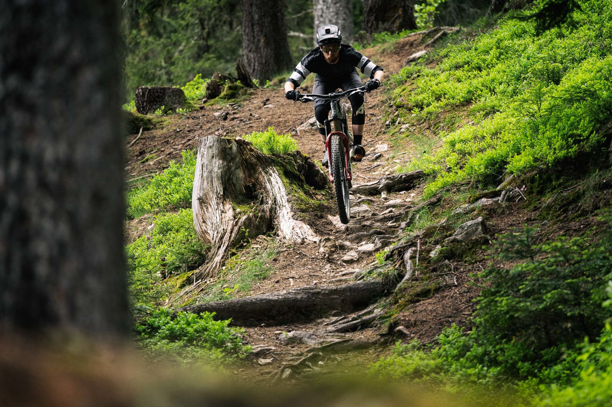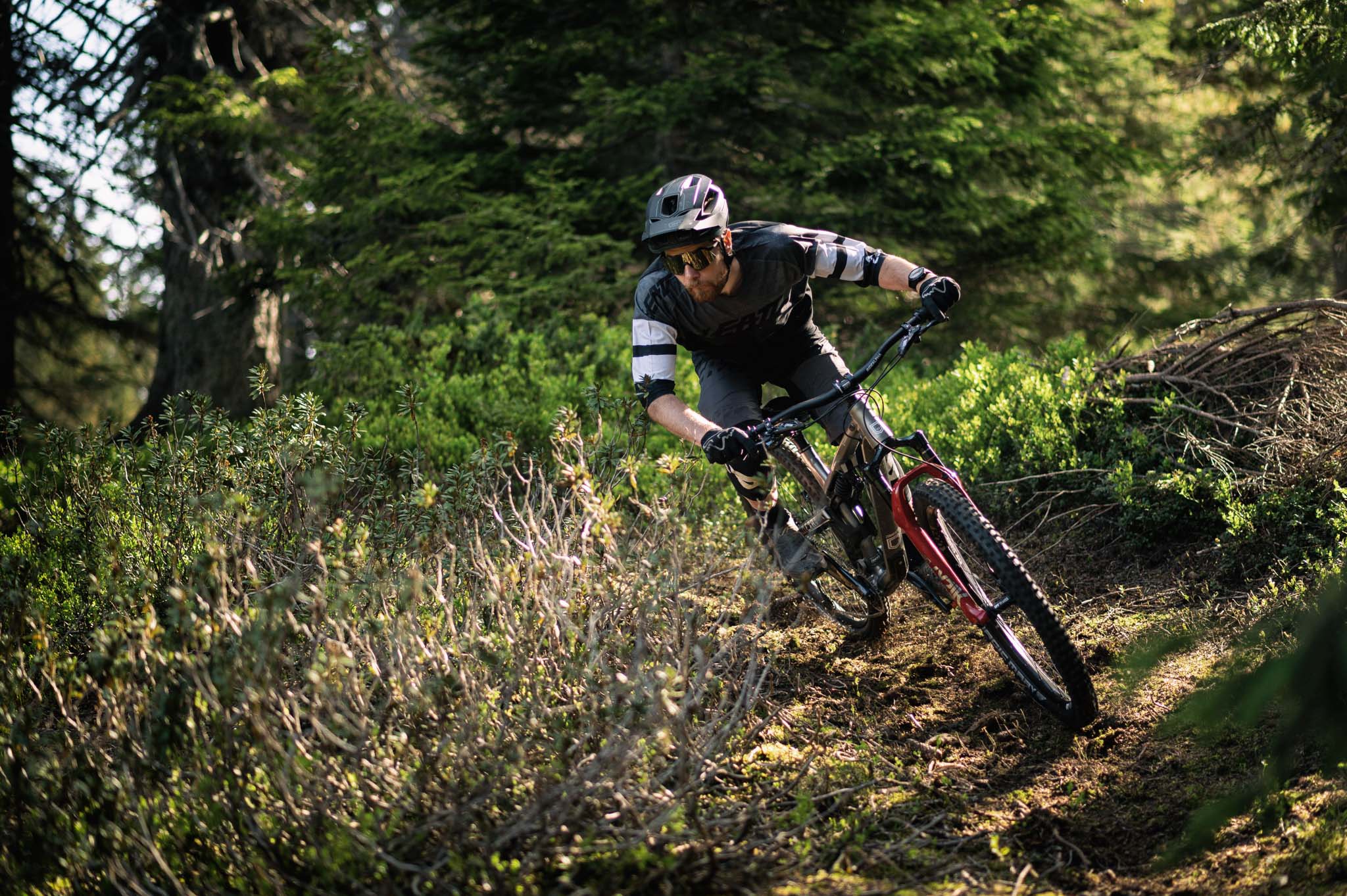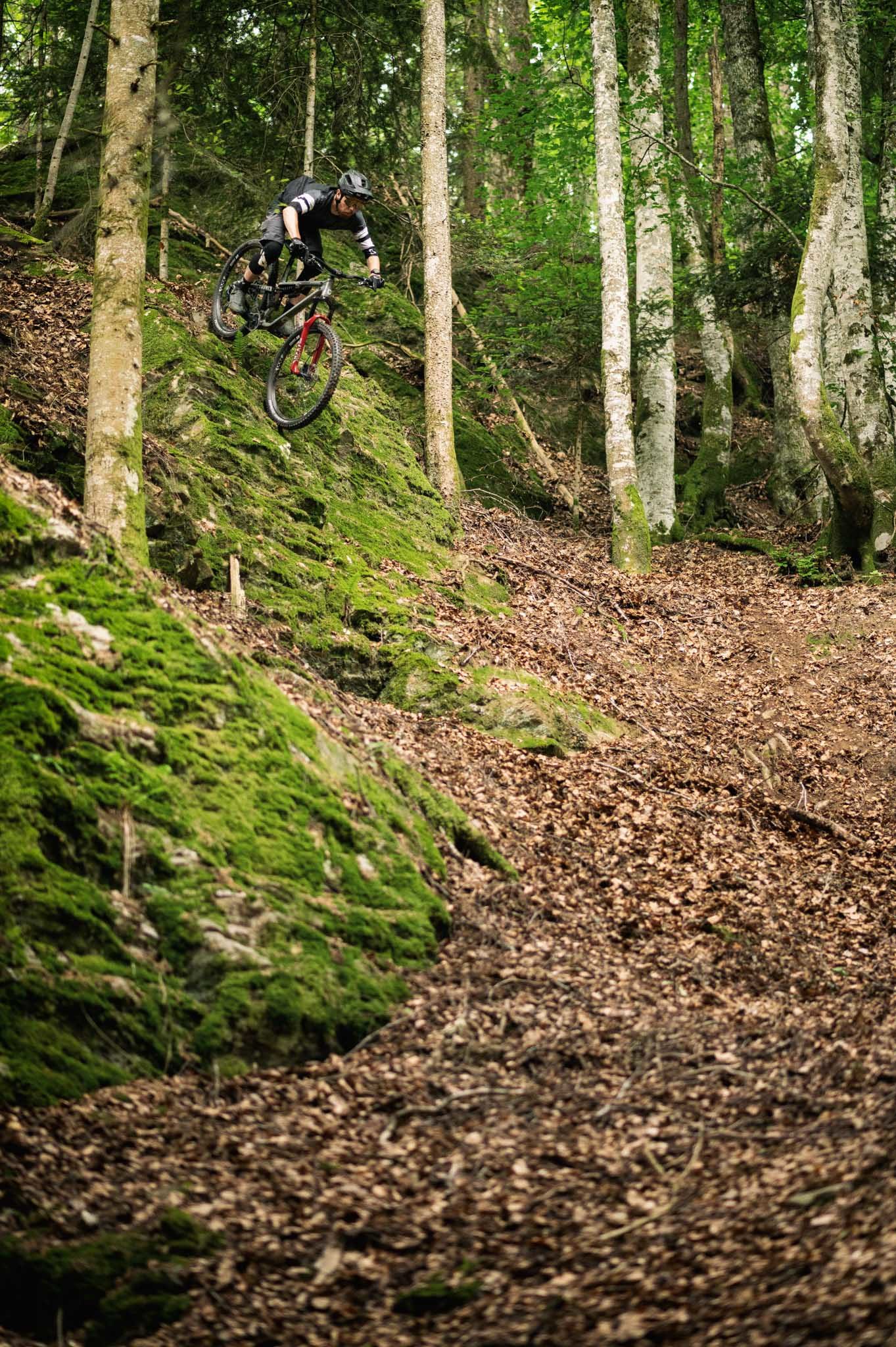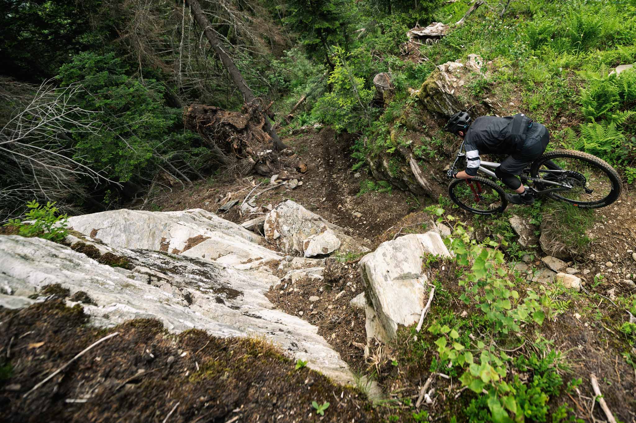 Une fois le bon réglage trouvé, on comprend mieux ce qu’Arthur voulait dire quand il parlait de « mini-enduro » : le vélo est vif et se place facilement, ce qui incite à jouer avec les mouvements de terrain et exploiter toute la largeur (voire un peu plus) des étroits sentiers du Beaufortain.