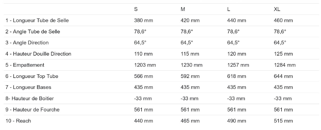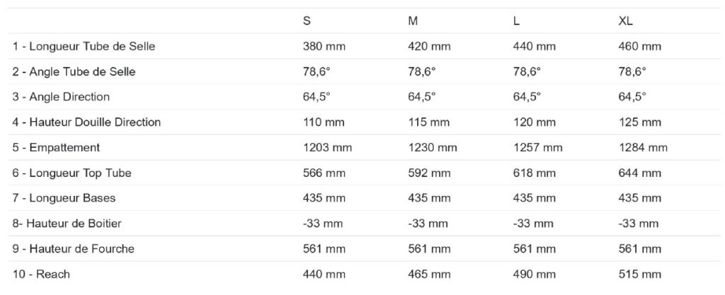 En parallèle, l’angle de direction perd deux degrés pour descendre à 64,5° et l’angle du tube de selle se redresse d’autant, ce qui l’amène à 78,6°. Le boîtier de pédalier remonte de 5 mm tandis que la longueur des bases est un des seuls points du vélo qui reste à peu près stable (+ 1 mm). C’est d’ailleurs un peu surprenant vu l’allongement du reach, étirer un peu les bases aurait paru logique pour conserver un bon équilibre, mais comme toujours, le terrain sera le seul juge. Avec ces évolutions, l’empattement gagne entre 29 et 39 mm selon la taille.