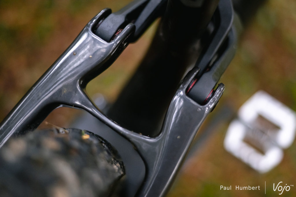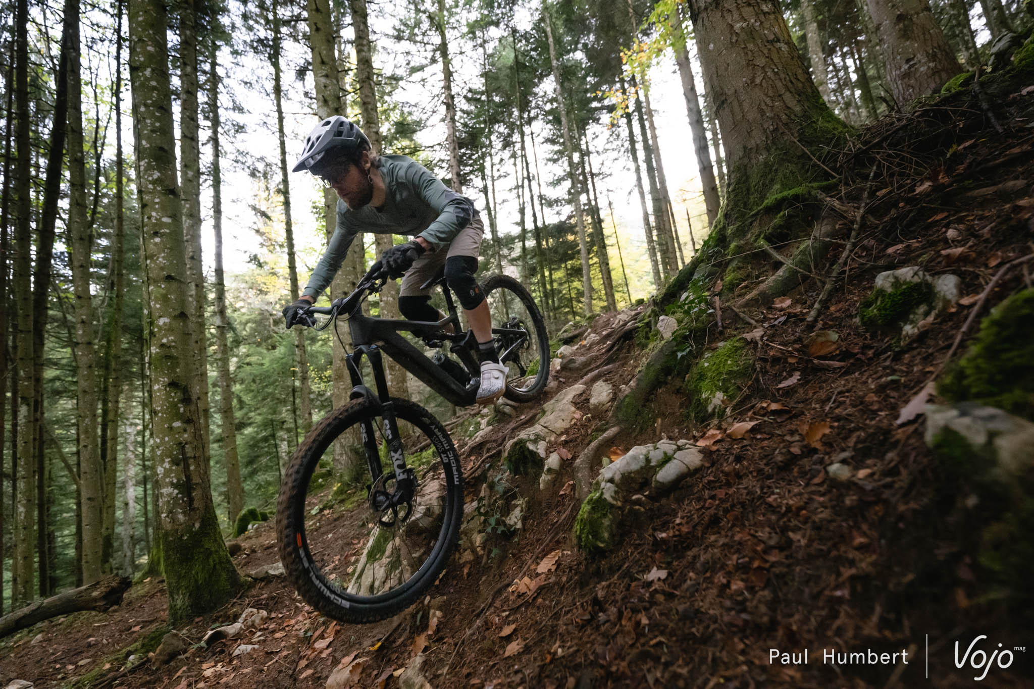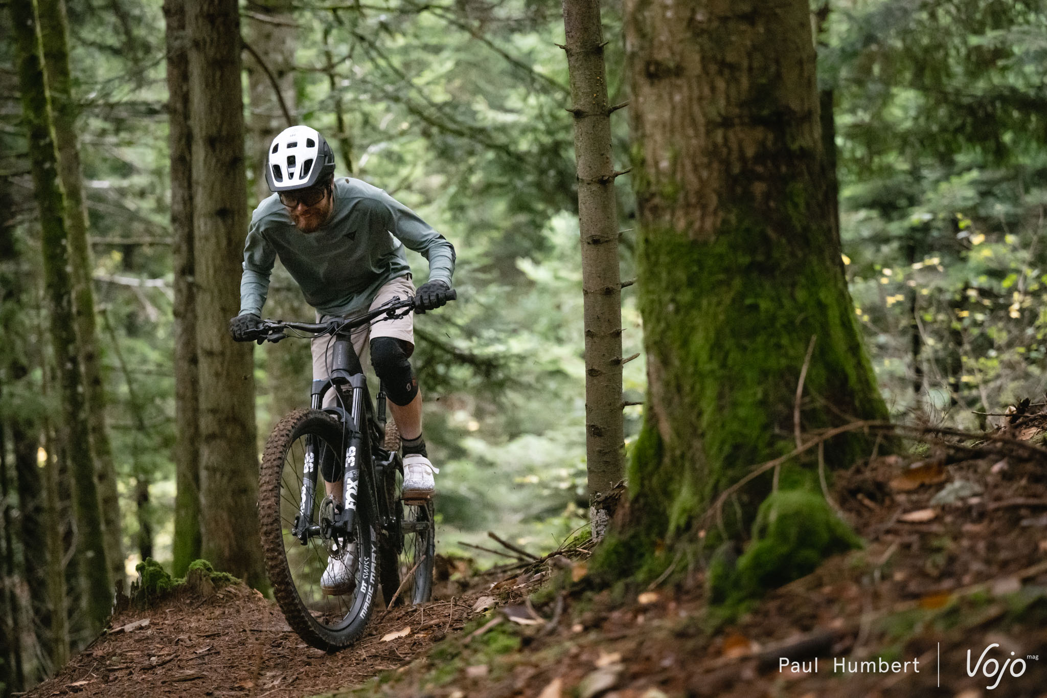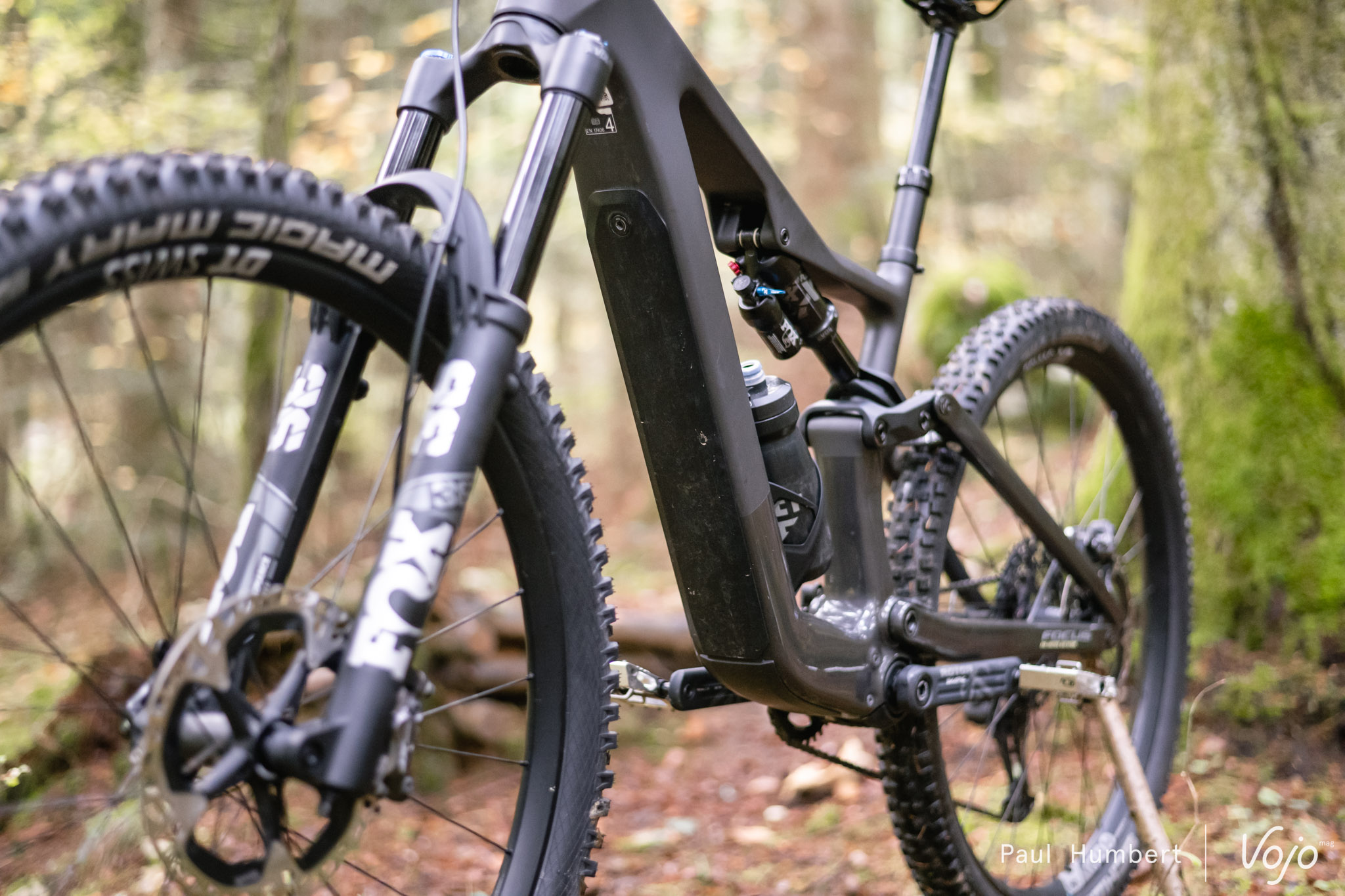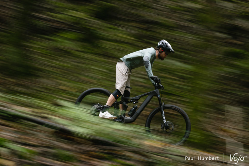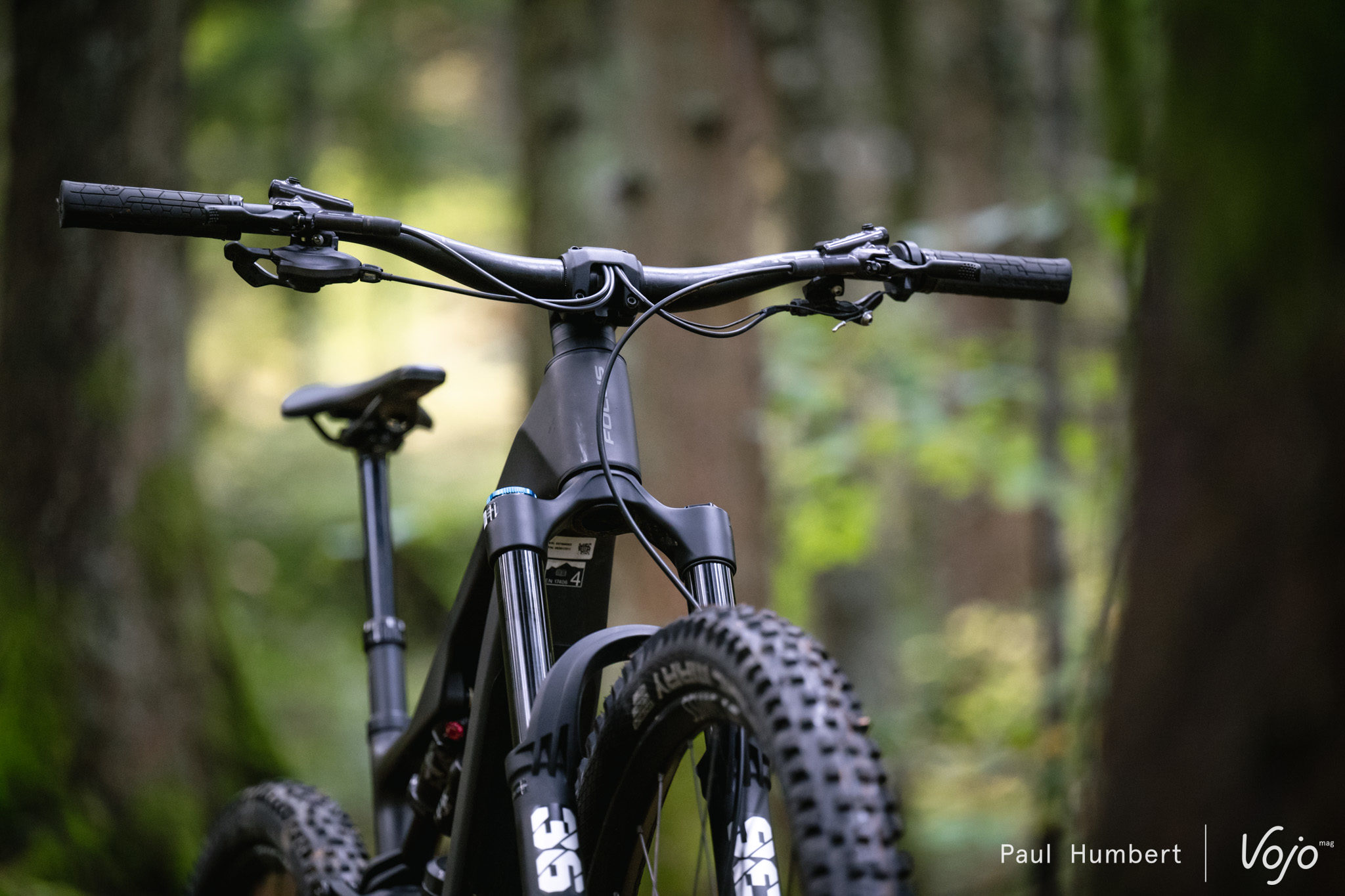 La suspension arrière complète ce tableau avec un comportement qui apparaît plus adapté aux pistes flow avec de gros chocs et de belles compressions que sur les sentiers plus lents avec beaucoup de petits obstacles pointus. Grâce à la géométrie, à l’équipement (merci l’excellent pneu avant) et au châssis qui offre un grip surprenant (le dosage des rigidités ?) on ne se met jamais en danger et on ne se fait pas peur, mais on a simplement déjà vu plus confortable.