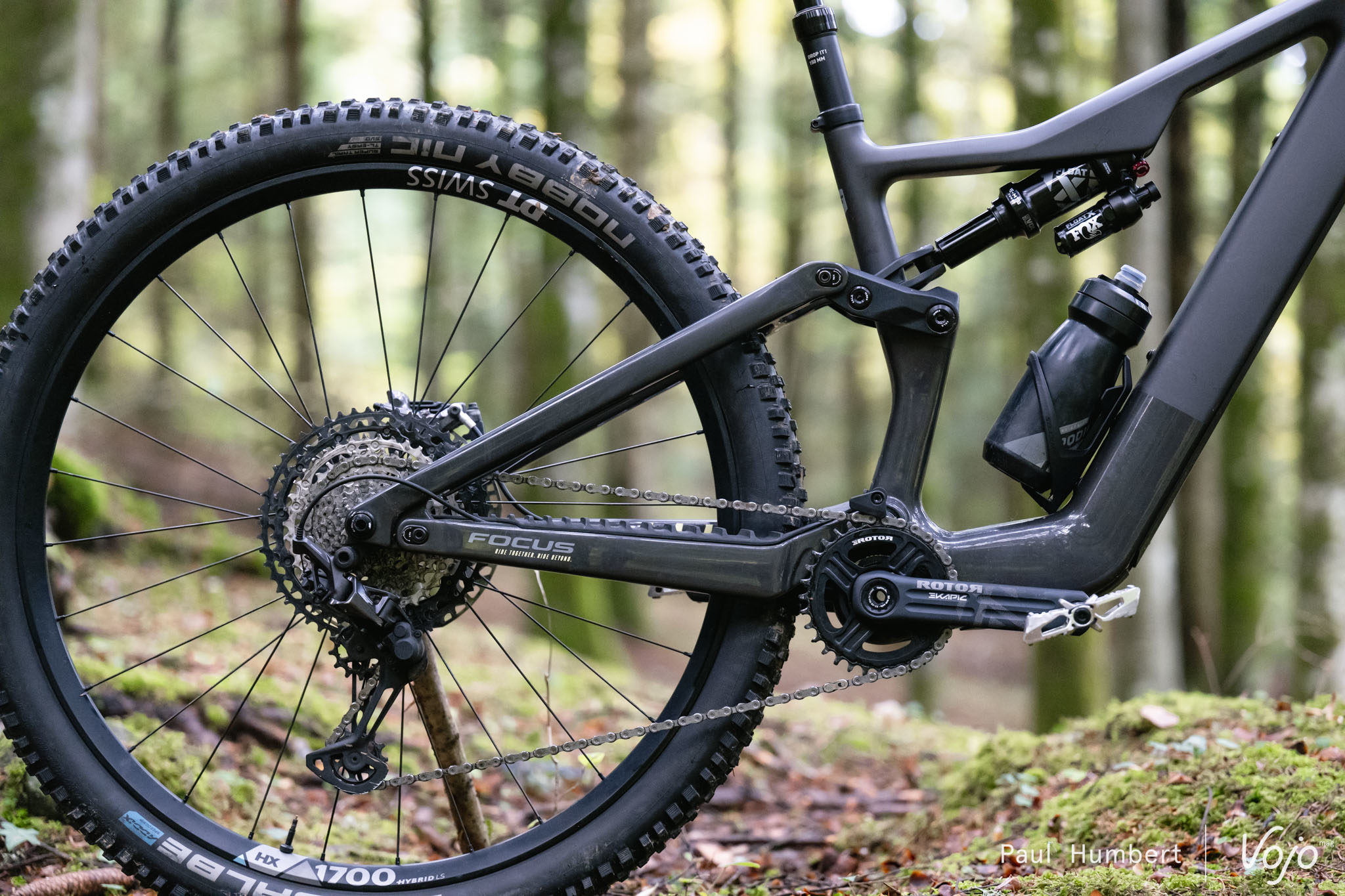 Autre limite, l’adhérence du pneu arrière. Sur ce modèle 9.9, la version « enduro » du Jam² SL, Focus a opté pour un Schwalbe Nobby Nic en carcasse SuperTrail et gomme SpeedGrip. On salue le choix de la carcasse robuste mais pour le profil du pneu, on émet quelques réserves. Si on peut comprendre le choix de Focus qui a souhaité privilégier l’autonomie, on ne peut que que constater que ce couple gomme-profil atteint vite ses limites dans le gras.