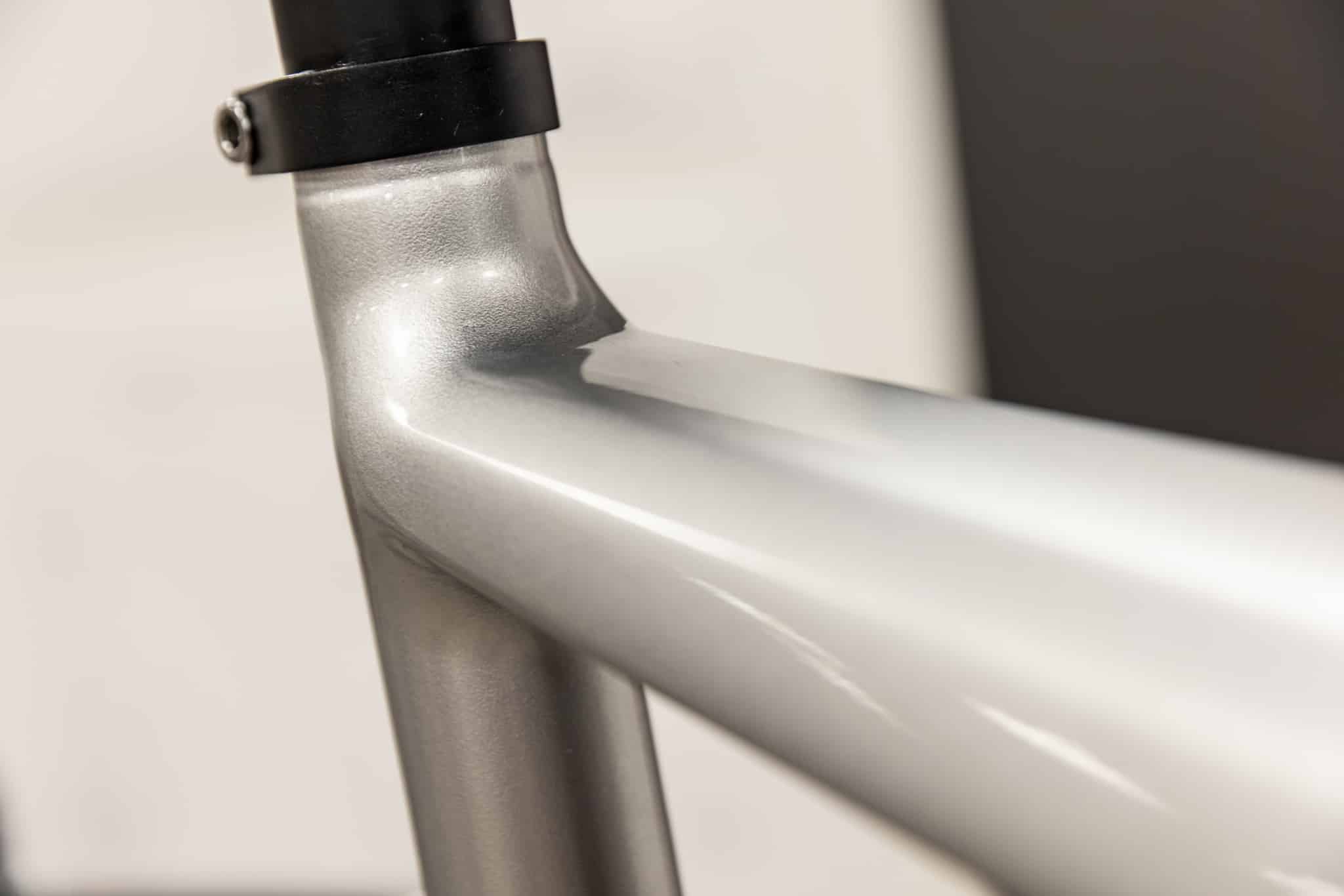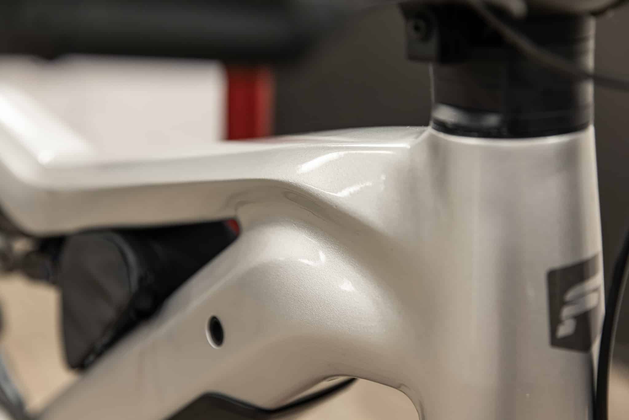 On a failli se laisser avoir au premier coup d’oeil tant les lignes du cadre sont douces et les soudures invisibles sur l’avant du vélo. La marque a en effet procédé à un « gommage » de ces dernières en ajoutant une résine polie pour un rendu très « carbone ». Pour les pièces moins visibles ou les tubes qui s’assemblent bout à bout, ce n’est pas possible et on retrouve les soudures de l’aluminium.