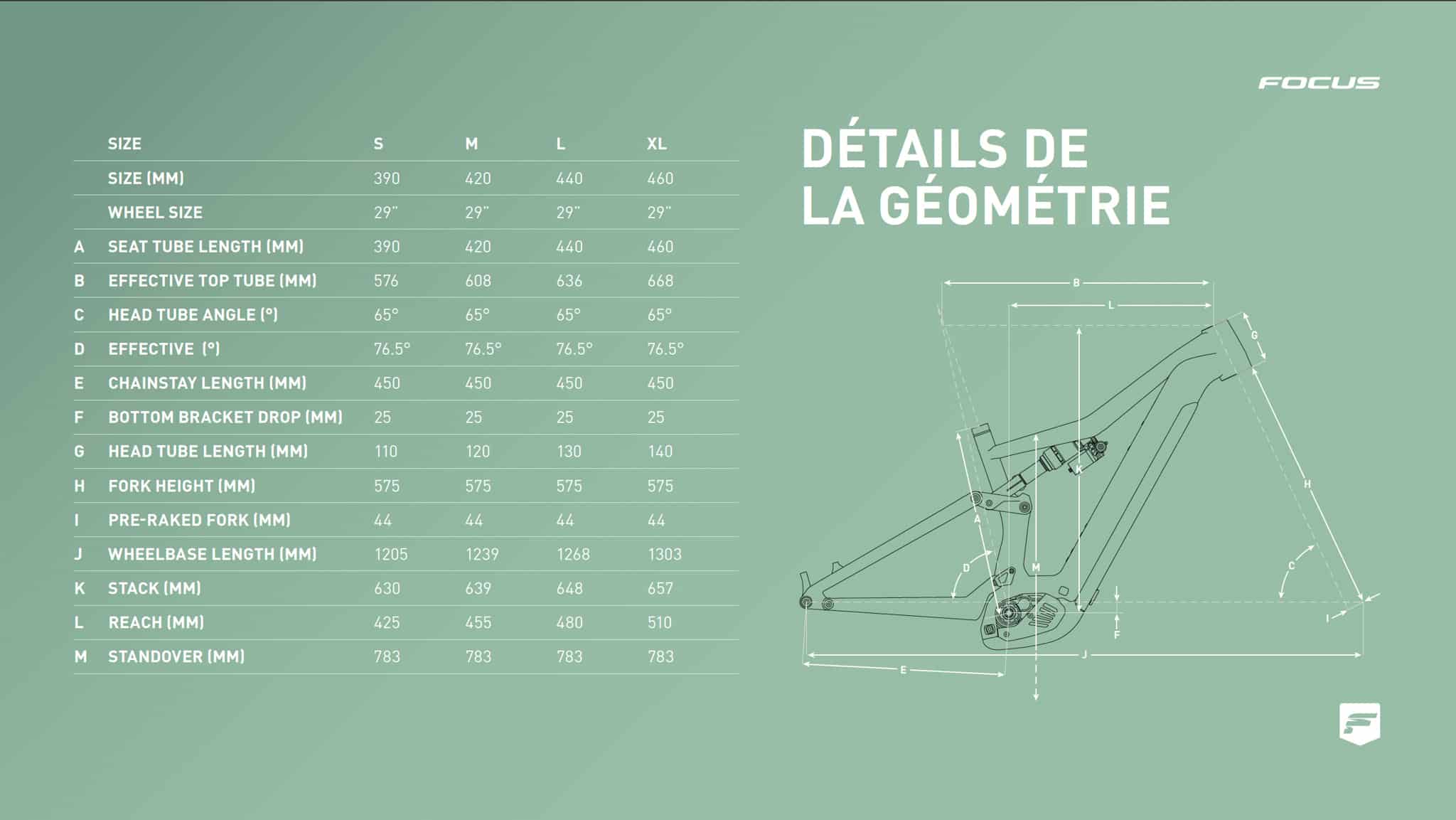 Focus a fait le choix de rester proche de ce qui était proposé par son précédent Jam2 avec une géométrie moderne sans être extrême. Le vélo est un tantinet plus court avec un reach de 455 mm en taille M, un stack de 639 mm et un angle de direction qui passe de 64,5 à 65°.