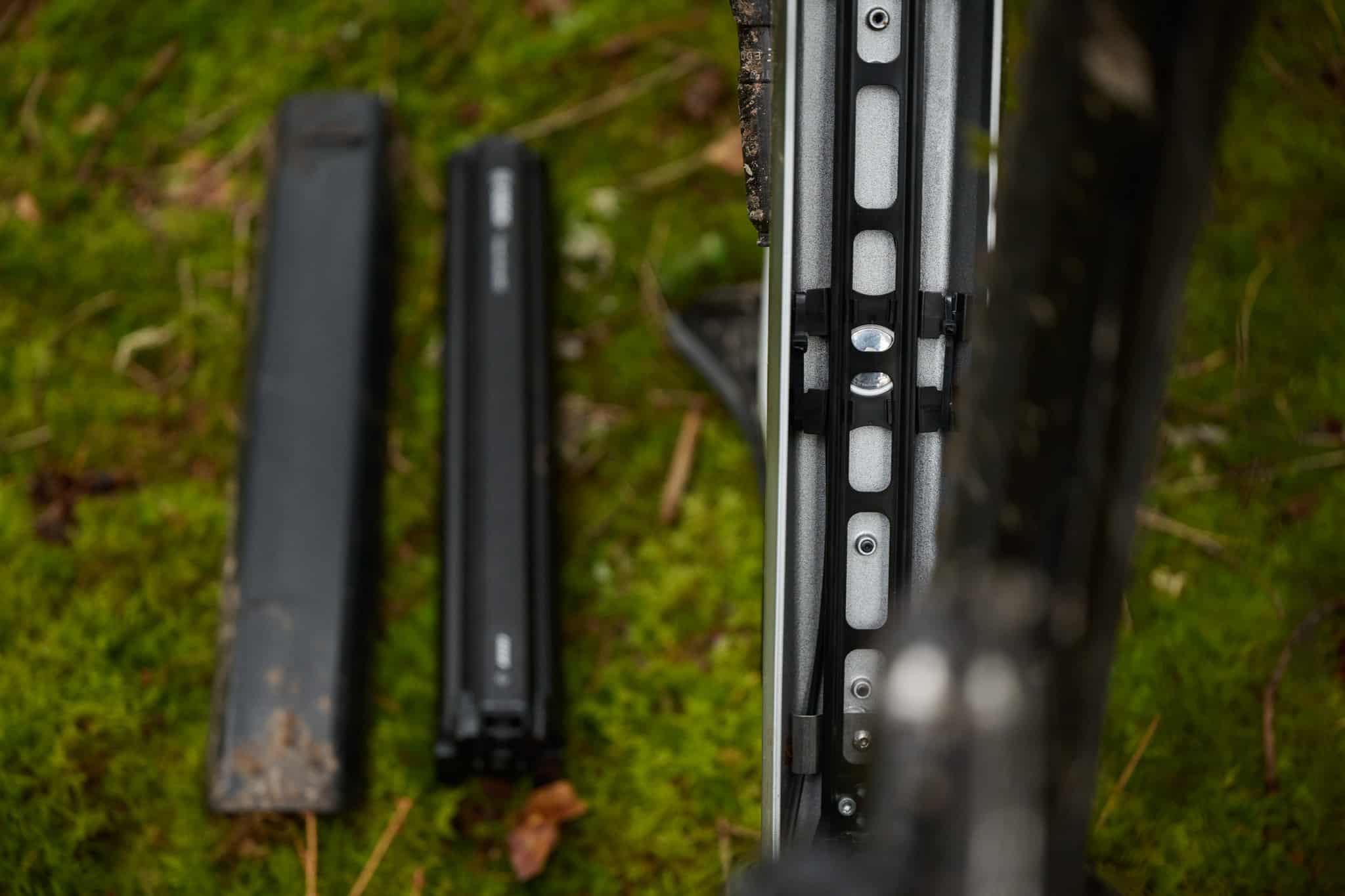 On repère immédiatement que Focus a fait cette fois le choix d’un tube inférieur « ouvert » qui permet d’accéder facilement à la batterie. Pour ce nouveau vélo, on embarque, au choix, une batterie de 600 Wh ou de 800 Wh en utilisant un cache légèrement bombé. Les détracteur de ce choix technique avancent un potentiel manque de rigidité.