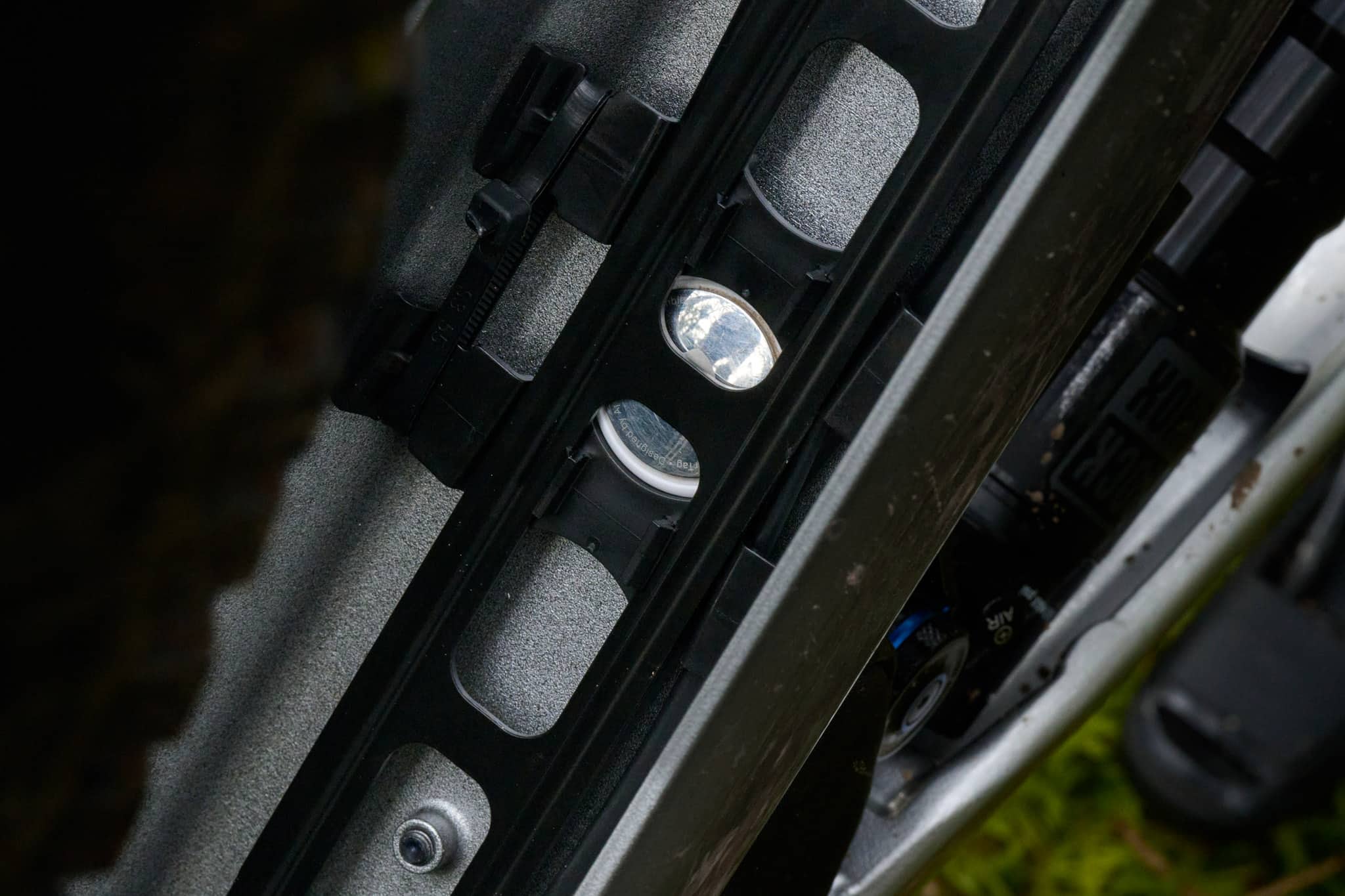 À l’intérieur du vélo, quand on retire la batterie, on observe les câbles maintenus au fond du tube par des pièces en plastique. Ces pièces peuvent également maintenir un Airtag (un système Apple, vendu séparément, qui permet de géolocaliser la pièce).