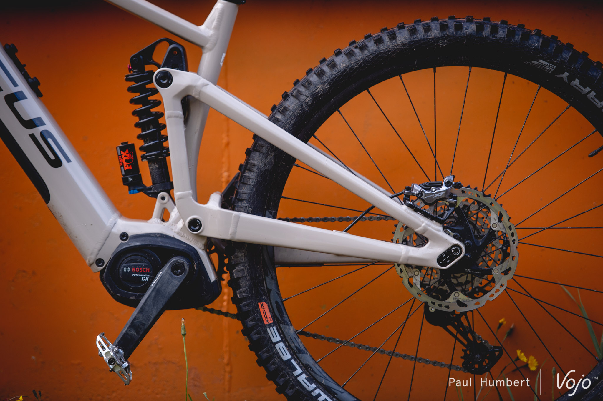 On retrouve un duo de suspensions bien costaud avec la dernière Fox 38 qui offre 170mm de débattement et une cartouche Grip2. On rejoint les premières sensations d’Olivier au moment de la présentation de la fourche (à retrouver ici : https://dev.vojomag.com/test-nouveaute-fox-38-36-grip2-redistribution-des-cartes/ ). Avec notre pilotage plutôt léger, on ne ressent pas nécessairement le besoin d’une fourche comme celle-ci, mais on apprécie toutefois de la retrouver à l’avant de ce vélo. En e-bike, les forces sont décuplées, le poids est plus présent et on a aimé pouvoir évoluer avec une base ultra solide.