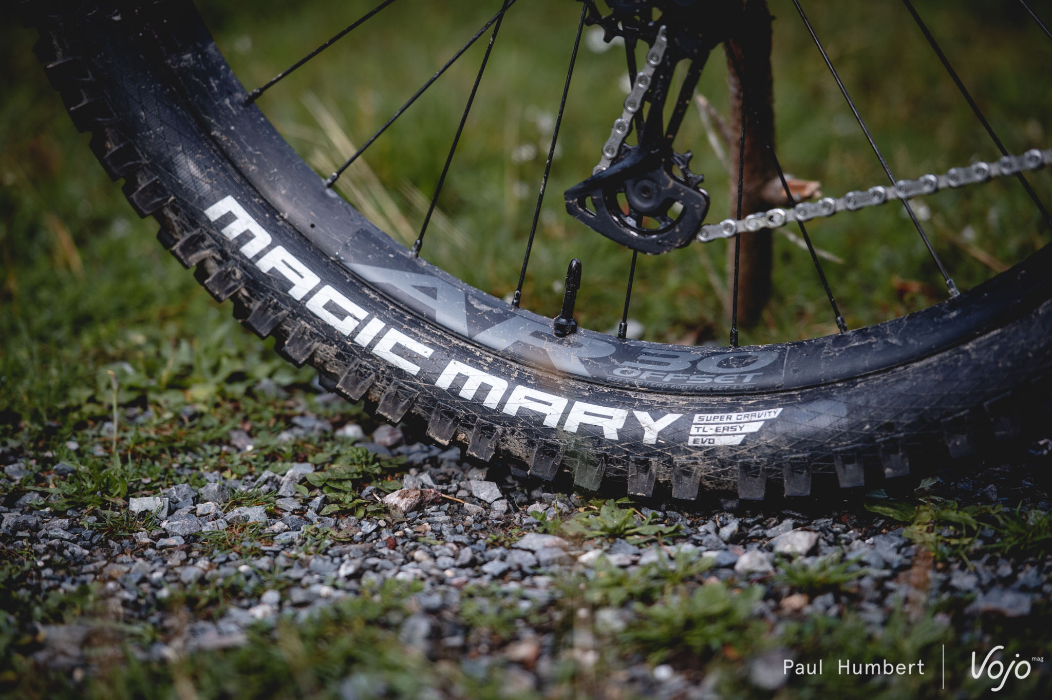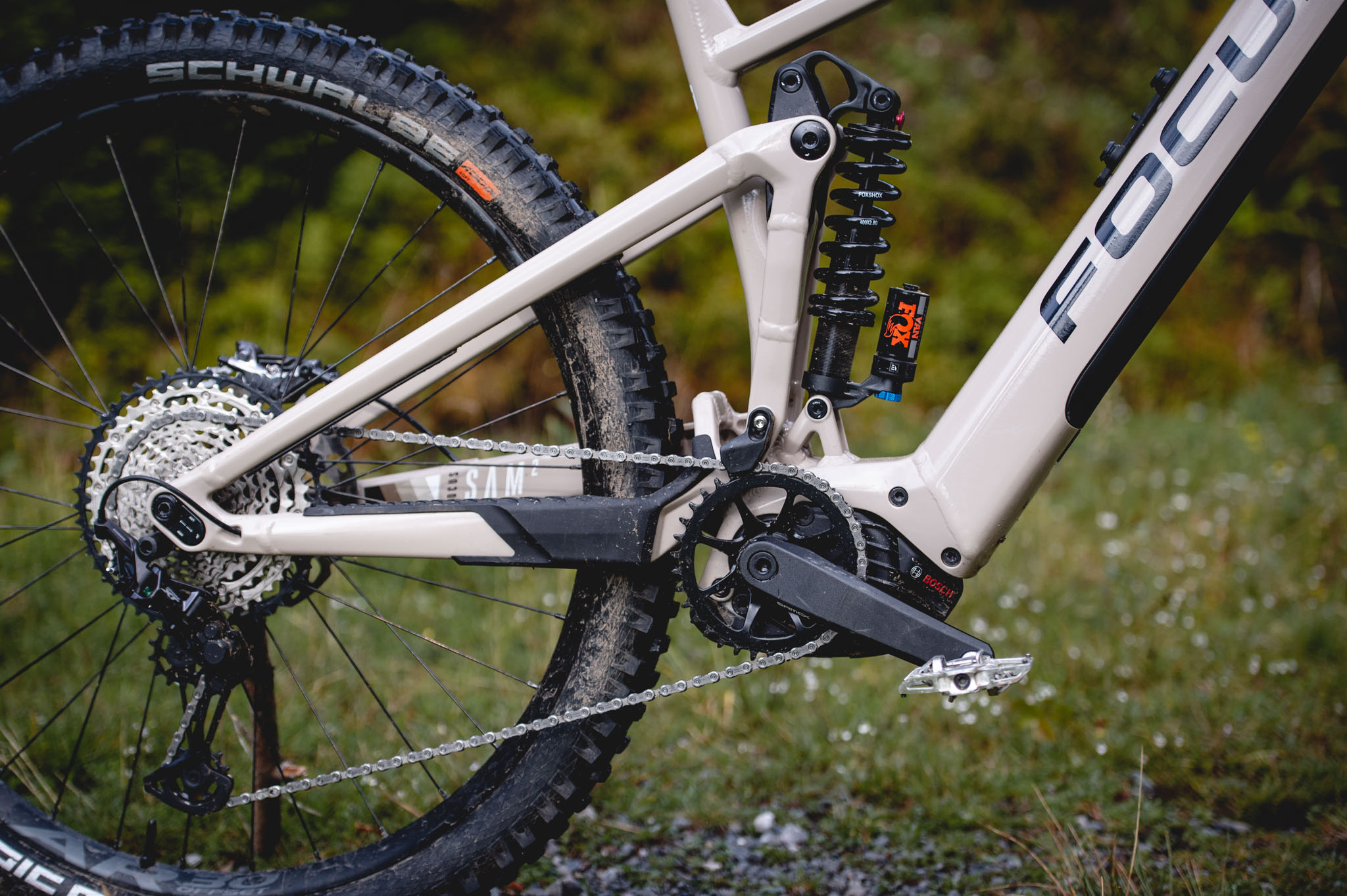 Côté train roulant, là aussi c’est plutôt solide et nous n’avons rien eu à redire après deux journées. Les roues associent des cercles RaceFace AR30 à des moyeux Novatec D162. Elles accueillent des pneus Schwalbe Magic Mary en carcasse Super Trail devant et Super Gravity derrière, soit un très bon choix, solide et polyvalent. Focus opte pour une section de 2.6 qui offre une bonne motricité.