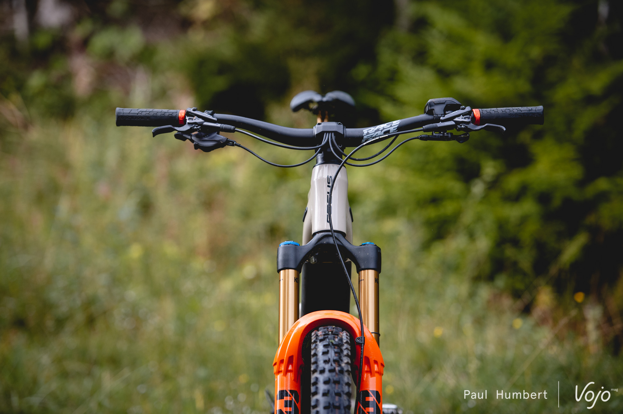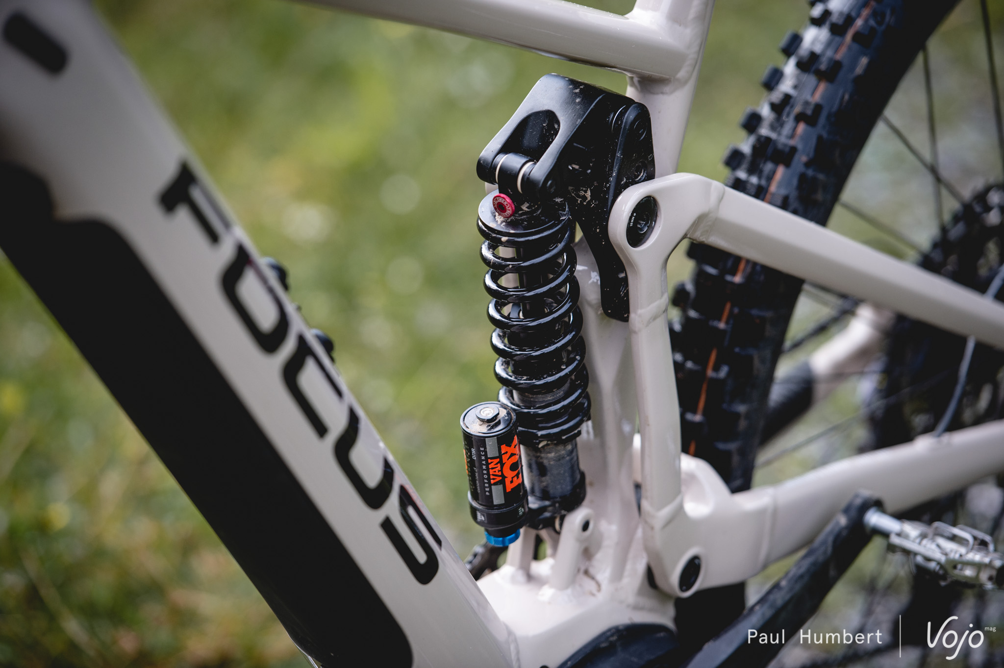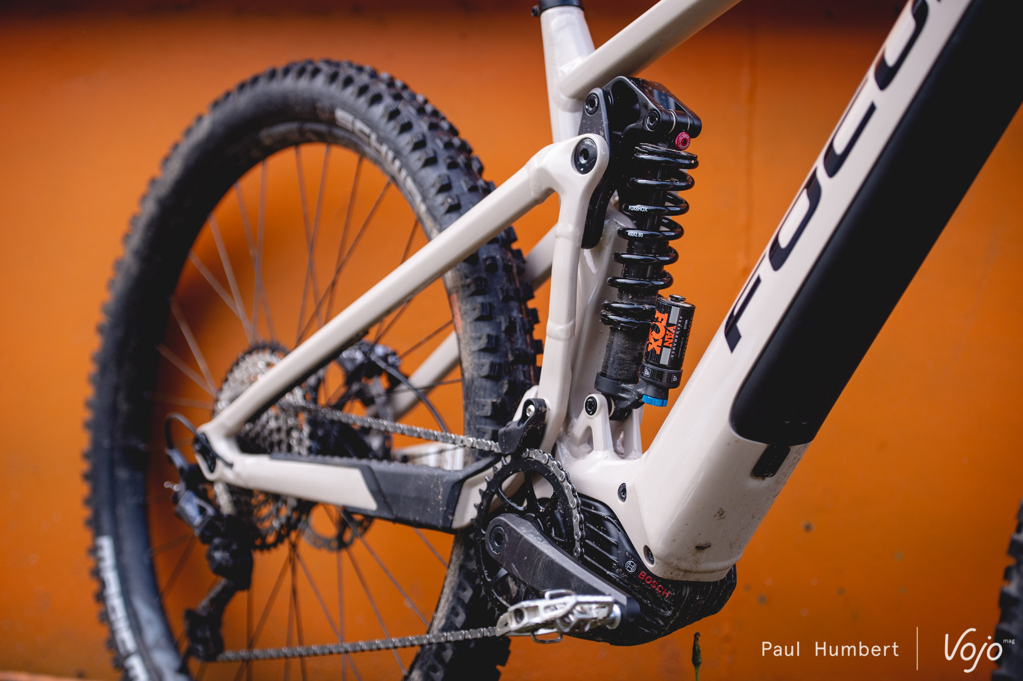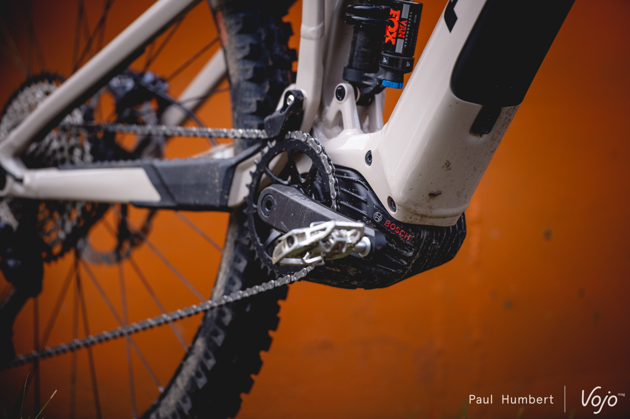 On retrouve un duo de suspensions bien costaud avec la dernière Fox 38 qui offre 170mm de débattement et une cartouche Grip2. On rejoint les premières sensations d’Olivier au moment de la présentation de la fourche (à retrouver ici : https://dev.vojomag.com/test-nouveaute-fox-38-36-grip2-redistribution-des-cartes/ ). Avec notre pilotage plutôt léger, on ne ressent pas nécessairement le besoin d’une fourche comme celle-ci, mais on apprécie toutefois de la retrouver à l’avant de ce vélo. En e-bike, les forces sont décuplées, le poids est plus présent et on a aimé pouvoir évoluer avec une base ultra solide.