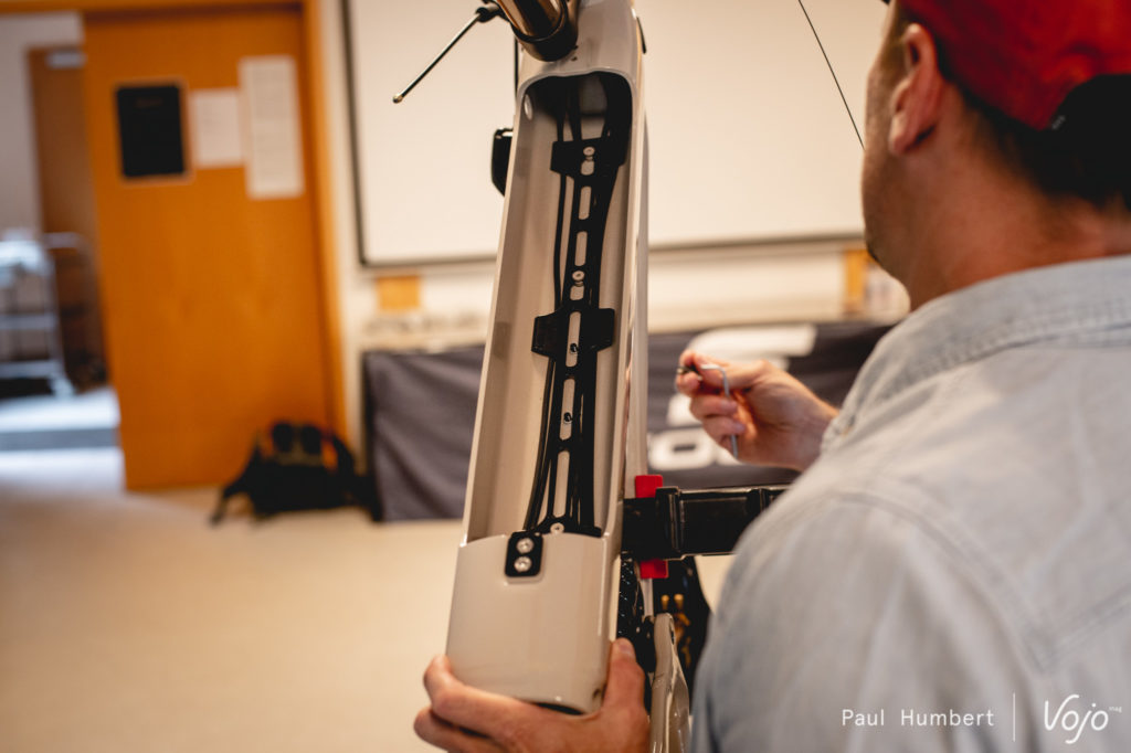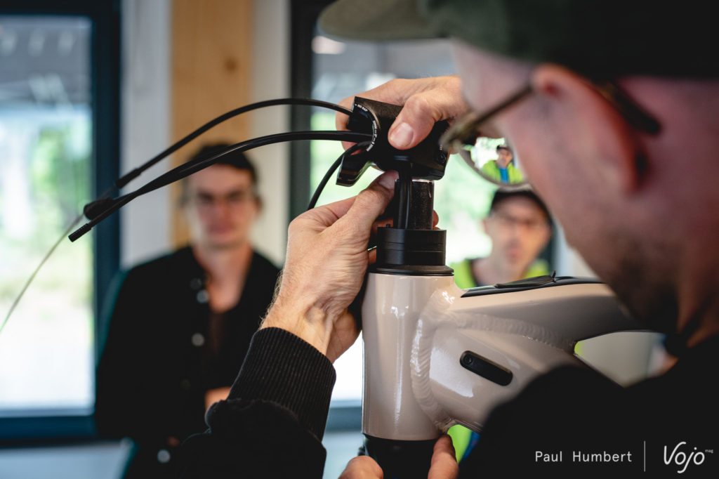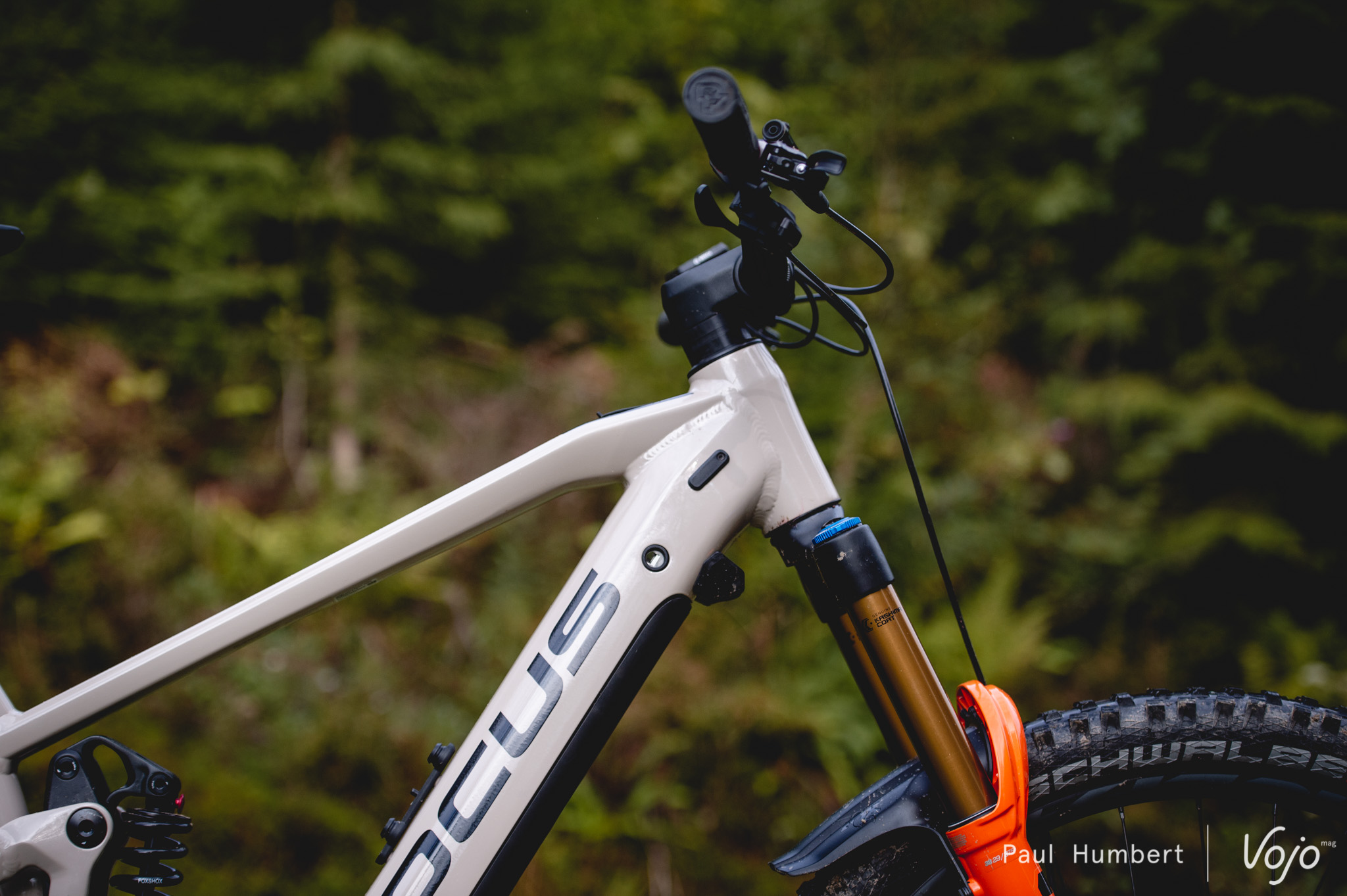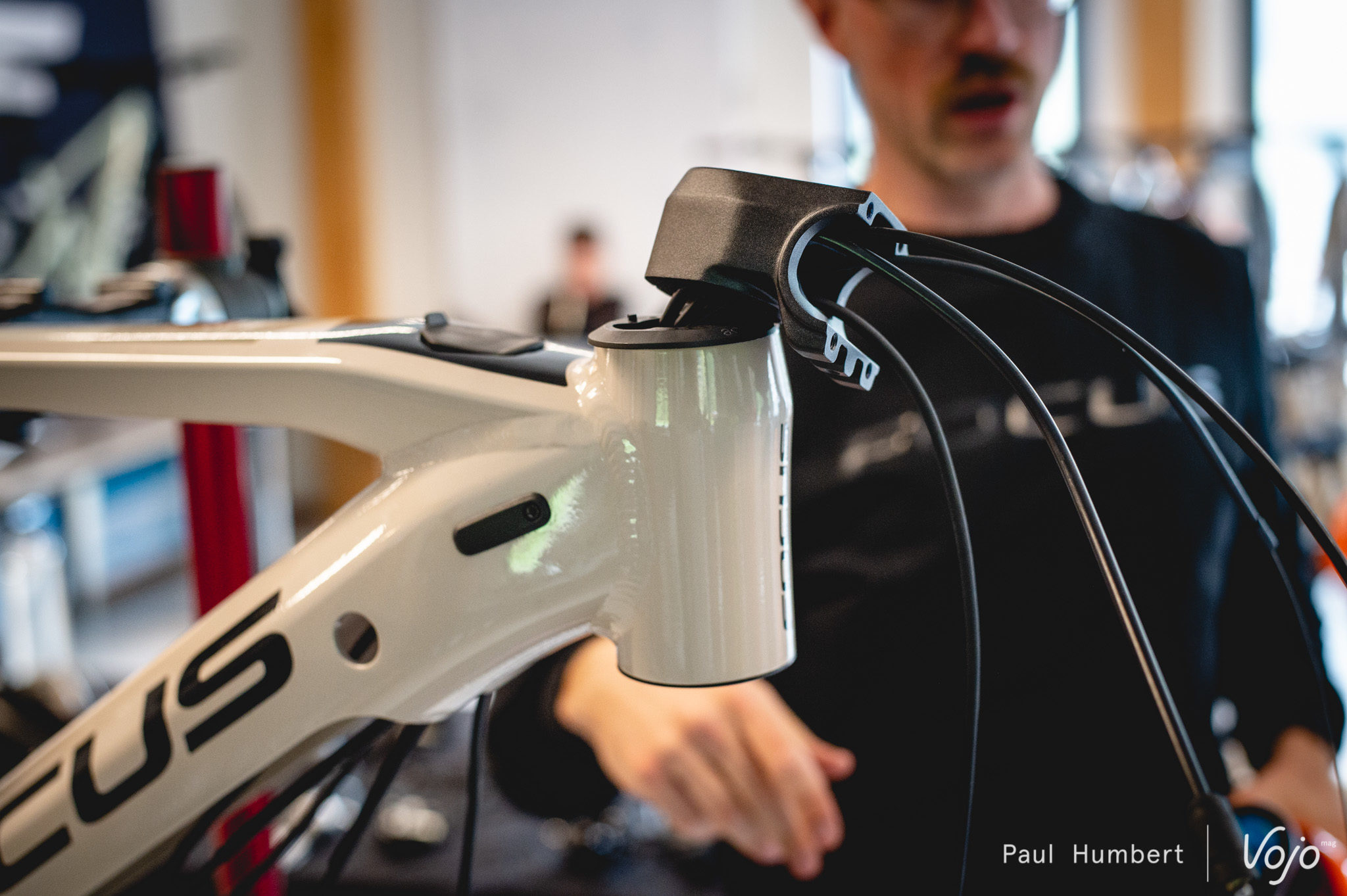 L’élément visuel le plus propre aux Focus a été présenté sur tous les VTTAE 2021 et on le retrouve assez logiquement sur ce nouveau vélo : la potence qui intègre tous les câbles et gaines. Baptisée C.I.S (pour cockpit integrated system), elle mesure 50mm de long sur toutes les tailles et on a pu assister à son installation. La solution optimale reste d’avoir le coup de main et un peu d’aide, mais l’ensemble reste accessible à qui souhaite bricoler sur son vélo.