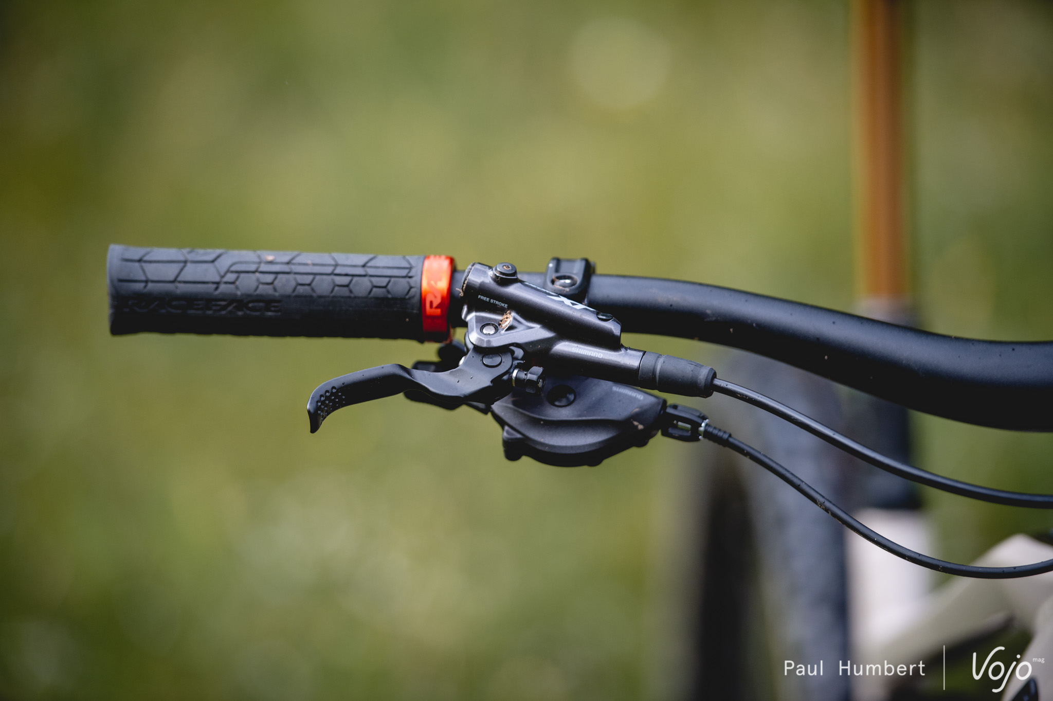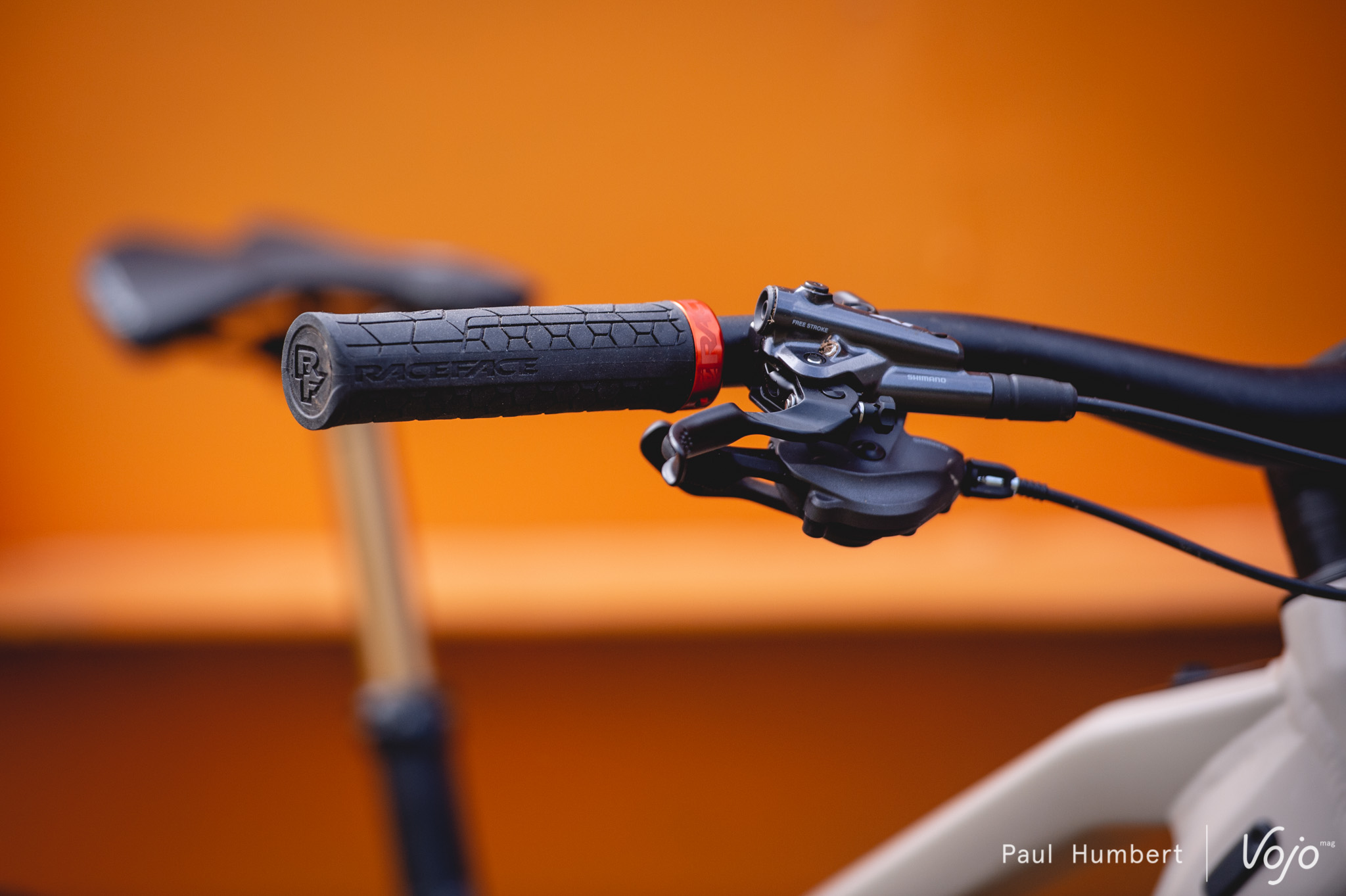 Le poste de pilotage qu’on vous présentait est complété par un guidon RaceFace Chester de 35mm de diamètre et de 780mm de large. Il est chaussé de poignées Getta de la même marque. Attention, si vous avez des petites mains, vous risquez d’avoir envie de passer à une section un peu plus fine.