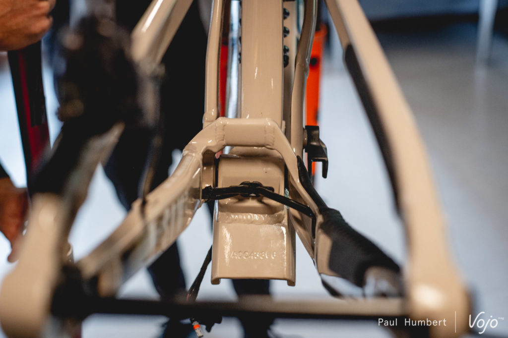 Le cadre comporte quelques petits éléments propres à la marque : ses bumpers de fourche, le flip-chip qu’on a évoqué, la prise de chargement sur le haut du top tube…