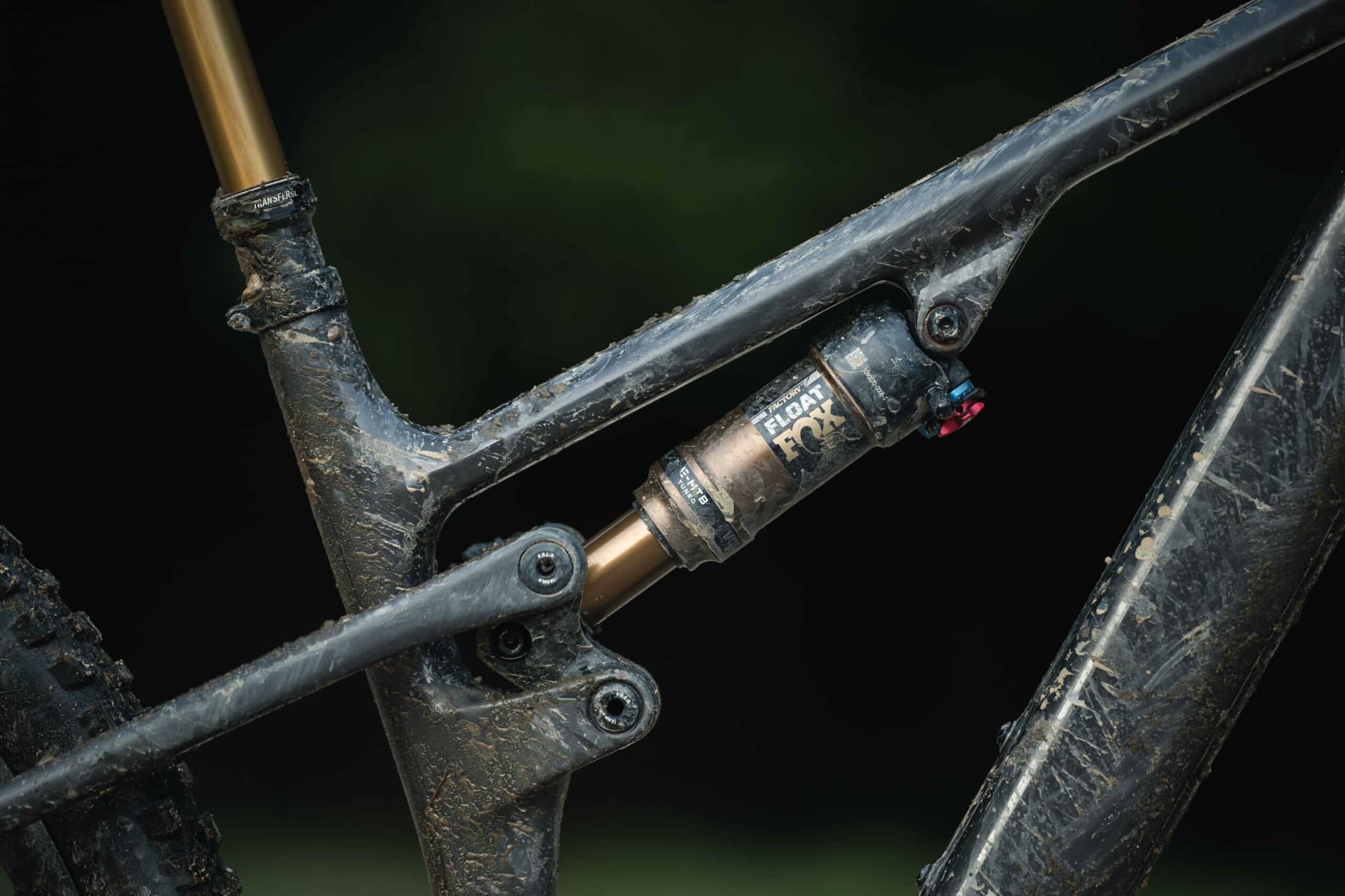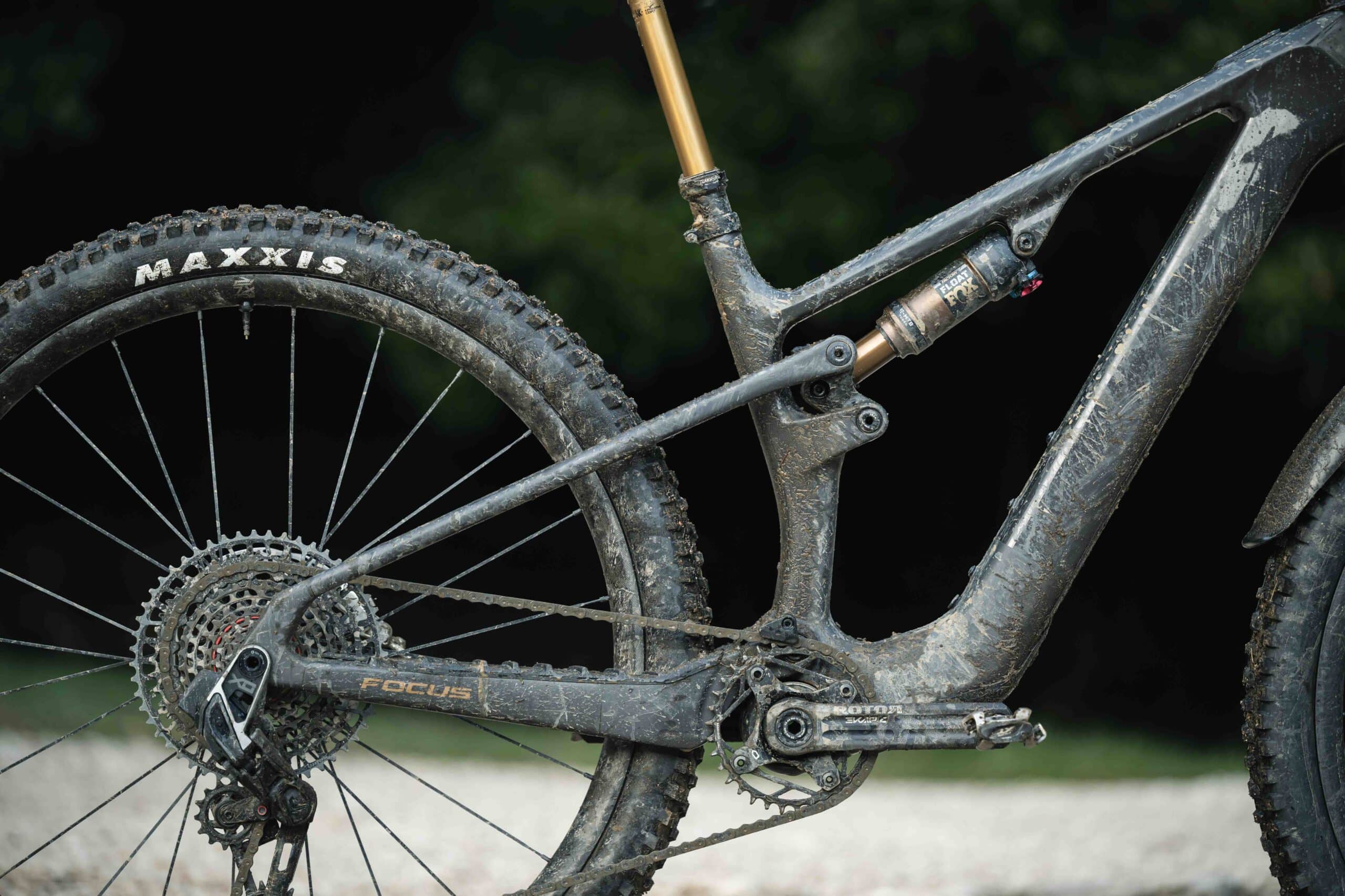Comme pour la construction de son cadre, le Focus Vam² SL s’inspire des machines de cross-country pour son architecture de suspension avec un monopivot + biellette (voir notre lexique). Cette construction se passe de points de pivots au niveau de la jonction bases-haubans et utilise la flexion des haubans en carbone. Cela permet de grappiller sensiblement des grammes, mais s’avère également être plus simple à entretenir étant donné qu’il y a moins de roulements utilisés. Revers de la médaille, c’est une construction qui permet moins d’ajustement du côté de la cinématique par rapport aux systèmes plus complexes utilisés sur les débattements plus importants (tel que le 4-Bar linkage, 6-Bar linkage…).