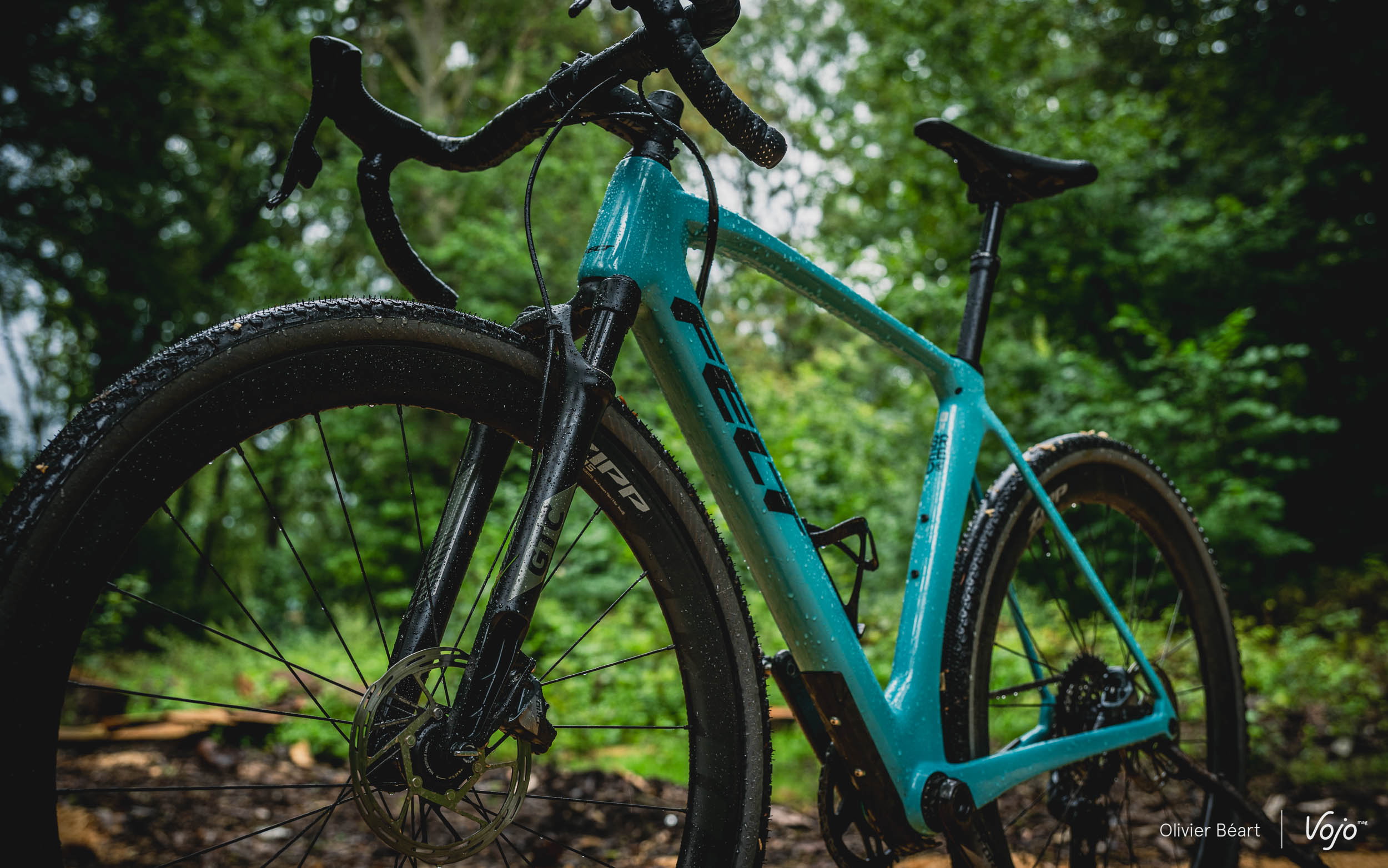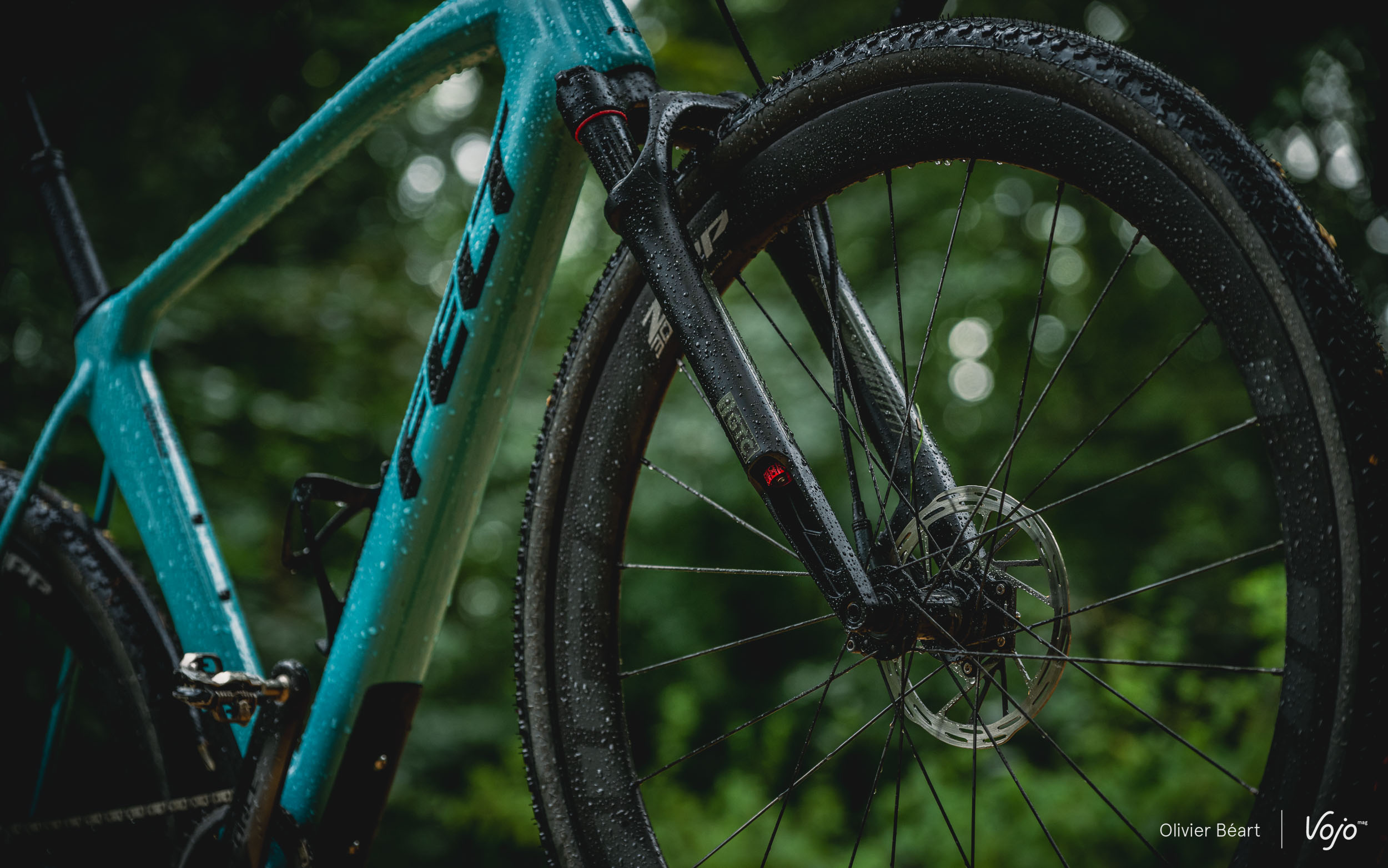 Bien sûr, on peut aussi envisager des pneus de plus forte section, mais les conséquences de ce choix sur le rendement et sur la manière de piloter le vélo ne sont pas non plus négligeables. Ici, la suspension permet aussi de conserver, comme sur notre vélo de test, des roues à jantes hautes et des pneus de section moyenne (42mm). Enfin, les pneus semblent moins sollicités et moins exposés aux crevaisons grâce à la fourche qui va aider à dissiper l’énergie des gros impacts.