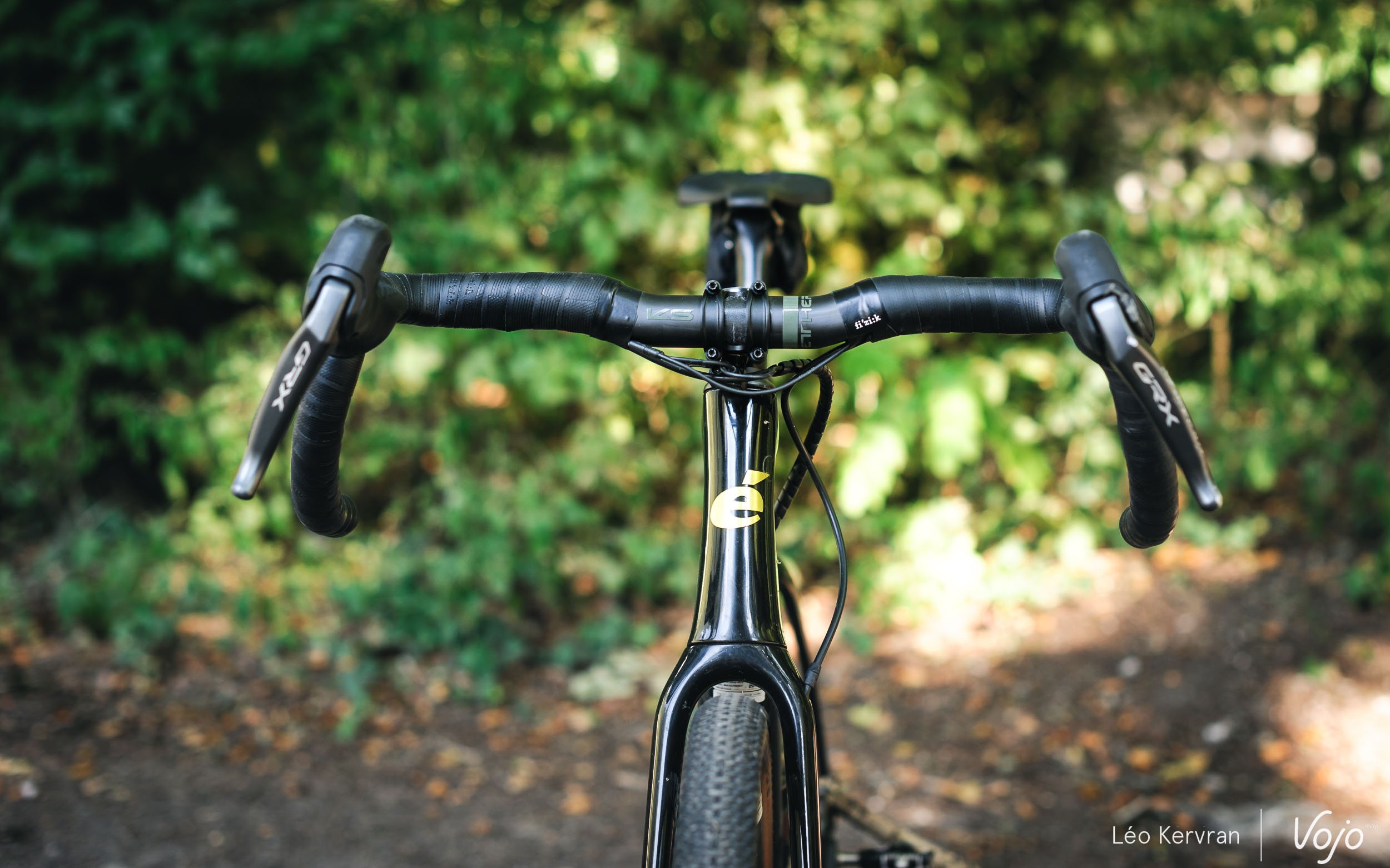 Même sans connaître toutes ses cotes, on remarque que l’Ether est plutôt du genre « compact », avec assez peu de profondeur et une hauteur modérée. Sans excès toutefois, on est loin des cintres gravel les plus extrêmes et ça ne devrait pas être trop déroutant pour quelqu’un qui viendrait de la route. C’est juste ce qu’il faut pour changer facilement de position (mains en haut / sur les cocottes / en bas) sans être déstabilisé à chaque fois.