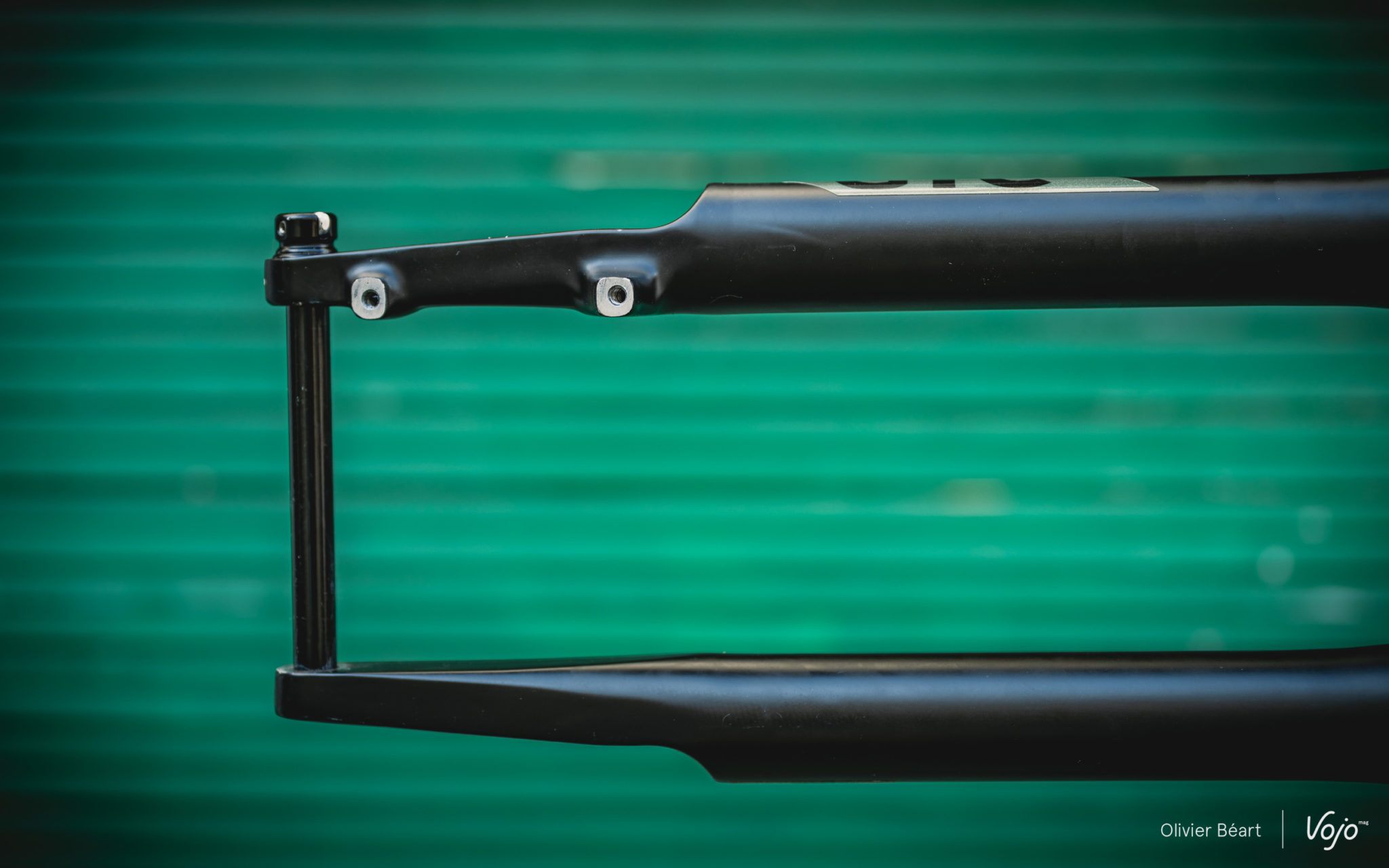 Pour sa première fourche de gravel, KS a visé directement un produit haut de gamme. Cela se remarque en jetant un coup d’œil attentif au châssis, très travaillé et fait d’un assemblage d’aluminium 6061 forgé puis usiné pour la partie basse de la fourche, et de carbone pour le haut et l’arceau rigidificateur.