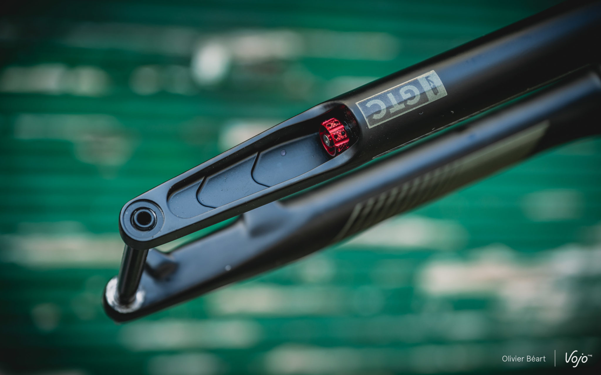 Côté poids, KS annonce 1385 g, mais nous avons plutôt pesé la fourche à 1425 g sur notre fidèle balance. Quoi qu’il en soit, on tourne autour de 1 kg de pénalité par rapport à une fourche carbone légère qui équipe un gravel haut de gamme. Il sera important de voir si ce surpoids se sent sur le terrain. Enfin, pour être complet dans la fiche technique, on signalera que la KS GTC gravel accepte des pneus jusque 50mm de large, que la patte de disque est au standard Postmount et que sa hauteur est la même que celle d’une fourche carbone rigide une fois qu’on est au SAG (enfoncement statique d’une fourche suspendue sous le poids du pilote). Enfin, bon point pour le petit levier caché dans l’axe de roue, discret et efficace.