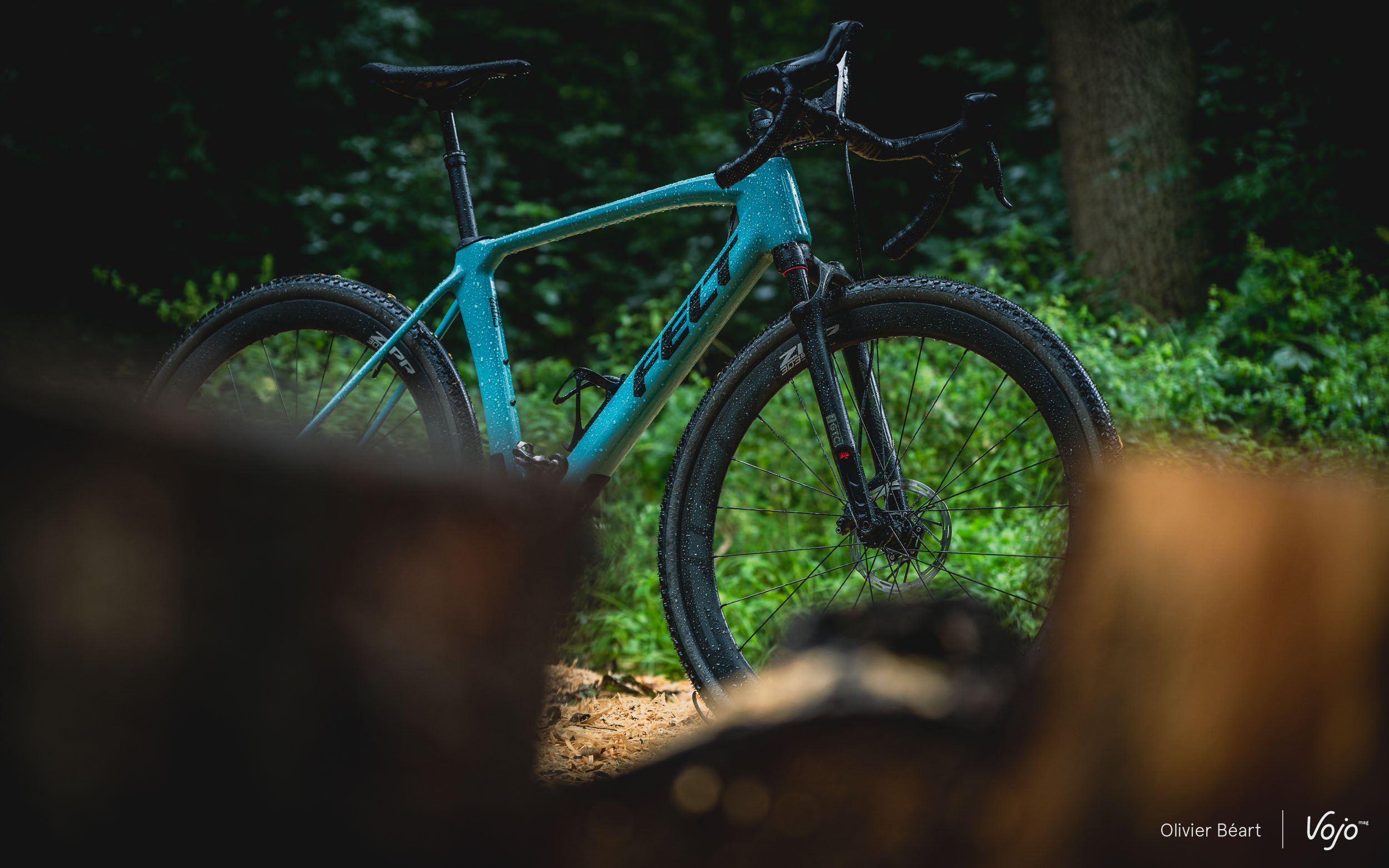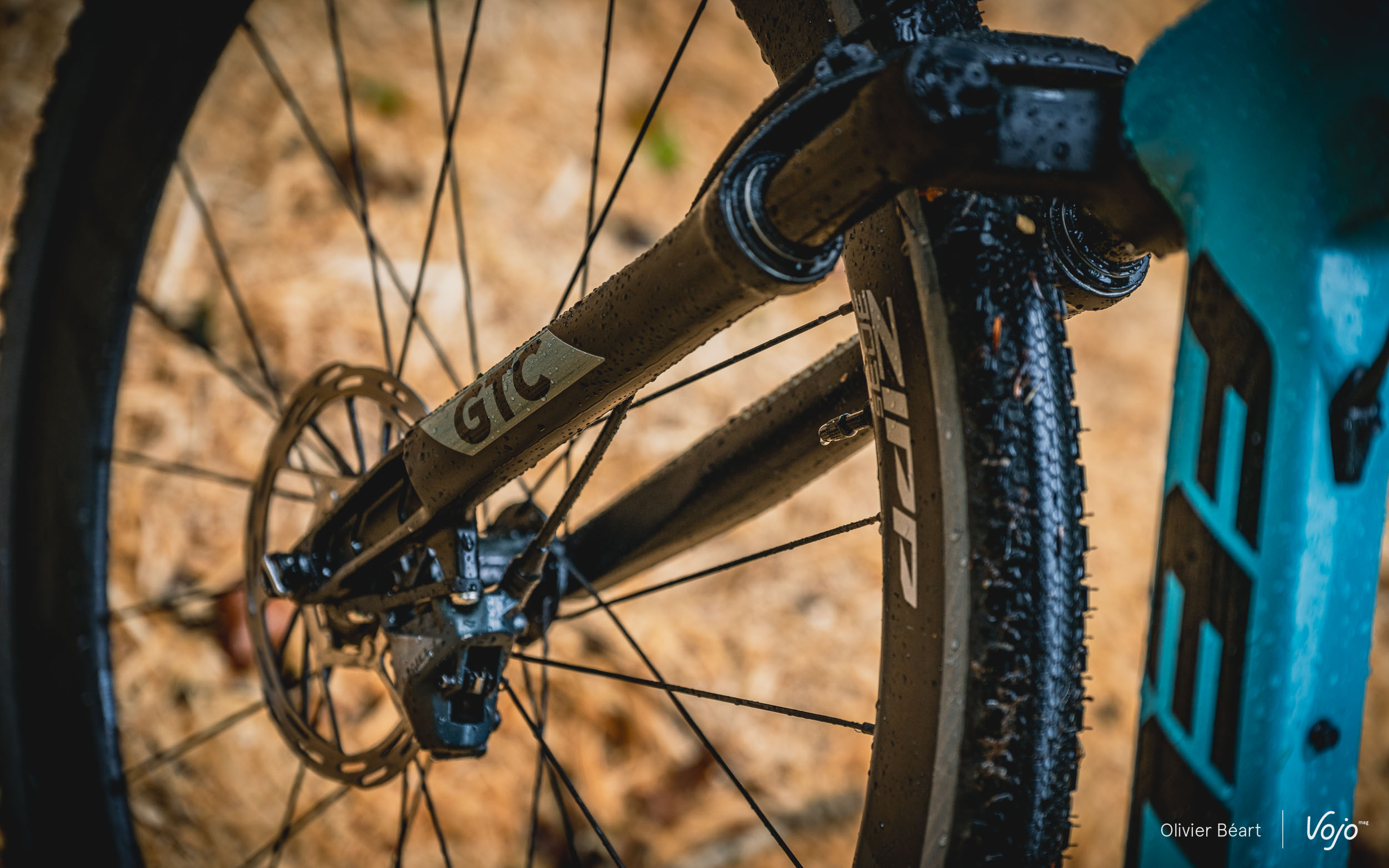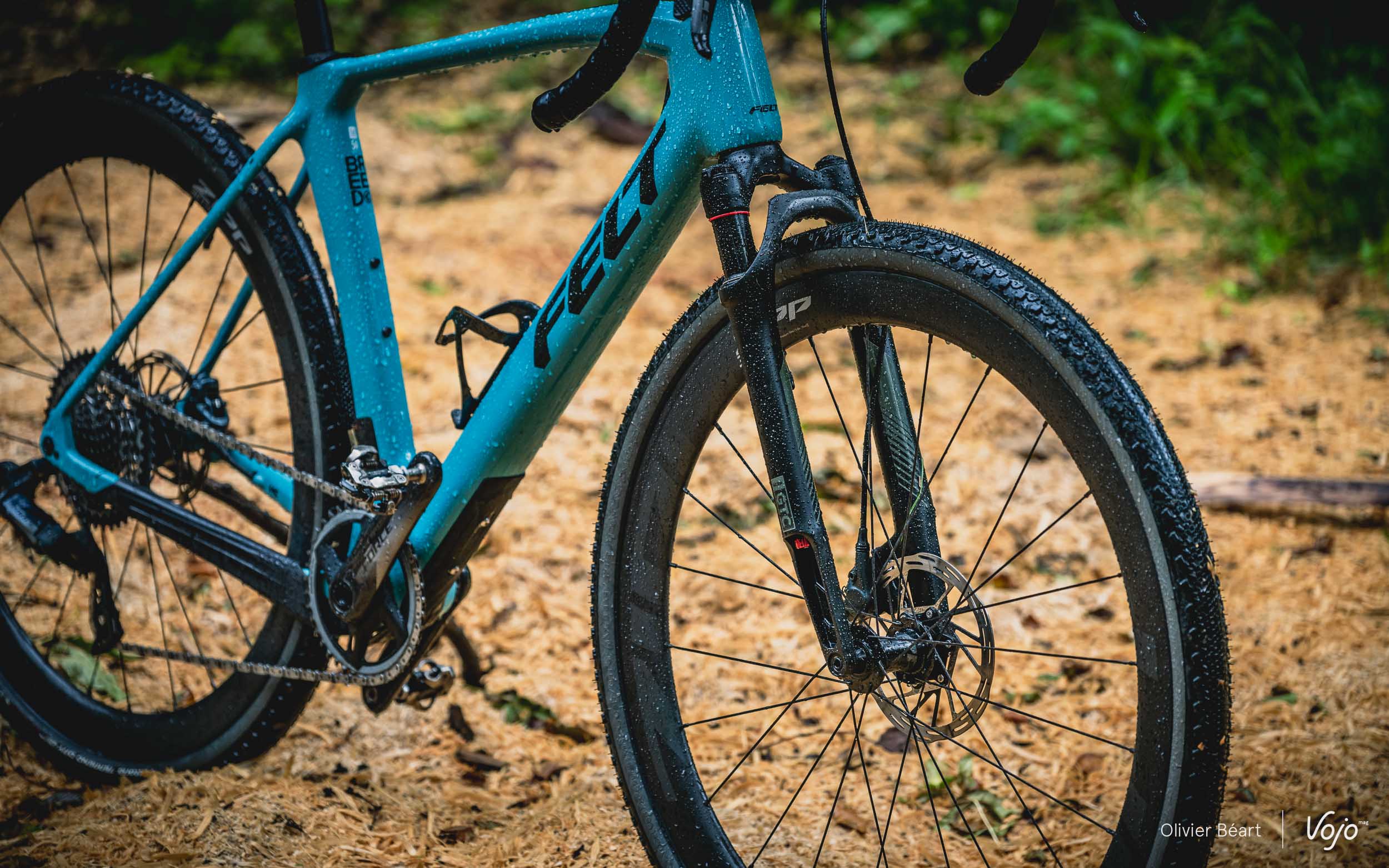 Bien sûr, on peut aussi envisager des pneus de plus forte section, mais les conséquences de ce choix sur le rendement et sur la manière de piloter le vélo ne sont pas non plus négligeables. Ici, la suspension permet aussi de conserver, comme sur notre vélo de test, des roues à jantes hautes et des pneus de section moyenne (42mm). Enfin, les pneus semblent moins sollicités et moins exposés aux crevaisons grâce à la fourche qui va aider à dissiper l’énergie des gros impacts.
