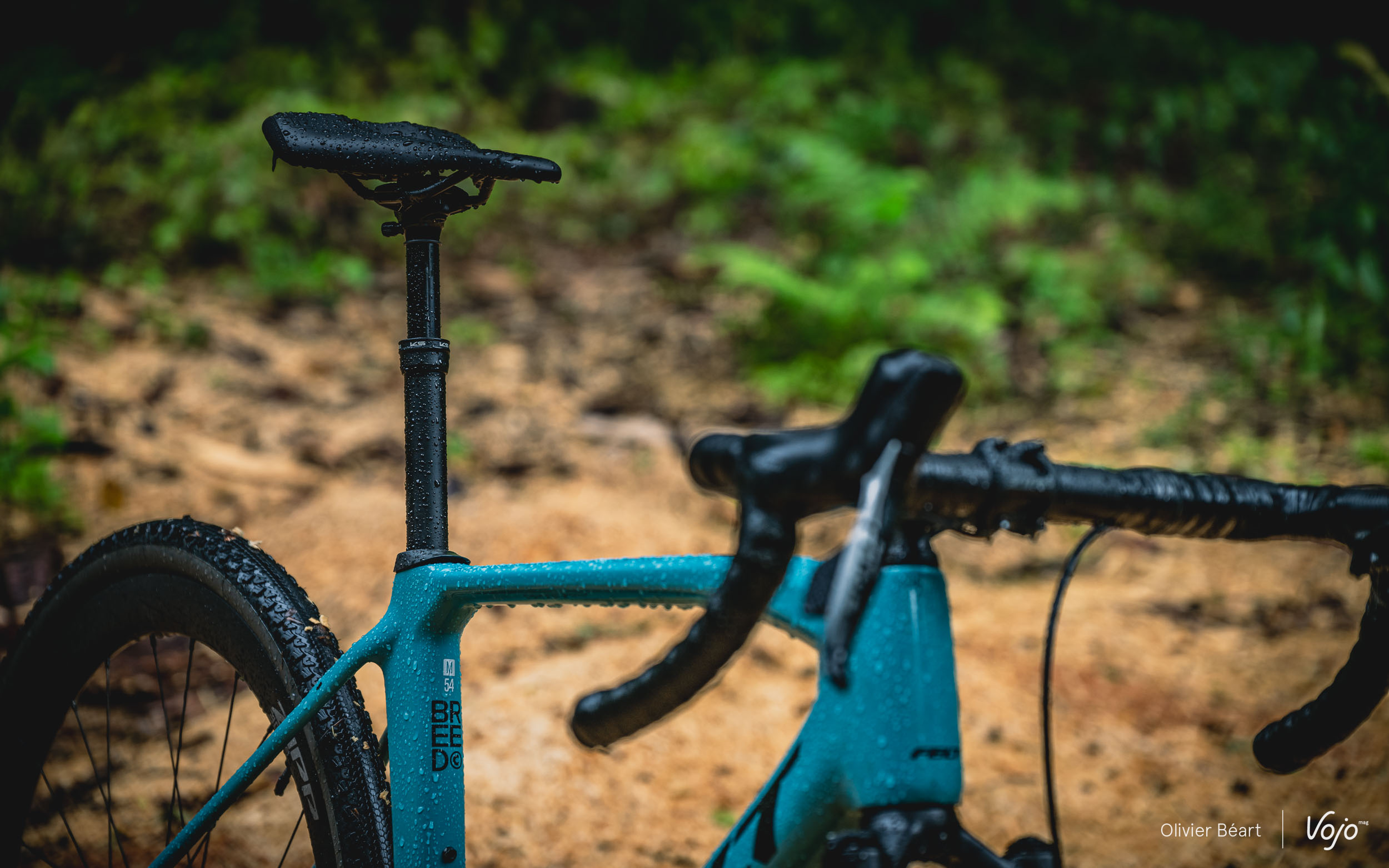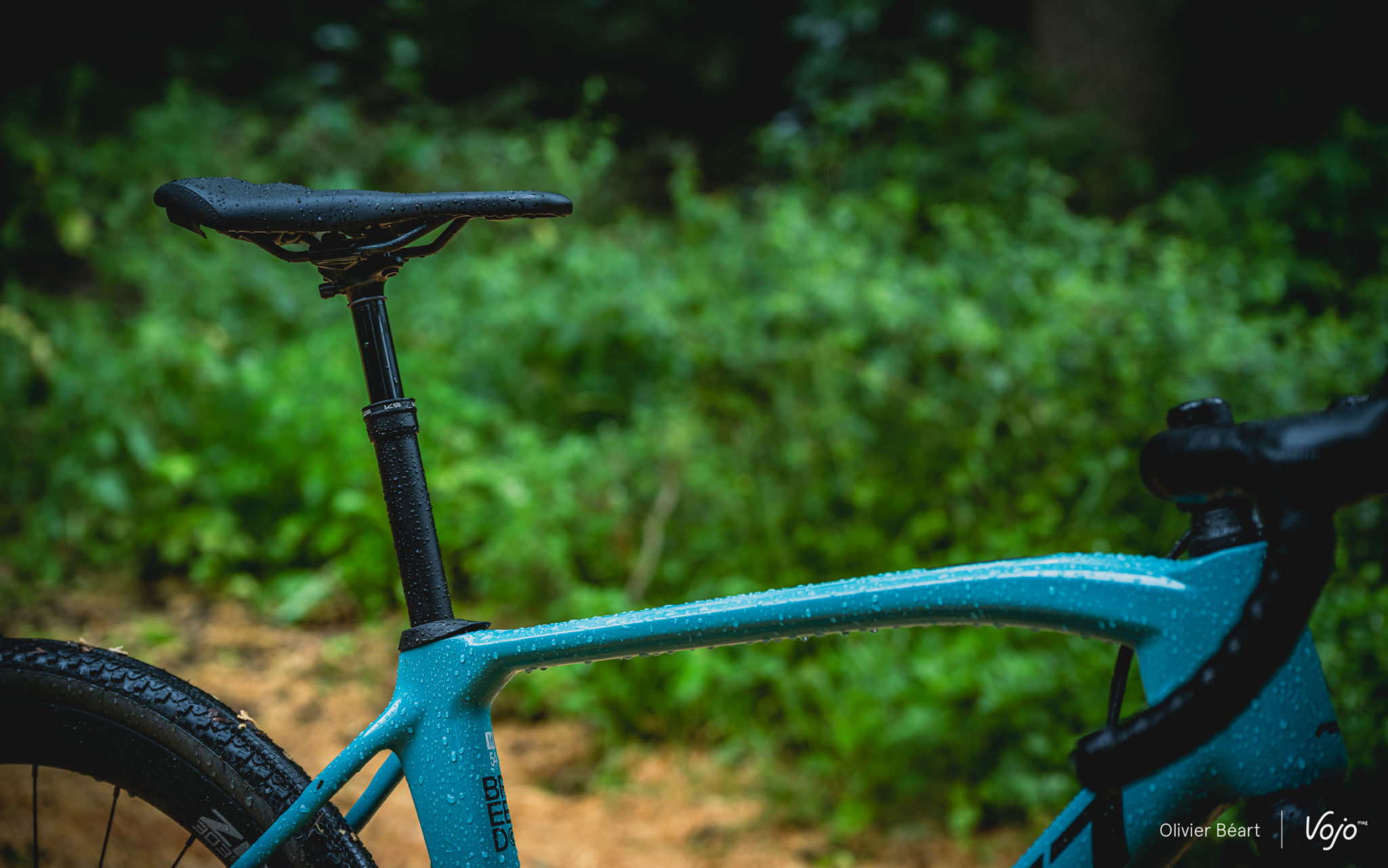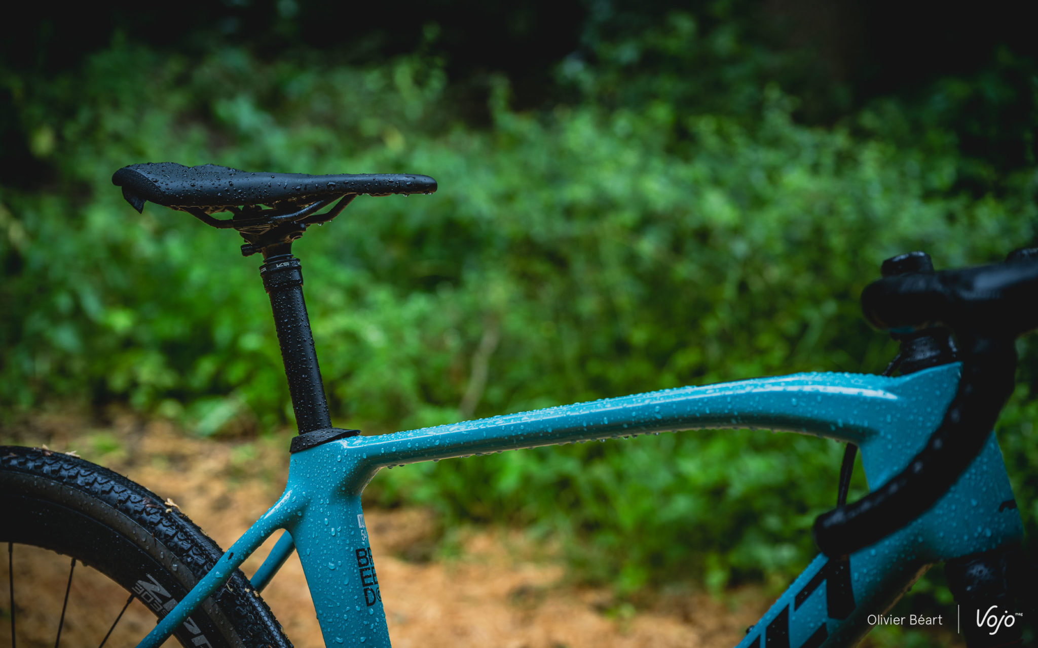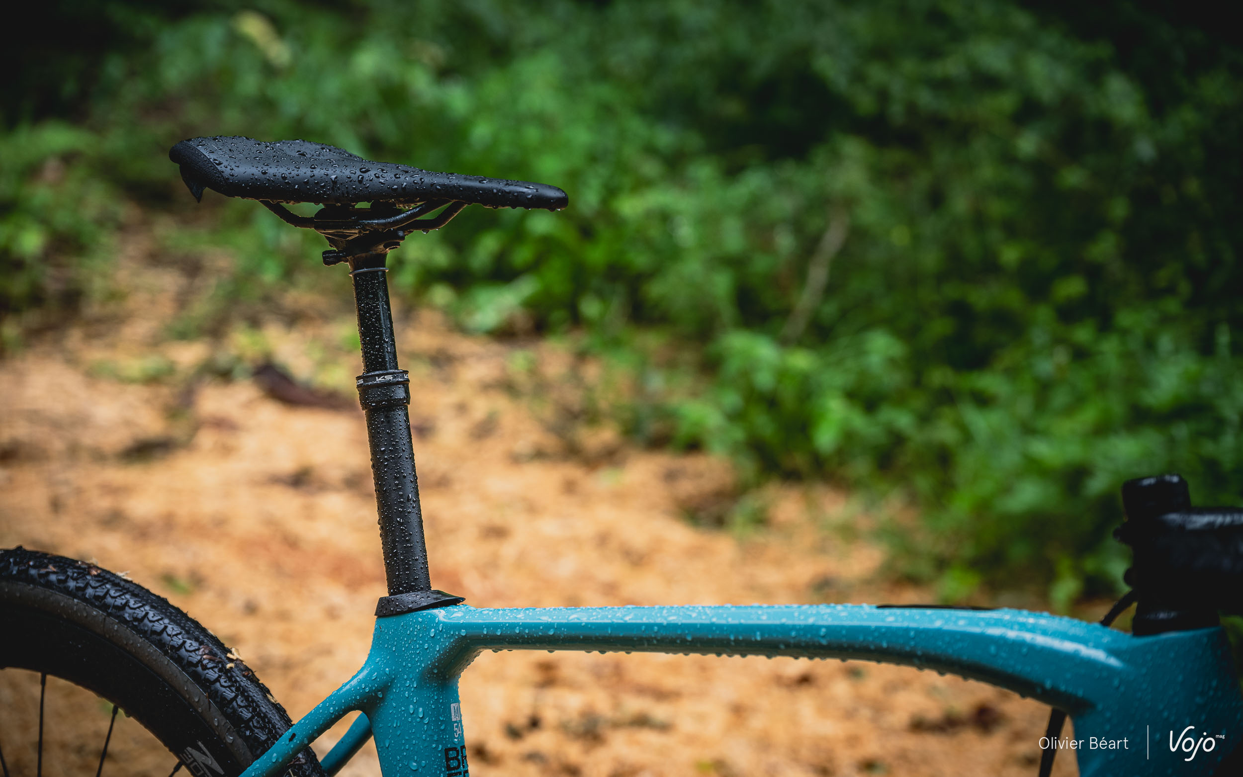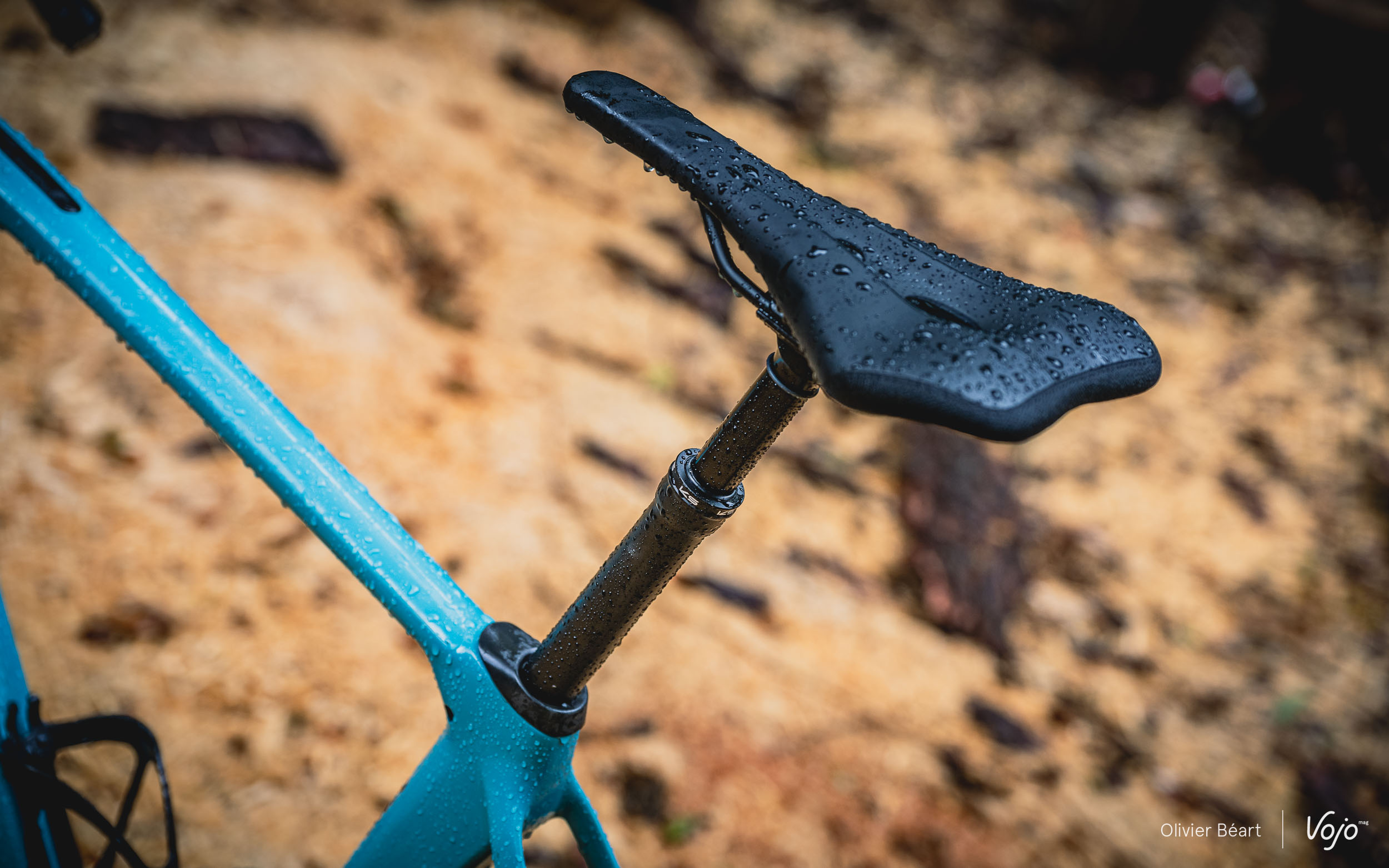 Plus encore que pour la fourche, nous étions très, très sceptiques quand à l’intérêt d’une tige de selle suspendue, même en gravel. En VTT, l’idée a été abandonnée depuis bien longtemps. Et pourtant, nous avons très rapidement perçu un réel intérêt en matière de confort… et même d’efficacité au pédalage sur des sols chahutés. Même pas besoin que ce soit très cassant : la tige de selle suspendue aide à éviter d’avoir sans arrêt les fesses qui sautillent sur la selle, et c’est vraiment appréciable.