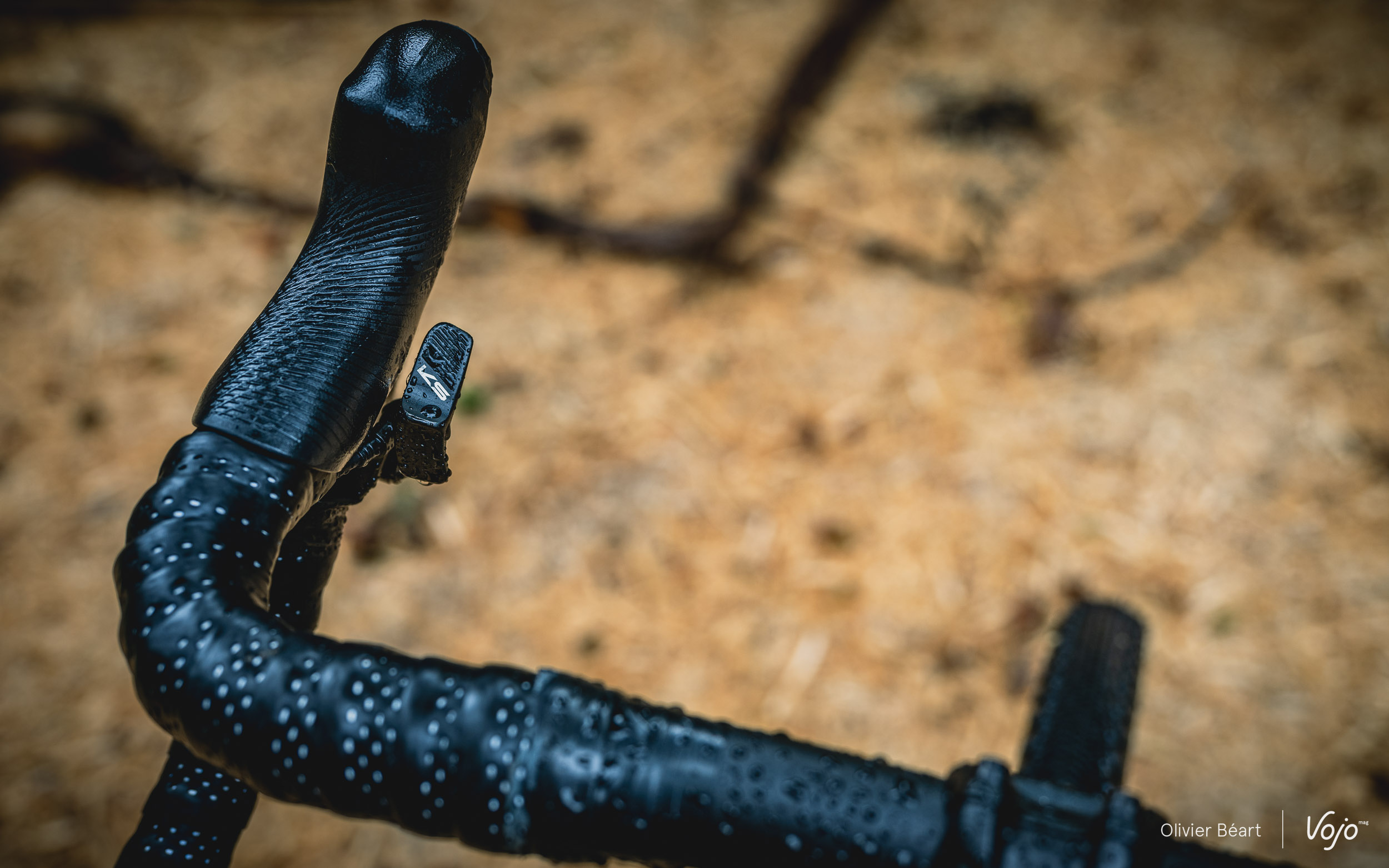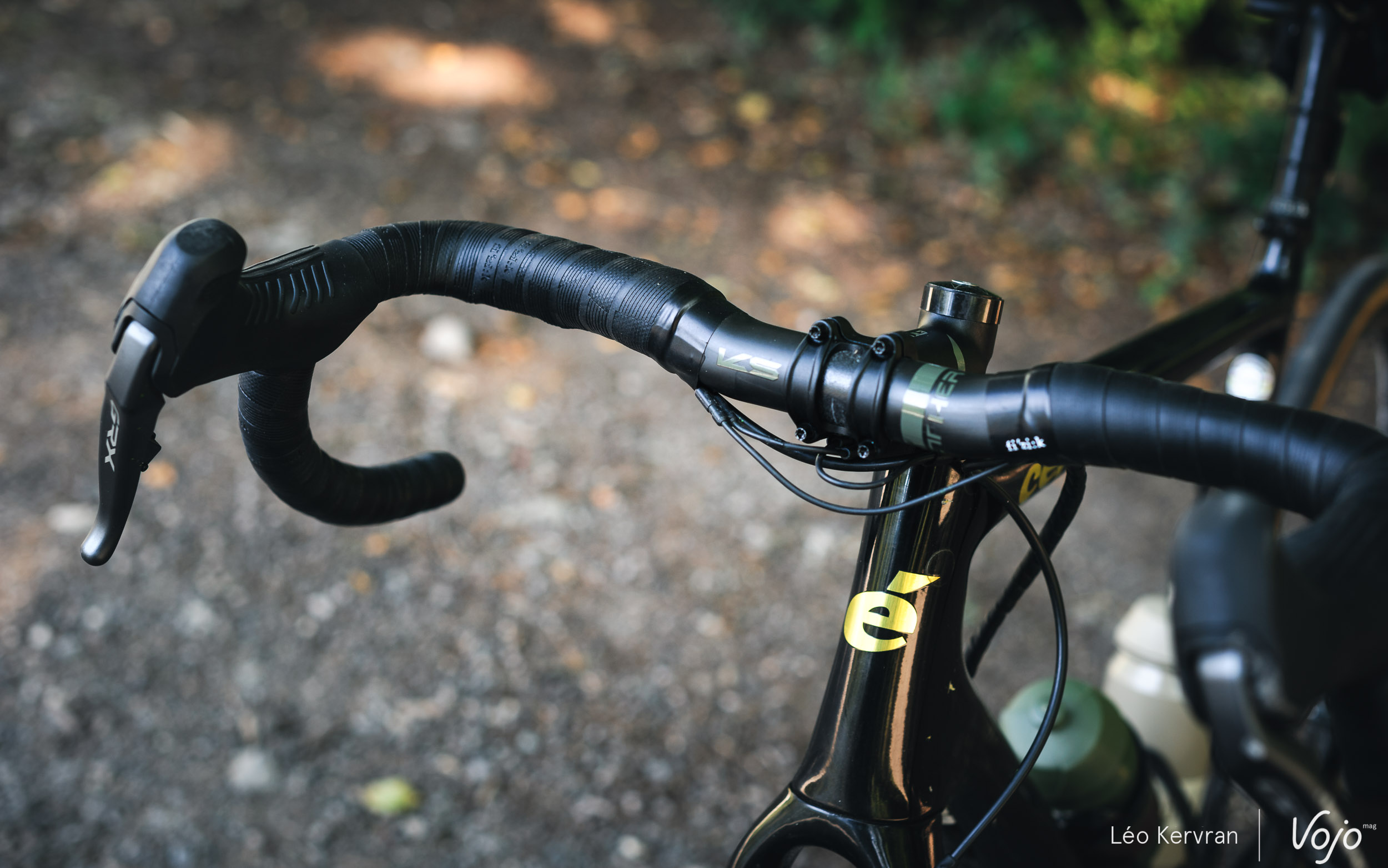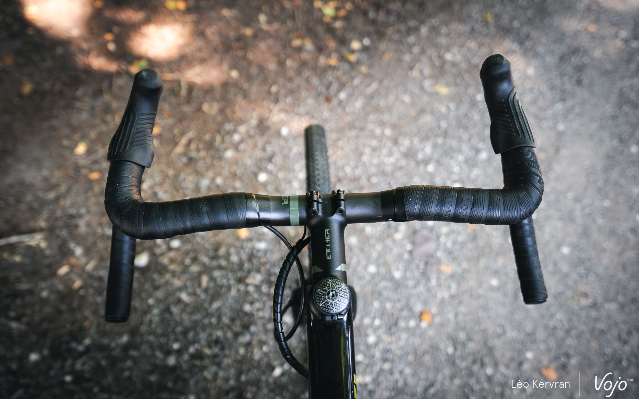 Même sans connaître toutes ses cotes, on remarque que l’Ether est plutôt du genre « compact », avec assez peu de profondeur et une hauteur modérée. Sans excès toutefois, on est loin des cintres gravel les plus extrêmes et ça ne devrait pas être trop déroutant pour quelqu’un qui viendrait de la route. C’est juste ce qu’il faut pour changer facilement de position (mains en haut / sur les cocottes / en bas) sans être déstabilisé à chaque fois.
