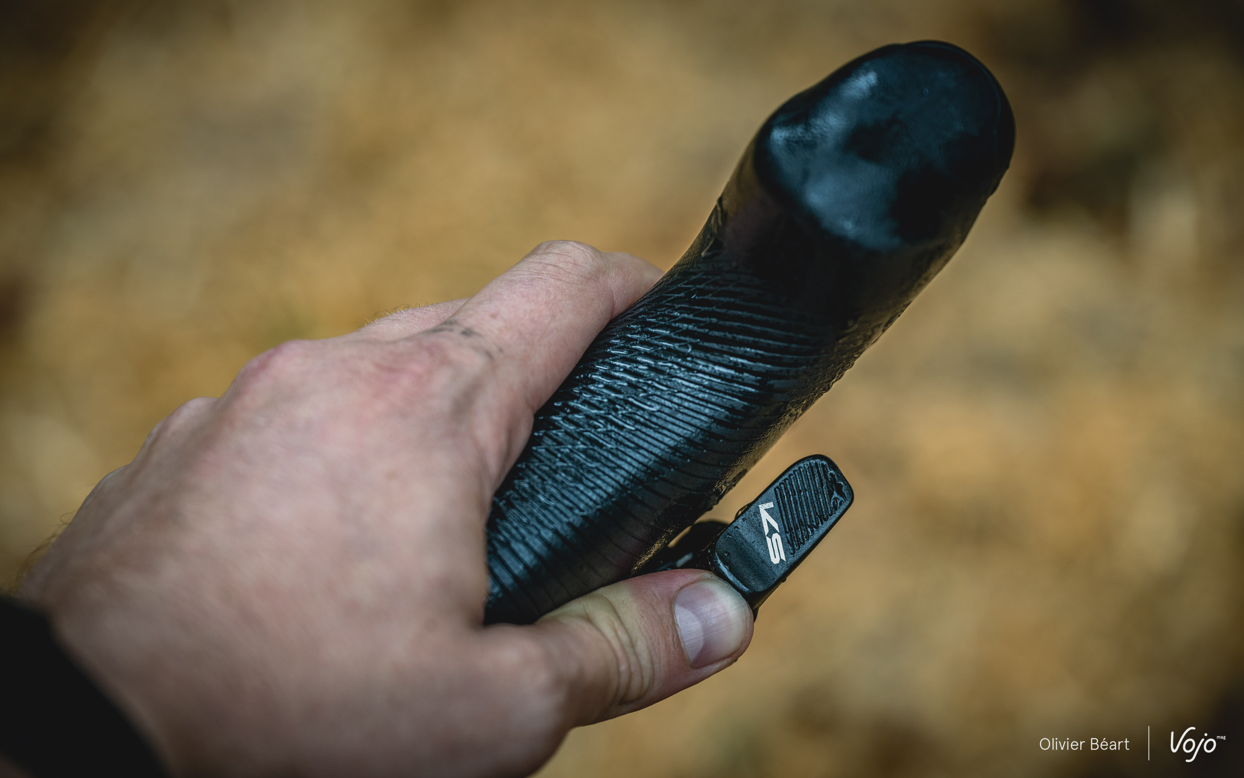 Pour ce qui est de la commande au guidon, KS a développé un modèle spécifique route/gravel qui se place jusque à côté de la cocotte de la commande gauche. Son installation demande un peu de minutie, mais au final il sait se montrer discret et nous verrons plus loin qu’il tombe bien sous la main.