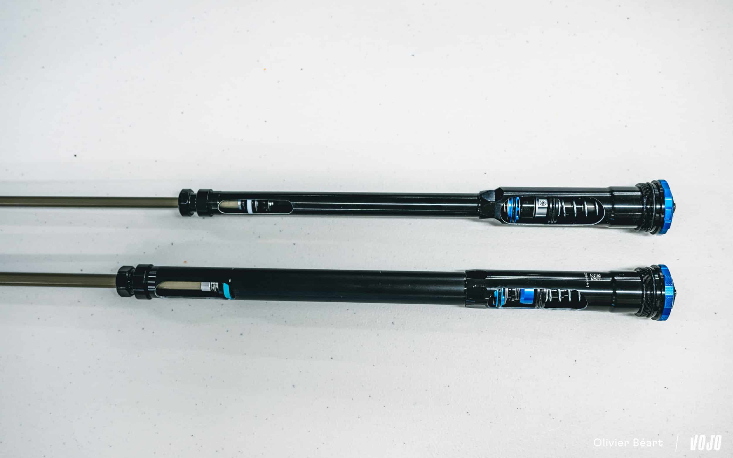 Nous ne vous parlerons pas ici de la cartouche Fox Grip SL (en bas sur l’image), que nous vous présentons dans cet article consacré à la toute nouvelle Fox 32SC qui dispose pour sa part d’un châssis complètement remanié avec un arceau inversé. Voir : Nouveauté | Fox 32 SC GRIP SL 2025 : un arceau inversé et bien plus encore !