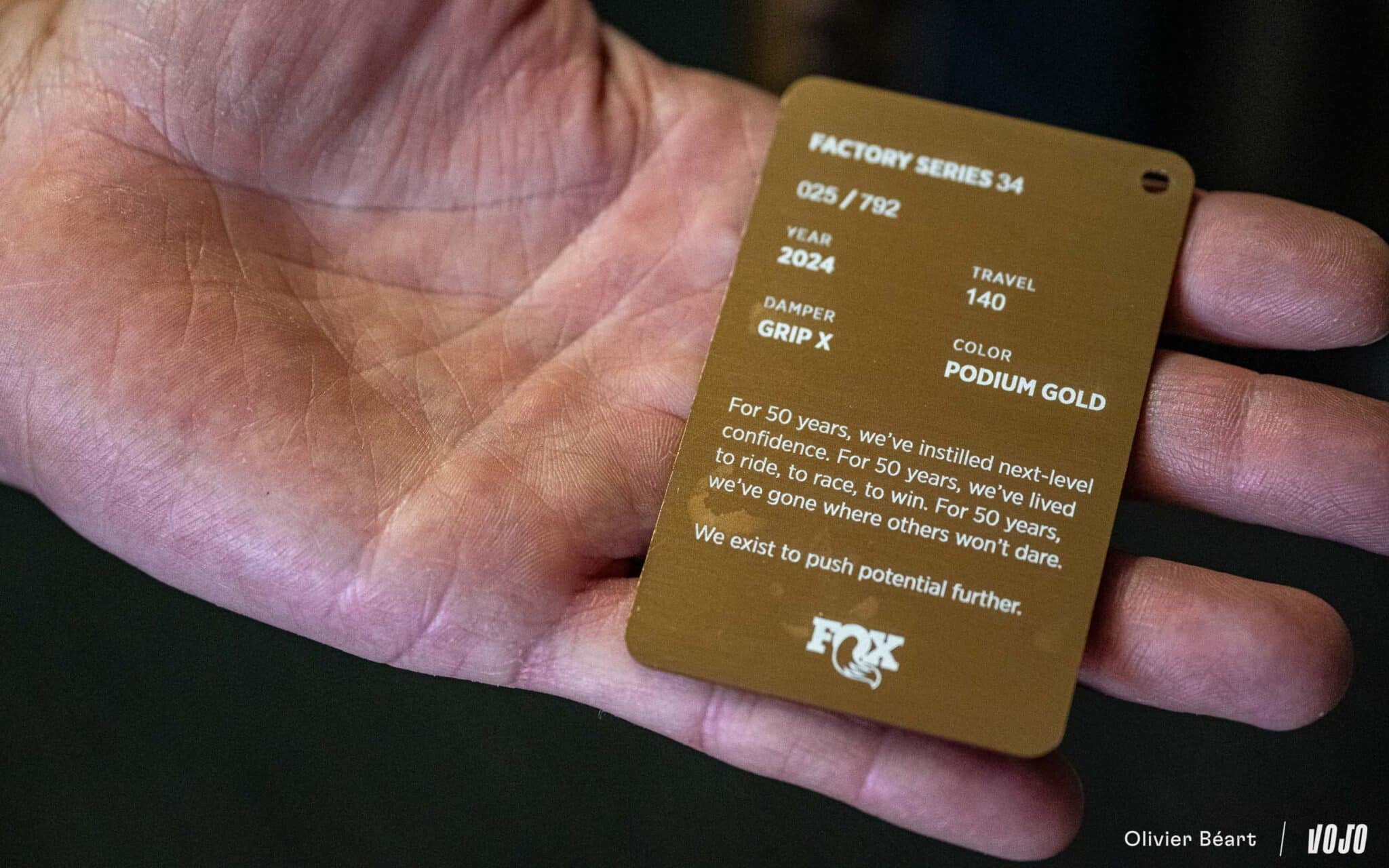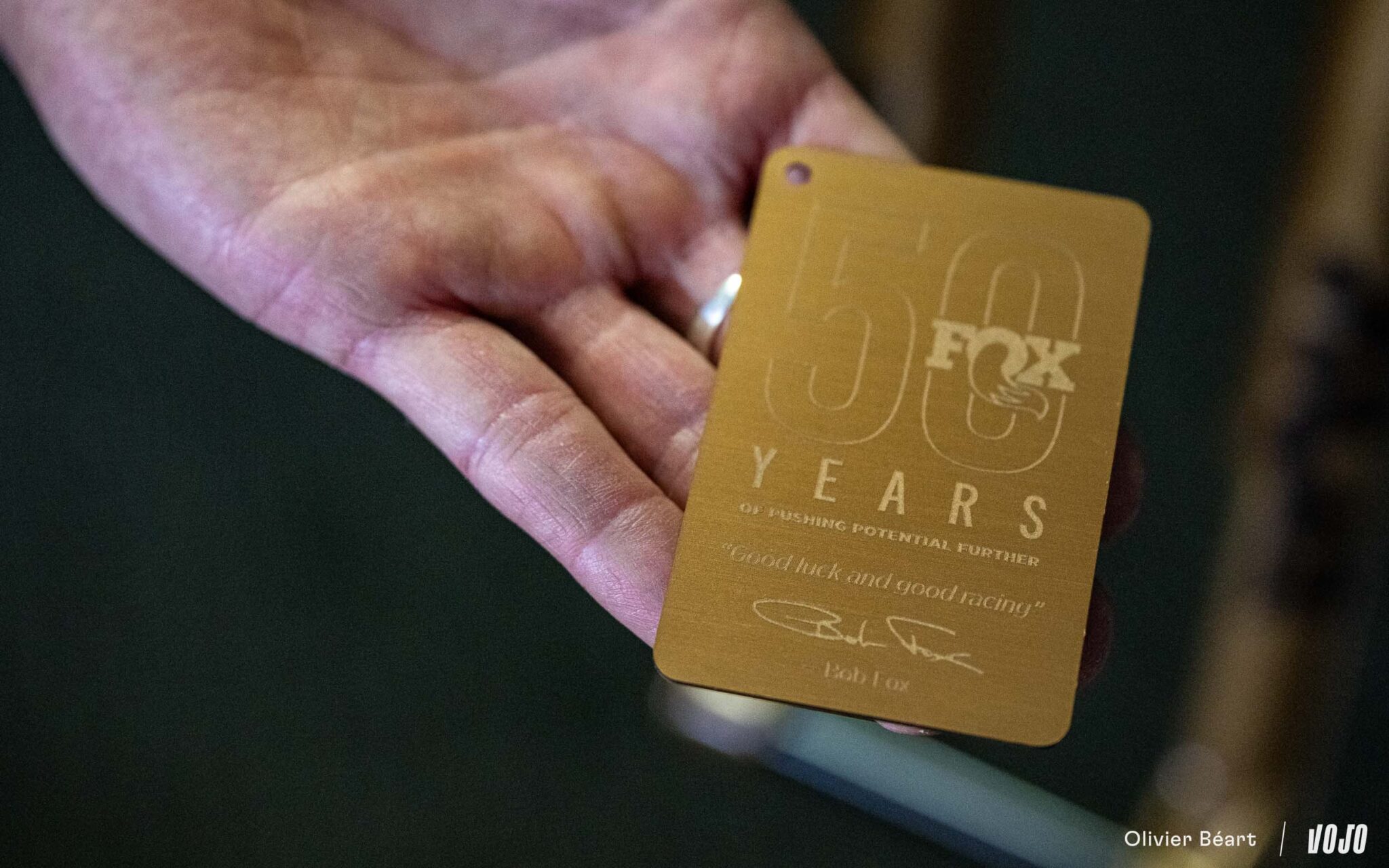 Cette couleur concerne simplement une série spéciale de fourches qui seront produites en édition limitée (entre 500 et un peu plus de 1000 fourches par modèle) pour commémorer les 50 ans de Fox Racing Shox, marque fondée en Californie par Bob Fox, un ingénieur passionné de moto qui a été à l’origine d’amortisseurs à air pour le cross, couronnés de nombreux succès. Par la suite, Fox s’est aussi intéressé au VTT et la marque est devenue un des poids lourds du secteur.