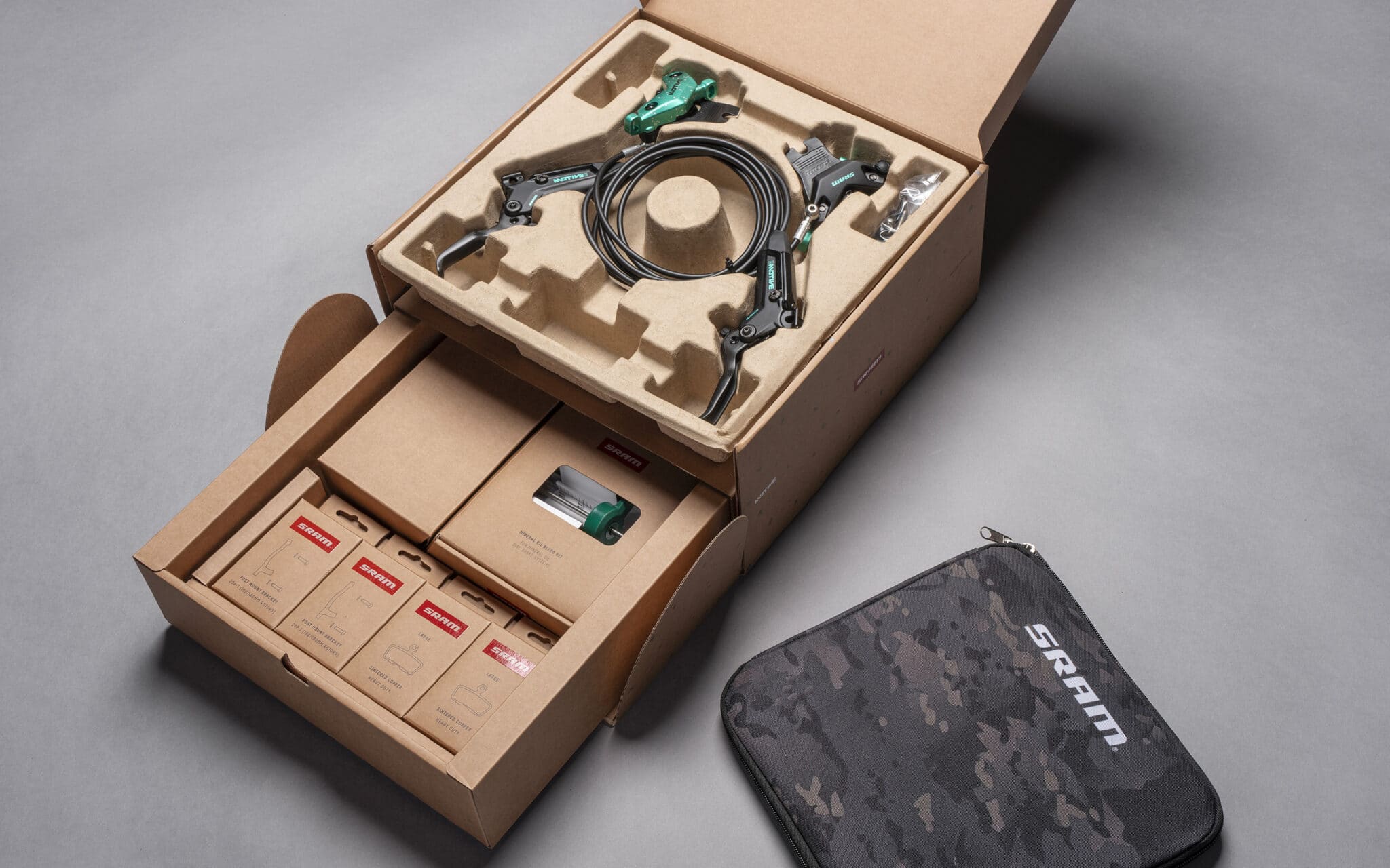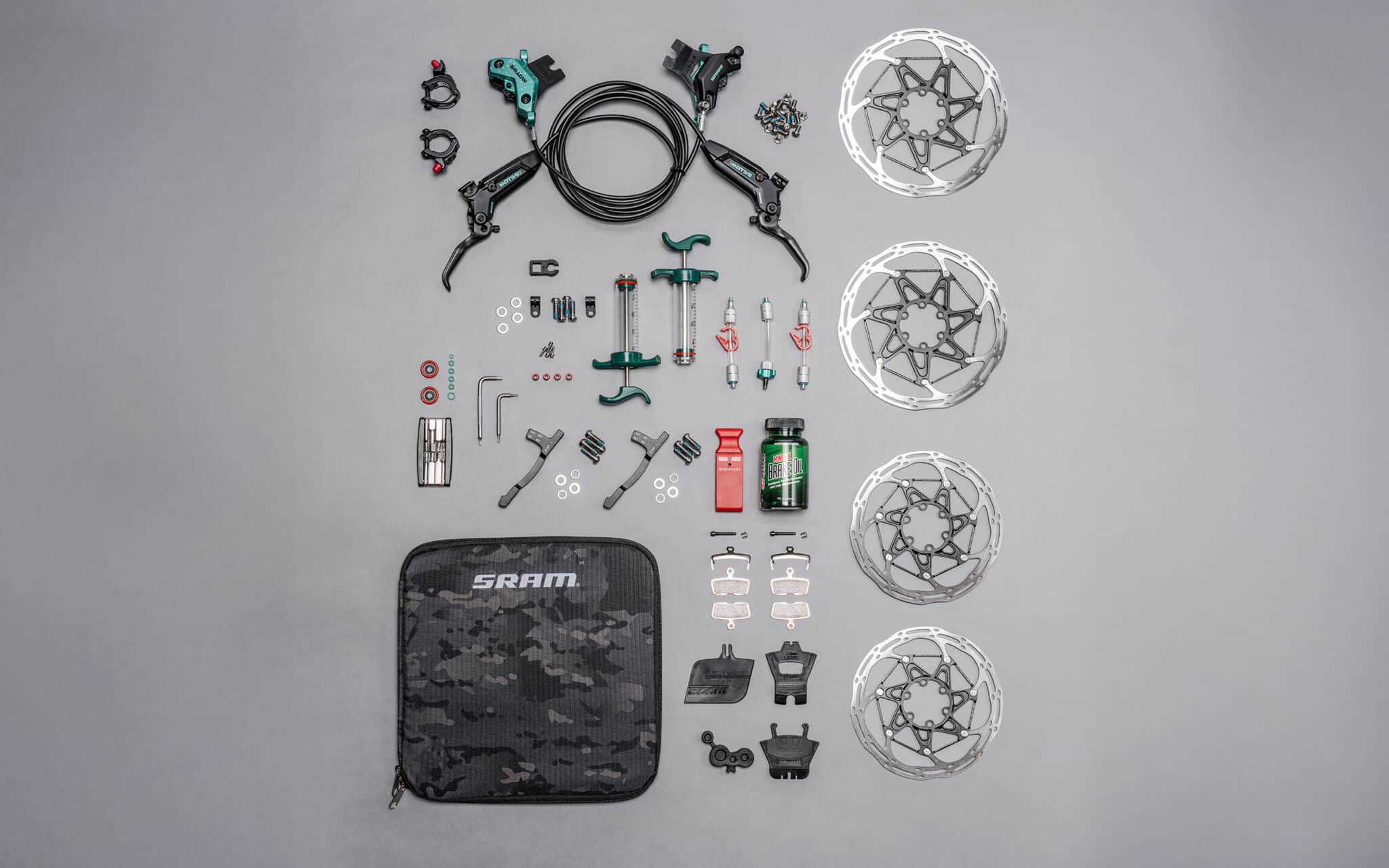 À l’occasion du lancement de ces Motive, Sram propose une version spéciale au coloris signature, comme elle l’avait déjà fait pour les Maven l’année dernière. Ce « Expert-kit » comprend une paire de freins Ultimate, une paire de plaquettes et de disques, ainsi qu’un kit de purge. Il est commercialisé en quantité limitée à 655 €.