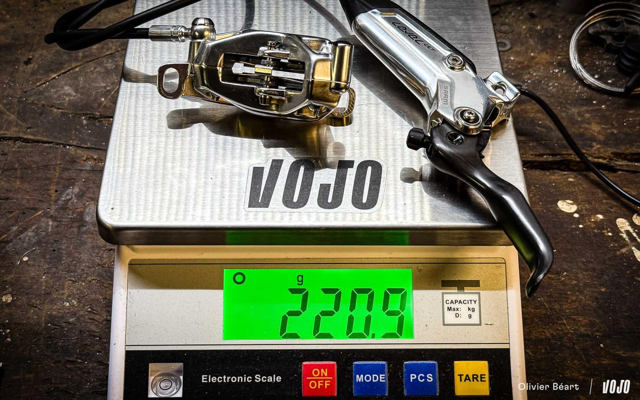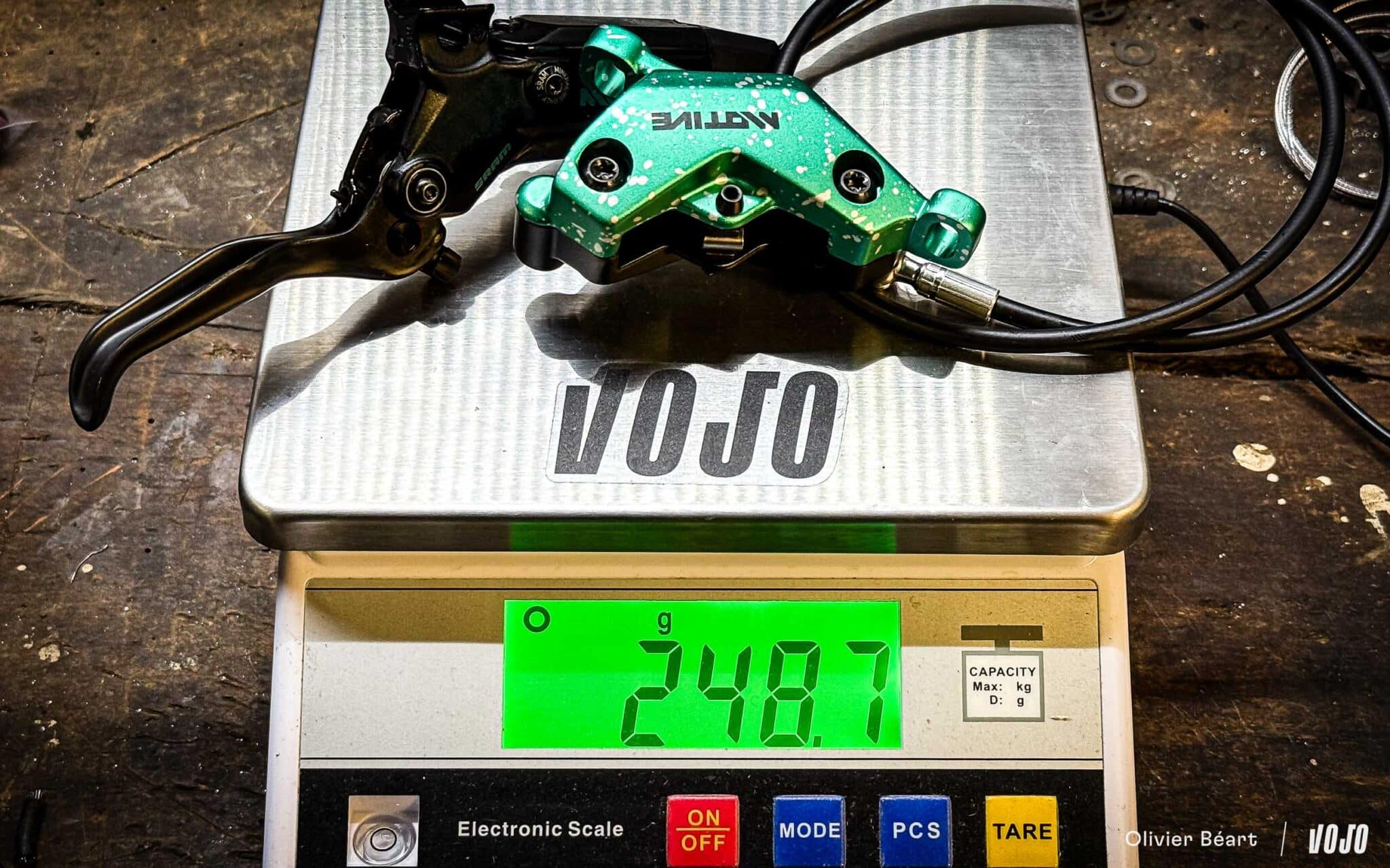 A titre de comparaison, on rappellera qu’un ensemble avant Shimano XTR 4 pistons (9120) tourne autour des 240 g et un XTR à 2 pistons est juste sous les 200 g, comme les premiers freins Level ULT 2 pistons que nous avions pesés autour de 200 g également. Par contre, par rapport aux Code qui pèsent autour de 290 g pièce, on est bien en dessous avec ces nouveaux Motive, alors qu’ils sont annoncés comme offrant une puissance comparable. Bref, ces nouveaux Sram Motive affichent un poids en phase avec d’autres freins à 4 pistons légers du marché, mais on est clairement au-dessus de ce à quoi on a l’habitude en XC avec des étriers 2 pistons. D’où, probablement, la volonté de Sram de ne pas présenter les Motive comme des freins purement XC, mais comme un modèle puissant et polyvalent destiné aux vélos à petit/moyen débattement.