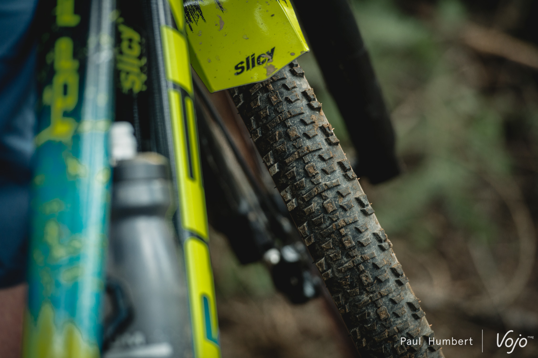 On remarque au passage que le pneu n’est disponible qu’en 2,3″, une section réservée à la descente et l’enduro il y a encore quelques années. Ici aussi, cela vient des athlètes du team MMR mais ils ne sont pas les seuls et Nino Schurter roule lui en 2,4″. C’est d’ailleurs une tendance générale dans toutes les disciplines du vélo : les sections se décalent vers le haut. En route, on est passé du 23 mm au 25 voire 28 mm, le gravel qu’on croyait stabilisé autour de 40-42 mm monte maintenant jusqu’à 50 mm, les 2,6″ sont désormais monnaie courante sur les vélos de 140 mm de débattement et plus…