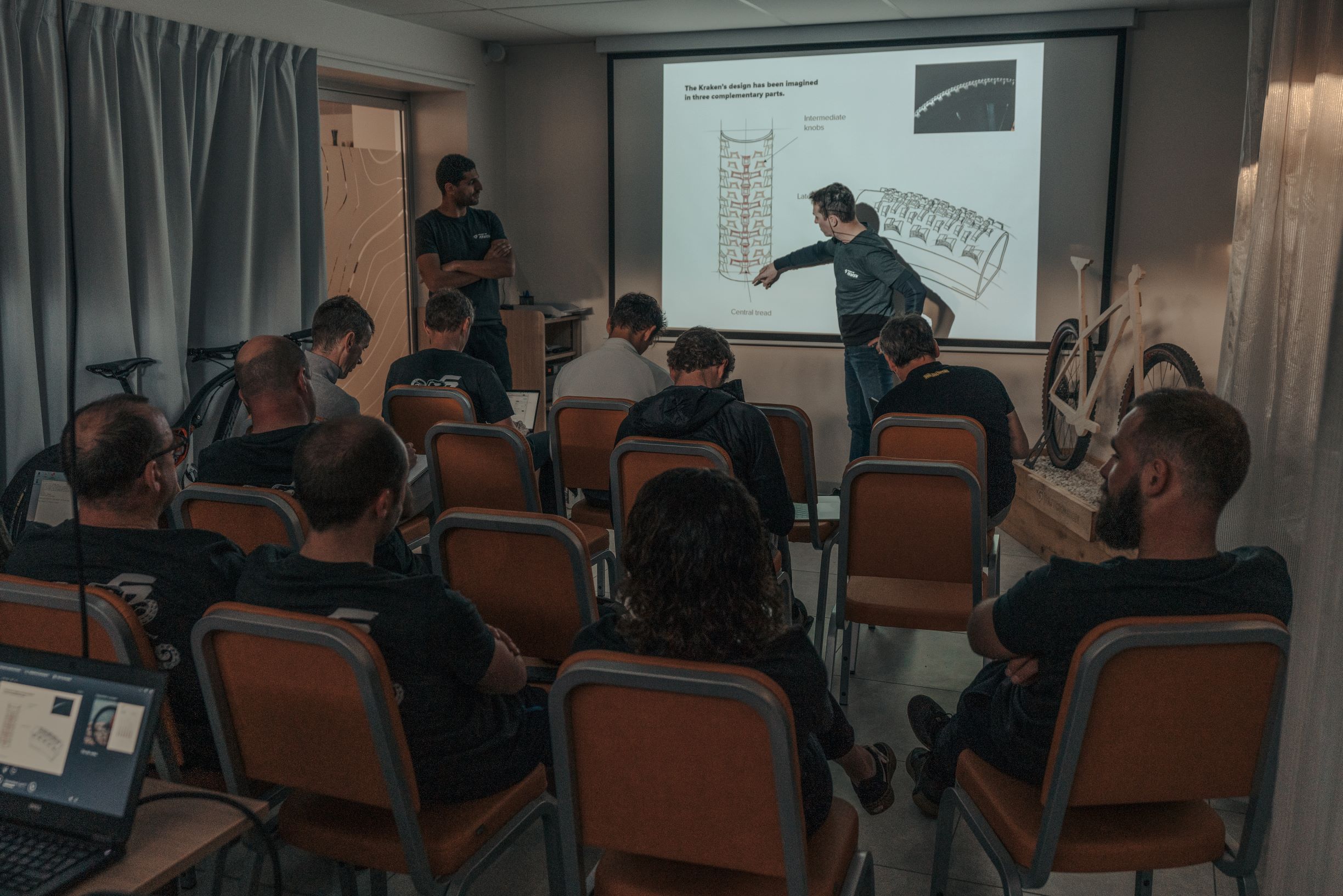 Le Kraken était une demande de l’équipe espagnole MMR Factory Racing au sein de laquelle on retrouve notamment David Valero, champion d’Espagne en titre et qui compte plusieurs podiums en coupe du Monde à son actif. On l’avait d’ailleurs aperçu l’année dernière sur certains vélos dans les paddocks de coupe du monde, comme en témoigne la photo ci-dessus. Les pilotes, qui roulent habituellement avec le Skeleton, souhaitaient un pneu avant plus fiable que le Cobra qu’ils utilisaient parfois. 3 points clés ont été identifiés : le nouveau pneu devait offrir plus de sécurité au freinage et dans les virages, un plus gros ballon et une construction plus souple.