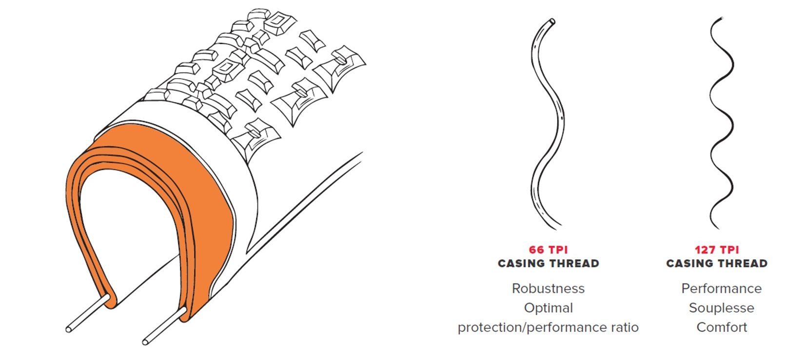 Pour comprendre ce qui les différencie, petit retour sur la construction d’un pneu. La carcasse est composée à partir d’un textile fait de fils synthétiques. Les tpi, c’est le nombre de fils par pouce carré de carcasse, soit 2,54 cm² (thread per inch). Plus ce nombre est élevé, plus il y a de fils et donc plus ces fils sont fins, ce qui confère une très grande souplesse à la carcasse. En revanche, elle sera un peu moins solide qu’un pneu avec moins de fils, puisque ces derniers seront alors plus gros et plus résistants (mais aussi plus lourds).