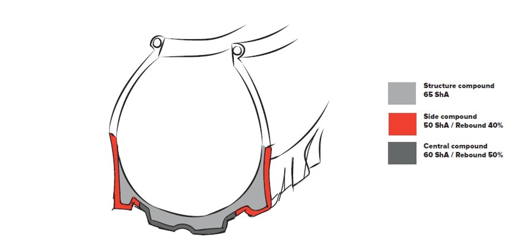 Côté caoutchouc, on retrouve un mélange de 3 gommes pour offrir à la fois une bonne résistance au roulement et une adhérence satisfaisante. Le Kraken Racing Lab est ainsi composé d’une gomme dure de structure en profondeur (65 ShA), d’une gomme souple en surface sur les crampons latéraux (50 ShA) et d’une gomme à mi-chemin entre les deux pour la bande de roulement (60 ShA).