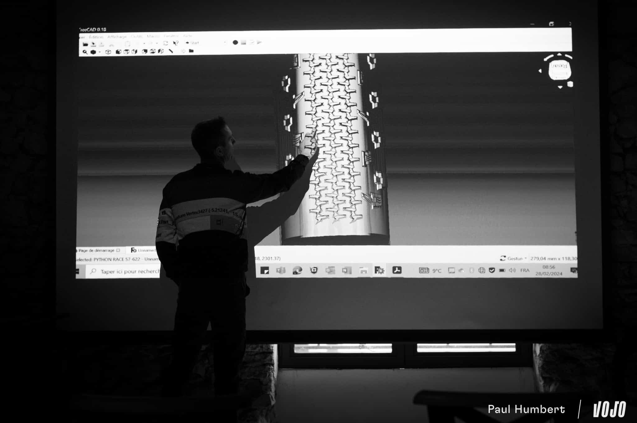 Derrière notre « spyshot » des Gets se cachait une seconde histoire. Dès le ballon du Python 3 validé par les athlètes, une seconde demande émergeait : celle d’avoir un pneu encore plus radical, exclusif et compétitif. Joël continue : « Les pilotes me demandaient de simples pointes de diamant pour la bande centrale, un pneu extrême, sans compromis. » L’idée du Python Race venait de germer sous la tente de l’équipe Decathlon-Ford.