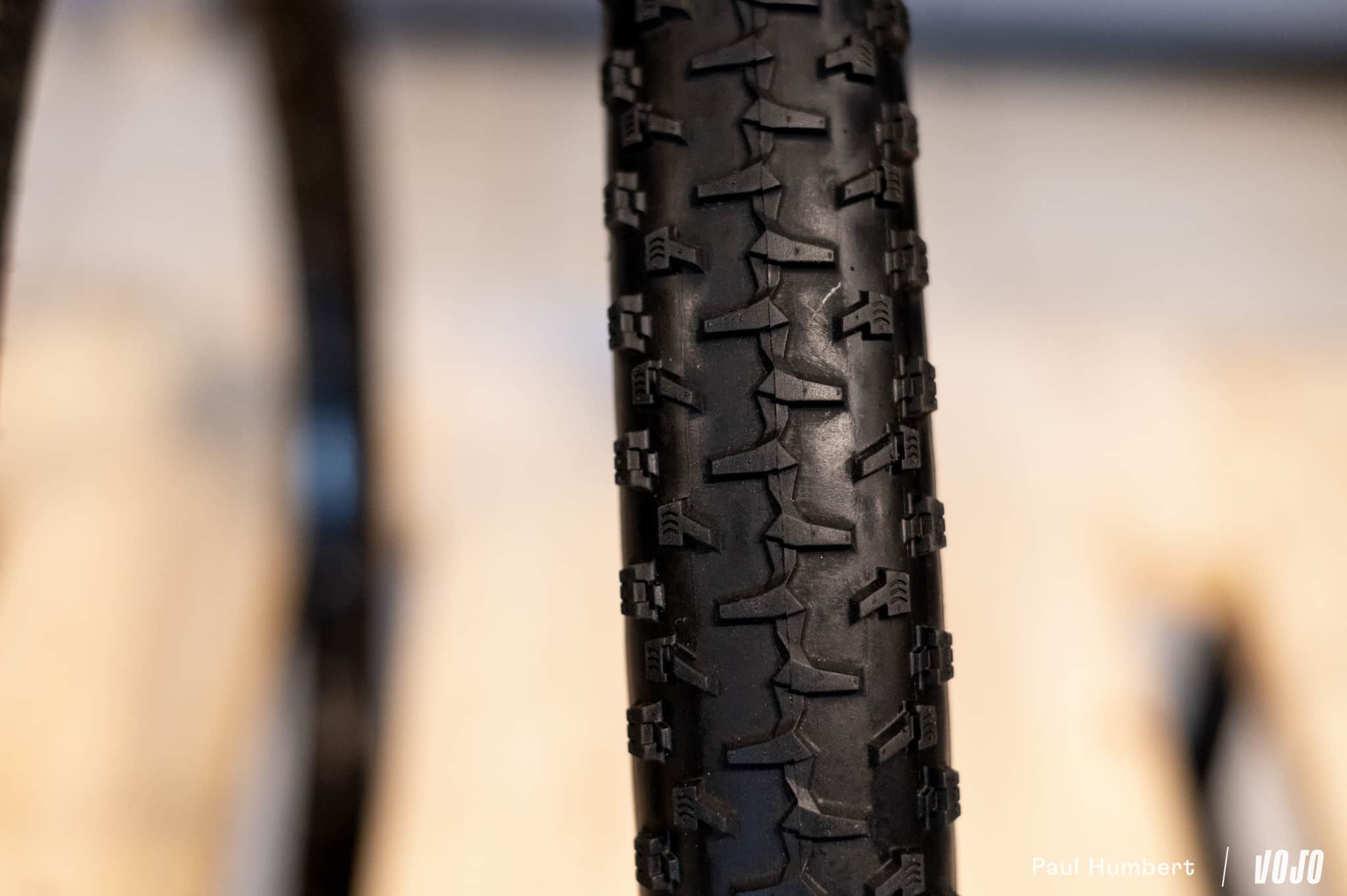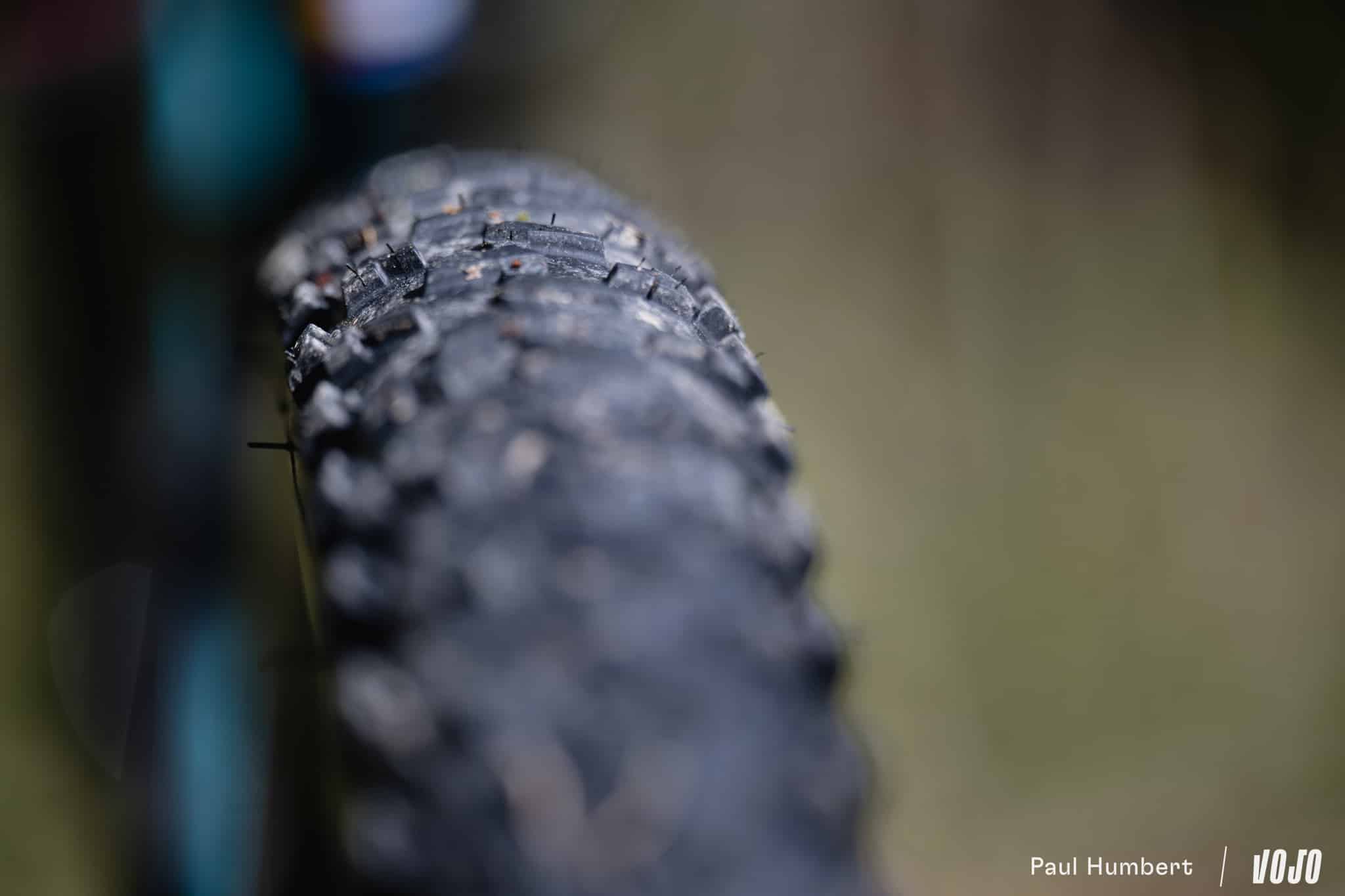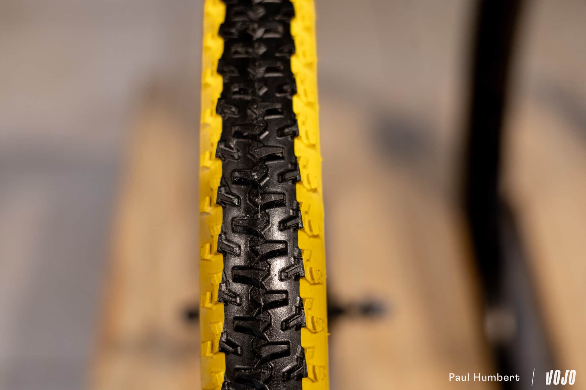 La marque a fait le choix de conserver la bande de roulement iconique tout en augmentant l’espace et la taille des crampons centraux, offrant ainsi une plus grande surface d’accroche et de freinage. En plus du freinage, la traction devrait ainsi être augmentée, tout en offrant un meilleur débourrage. Pour Joël, au delà de la marque de fabrique, la force des crampons centraux, « c’est qu’ils permettent une continuité de la bande de roulement. C’est une colonne vertébrale et on n’a pas besoin de monter ou de descendre de chaque pavé. »