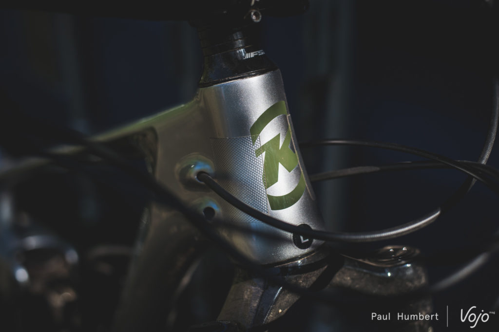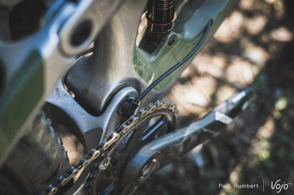 Le passage des câbles et gaines est soigné avec des guides en interne qui permettent un entretien sans prise de tête. Les câbles sortent à la fin du triangle avant et son guidés jusqu’au dérailleur et au frein arrière en externe. On retrouve un petit guide positionné sur le point de pivot principal, qui permet de maintenir la gaine en place pendant le travail de la suspension. On remarque également que des entrées sont positionnées des deux côtés du cadre afin de satisfaire tous les goûts en ce qui concerne les freins (et notamment nos voisins anglais qui roulent majoritairement avec le frein arrière à gauche du guidon).