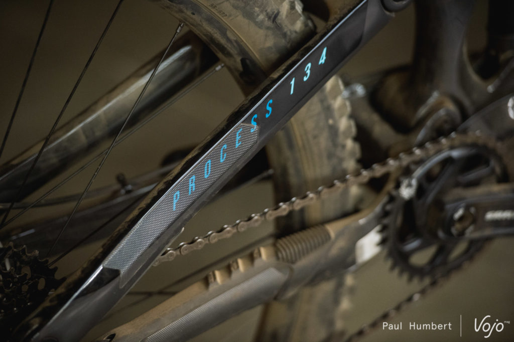 Un véritable soin a été apporté à la construction de ce Process 134 dont les lignes sont particulièrement harmonieuses. Aussi bête que cela puisse paraître, il était important qu’un bidon puisse trouver sa place sur ce cadre, et c’est chose faite. Le vélo est protégé sous le tube inférieur et est équipé d’un protège-base spécifique au vélo.